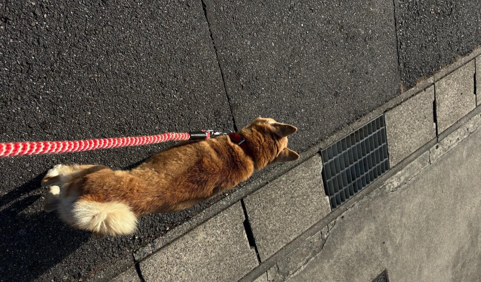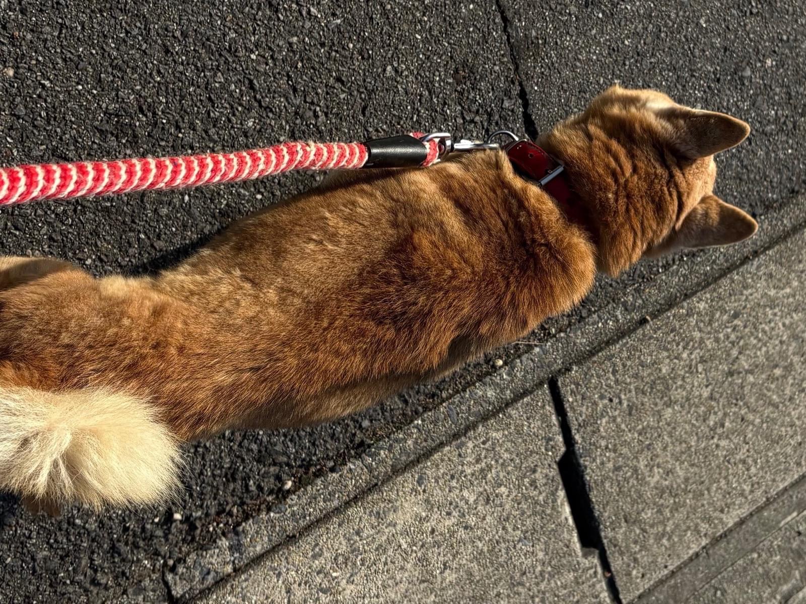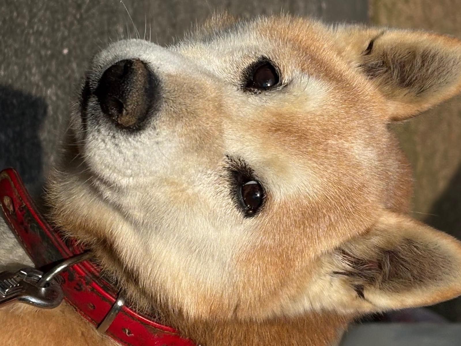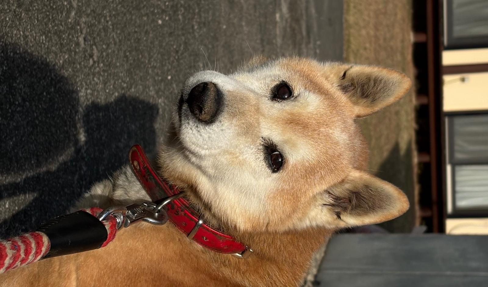 赤い首輪をしたオスの赤茶の柴犬