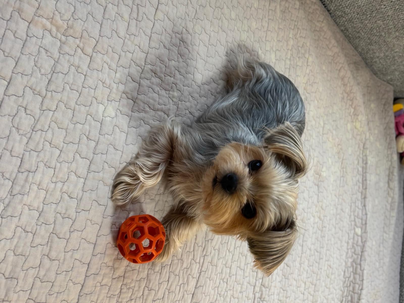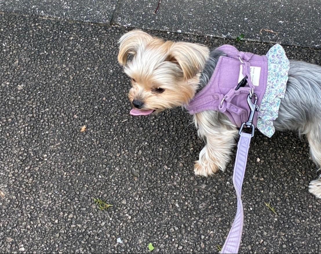紫色のハーネスをした、2歳メスのヨークシャテリアを探しています。