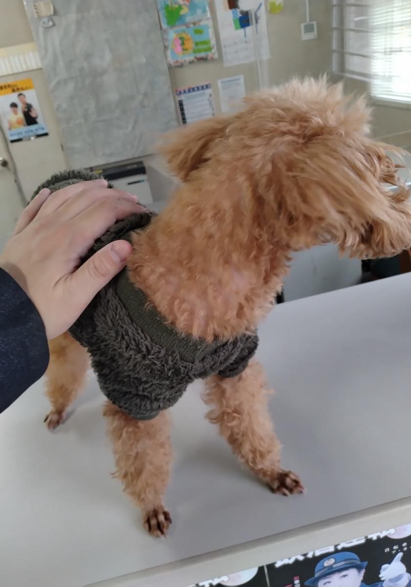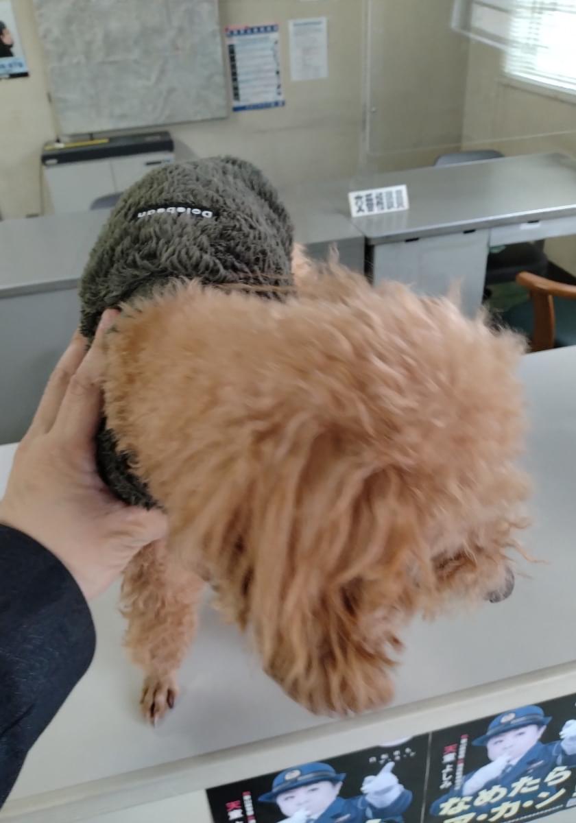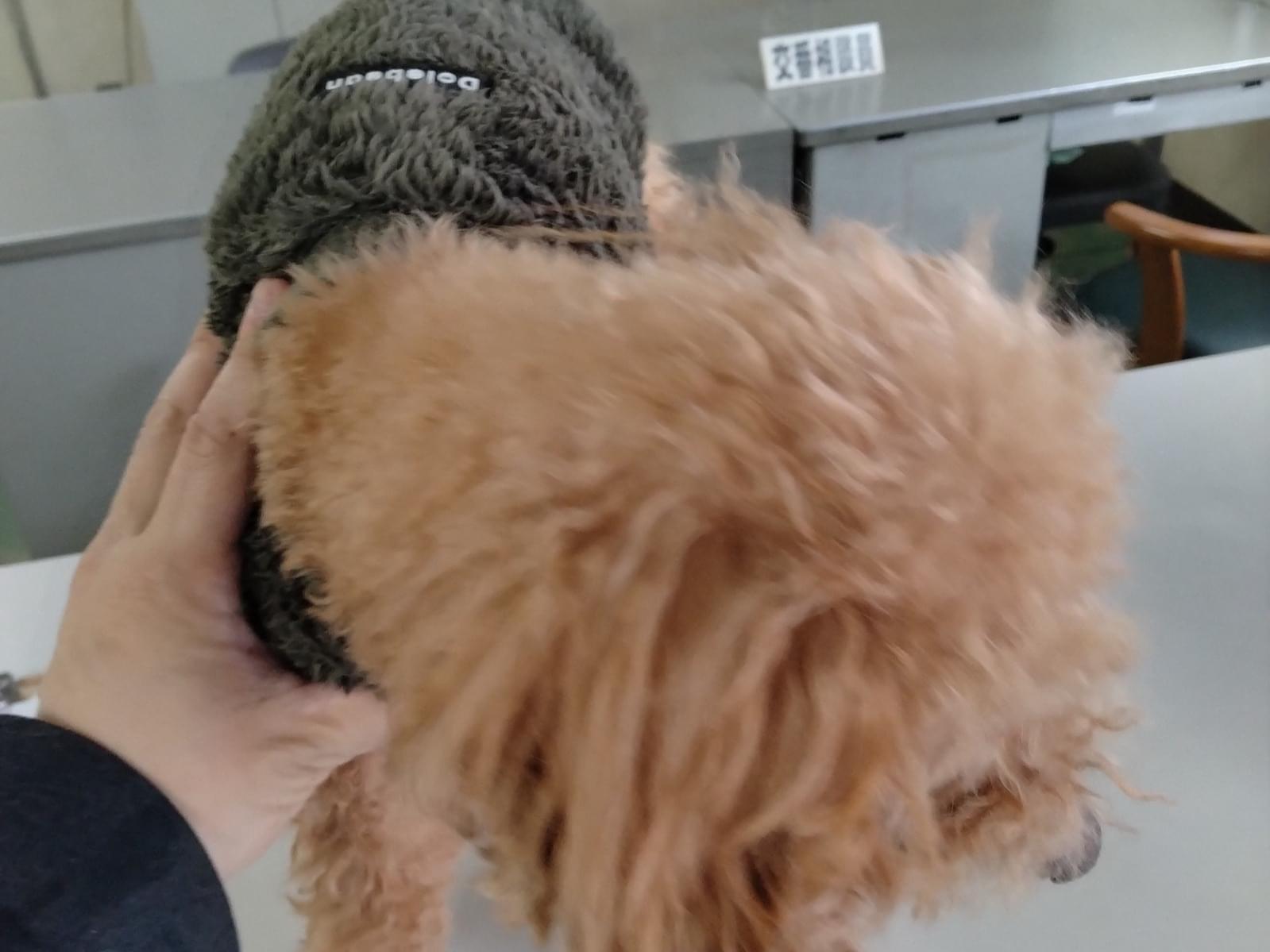 茶色のトイプードル。首輪無いが、「Dolebean」というロゴの書かれたカーキ色の服を着ていた。