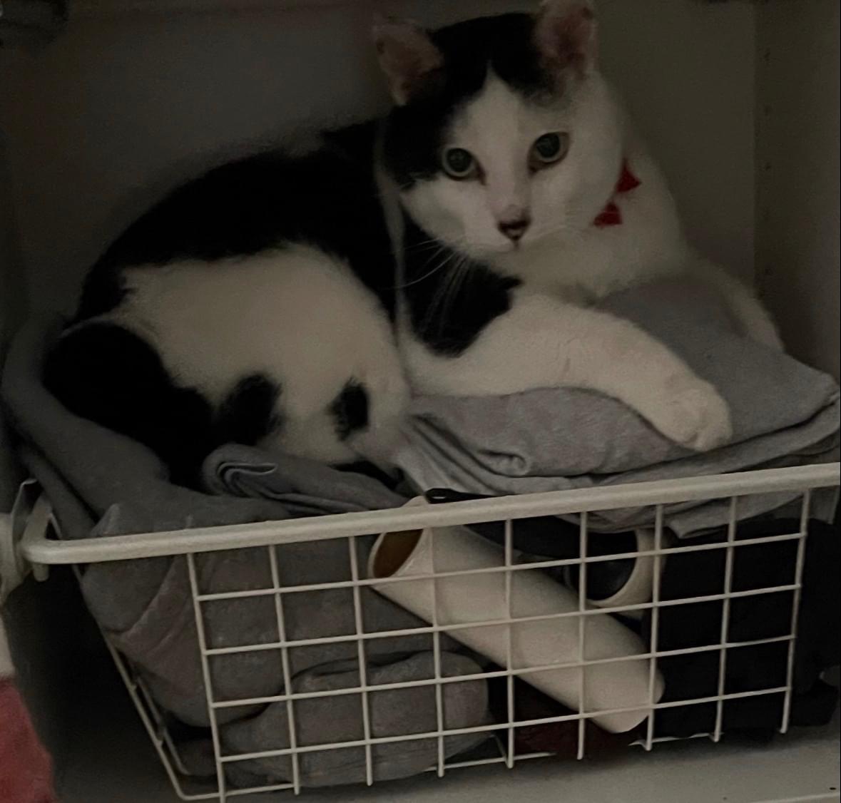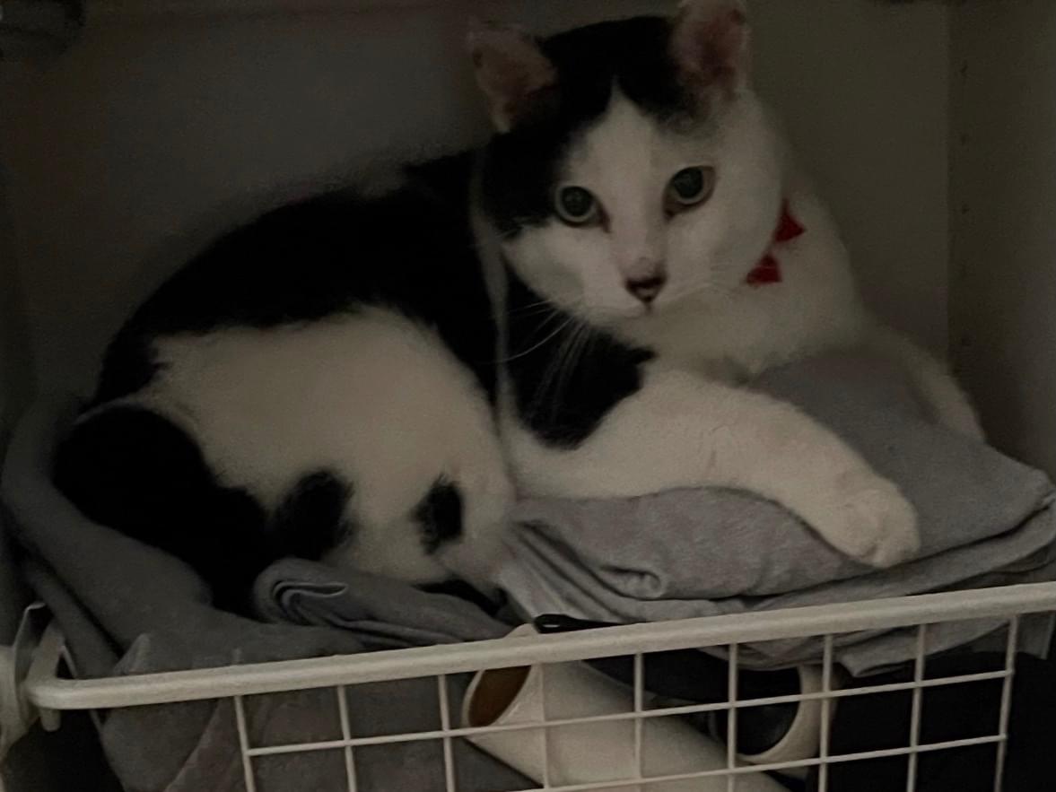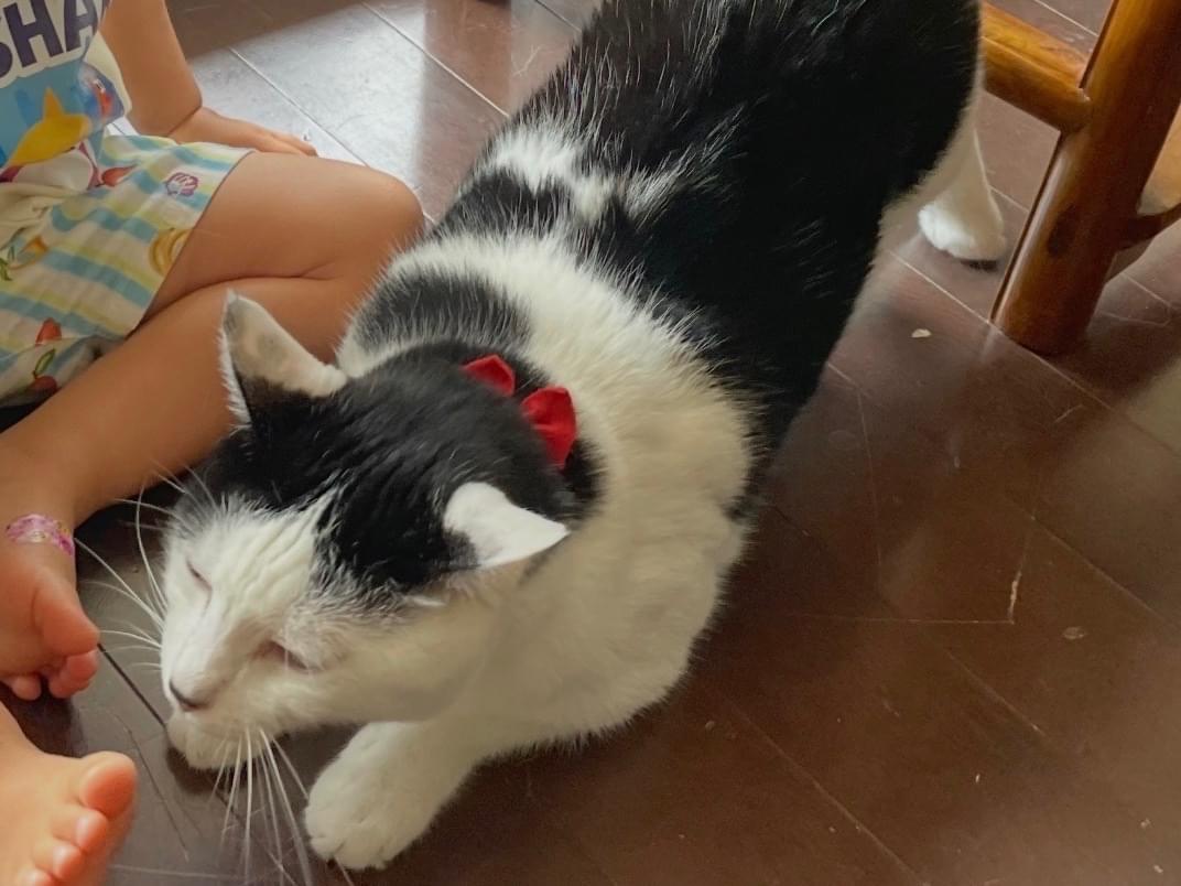 赤い蝶ネクタイ首輪をつけています。(外れている可能性もあります)