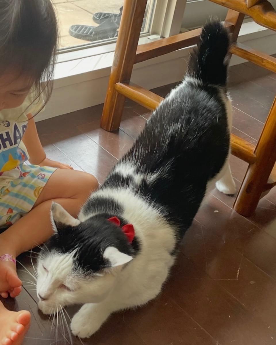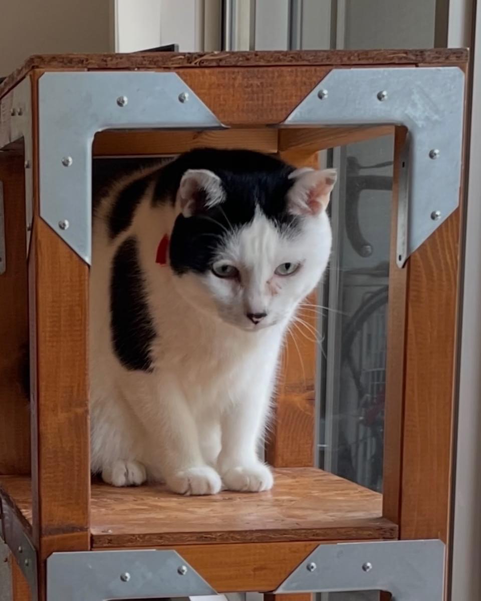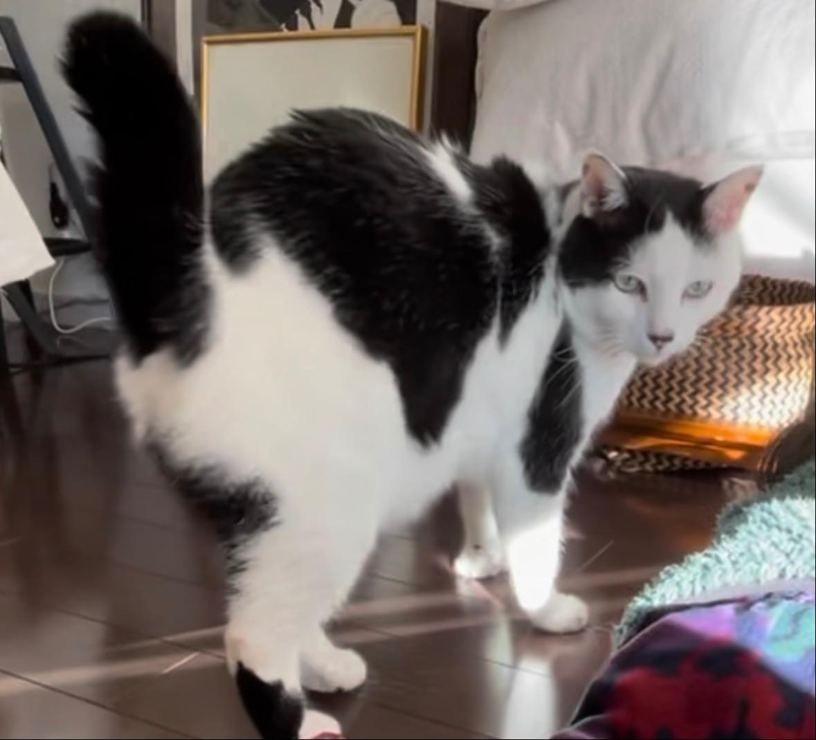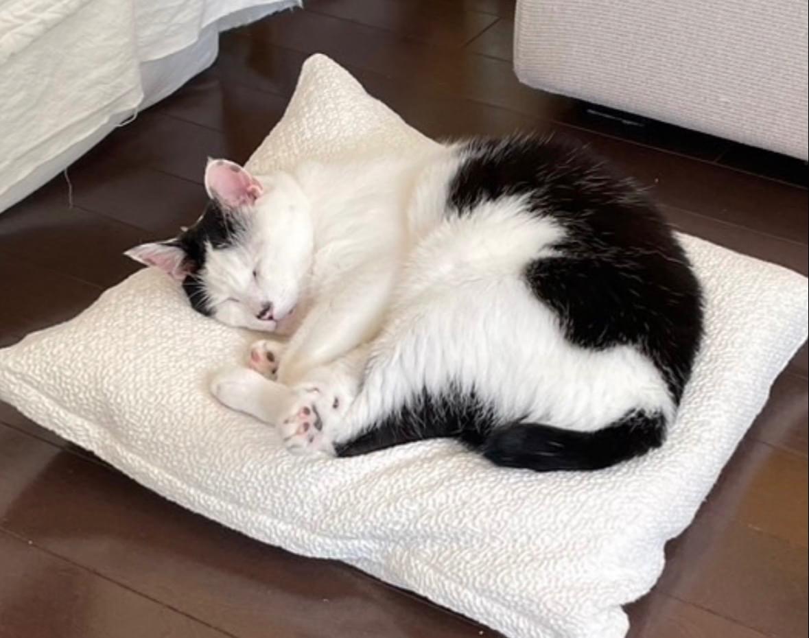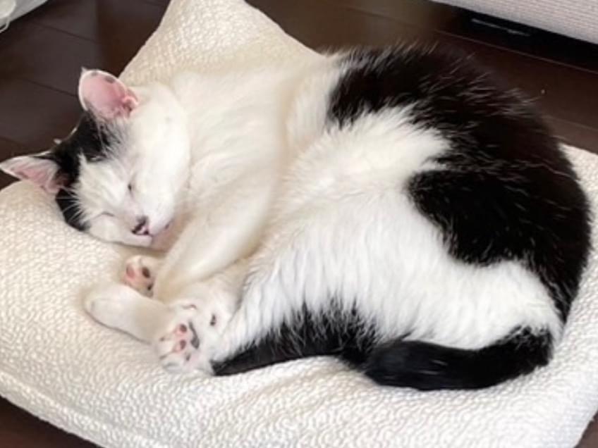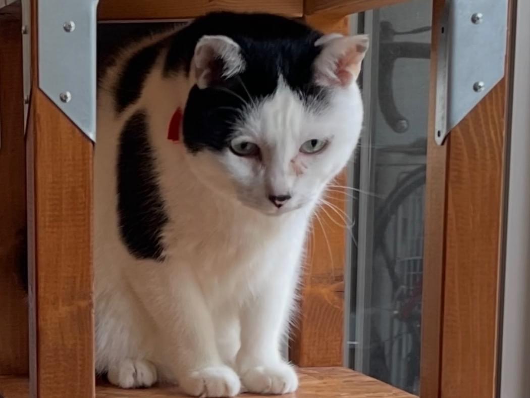 ずんぐりむっくりの白黒牛柄ハチワレ。