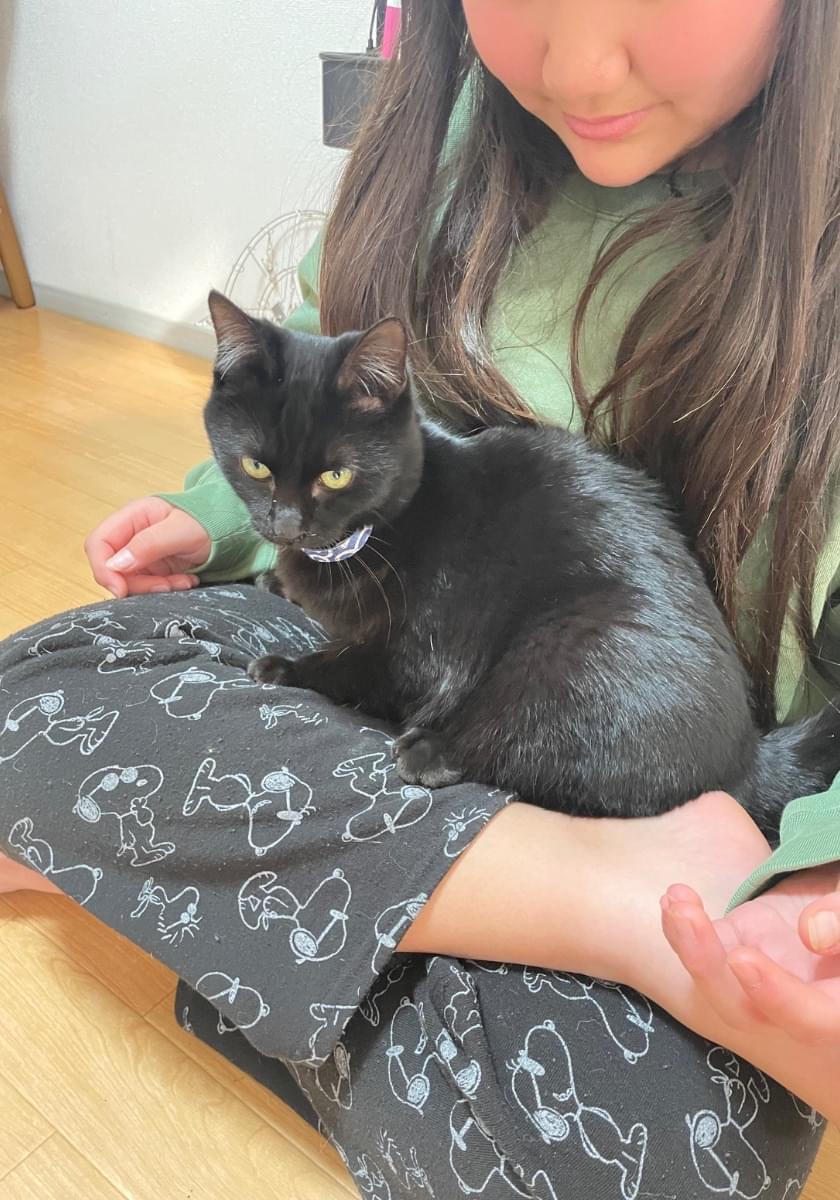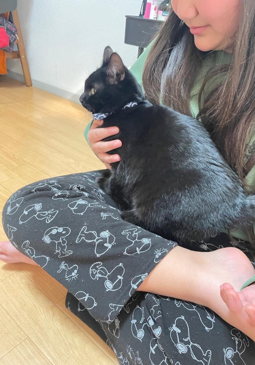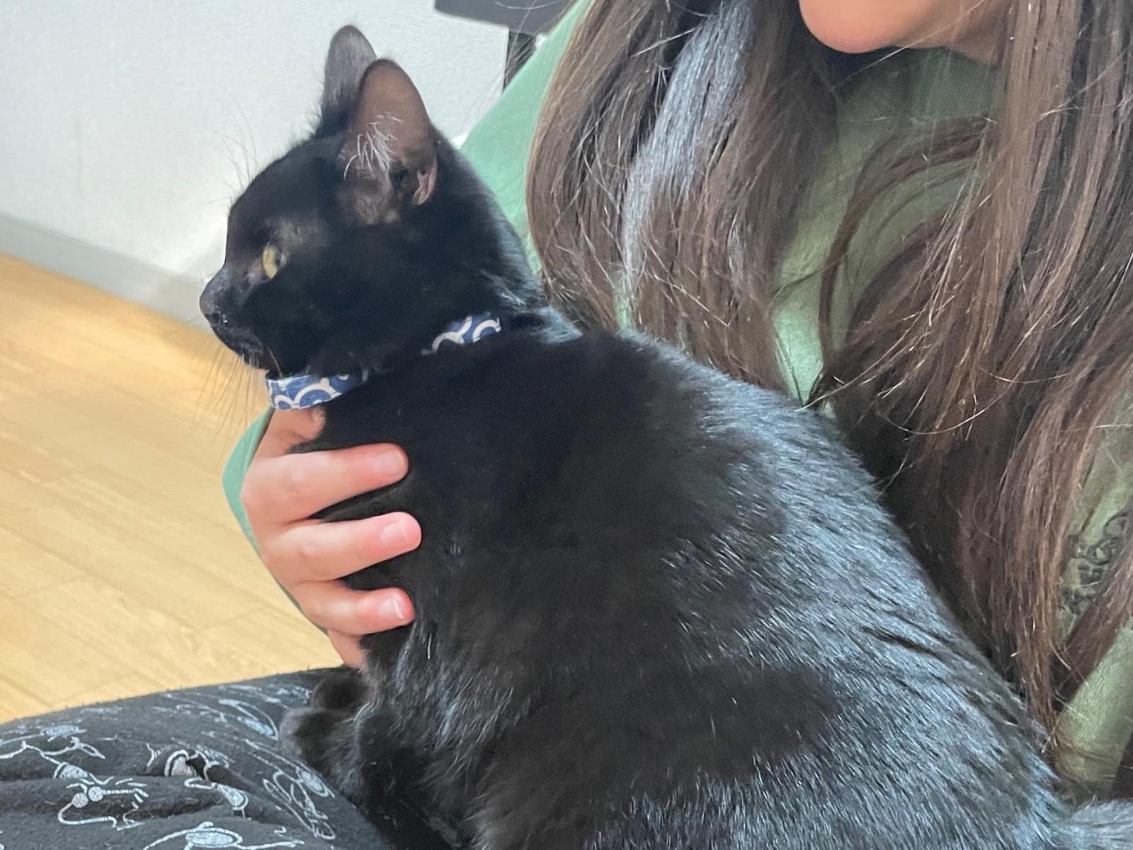 黒猫、オス、青色首輪、子猫から成猫の間ぐらい