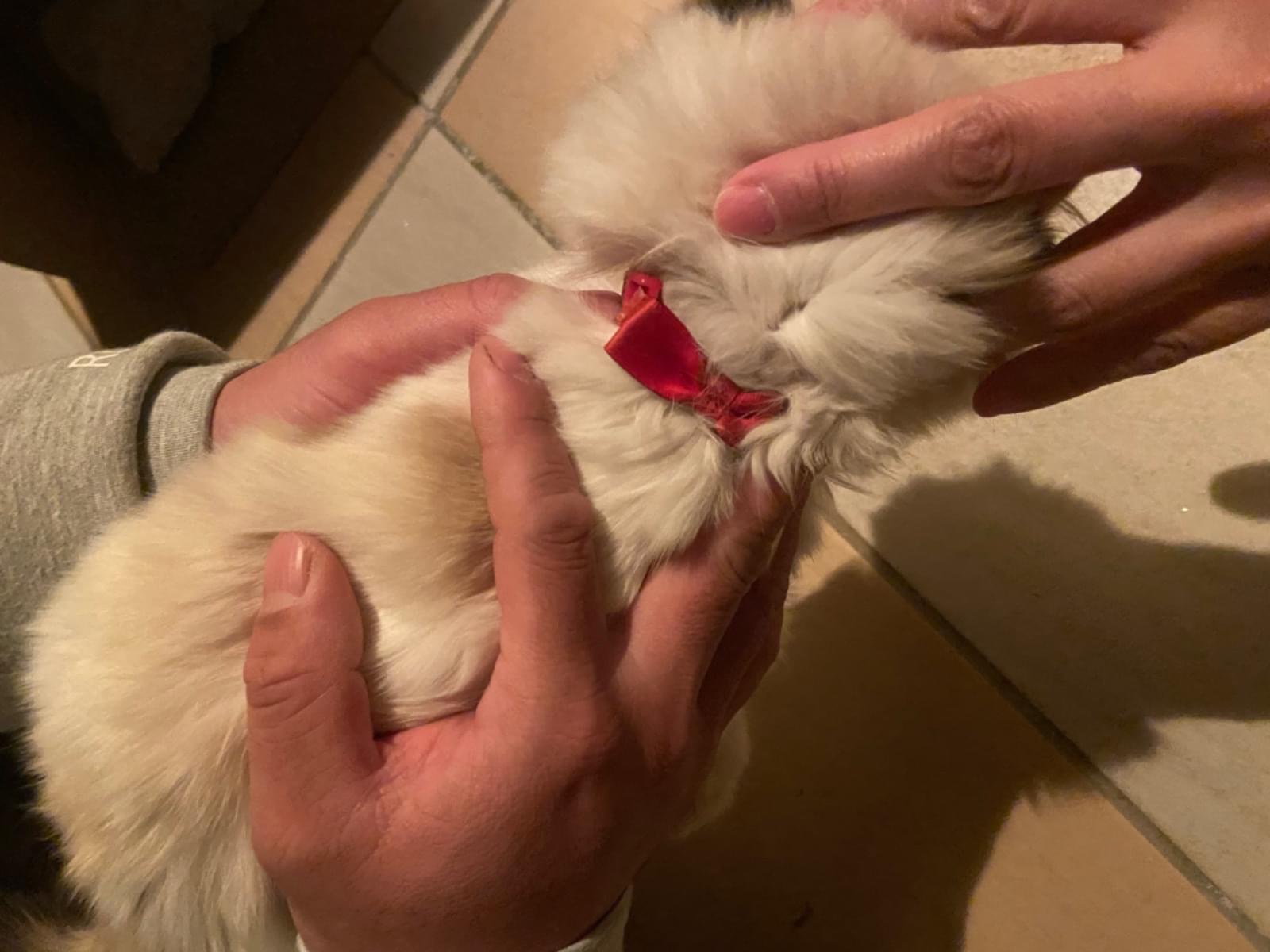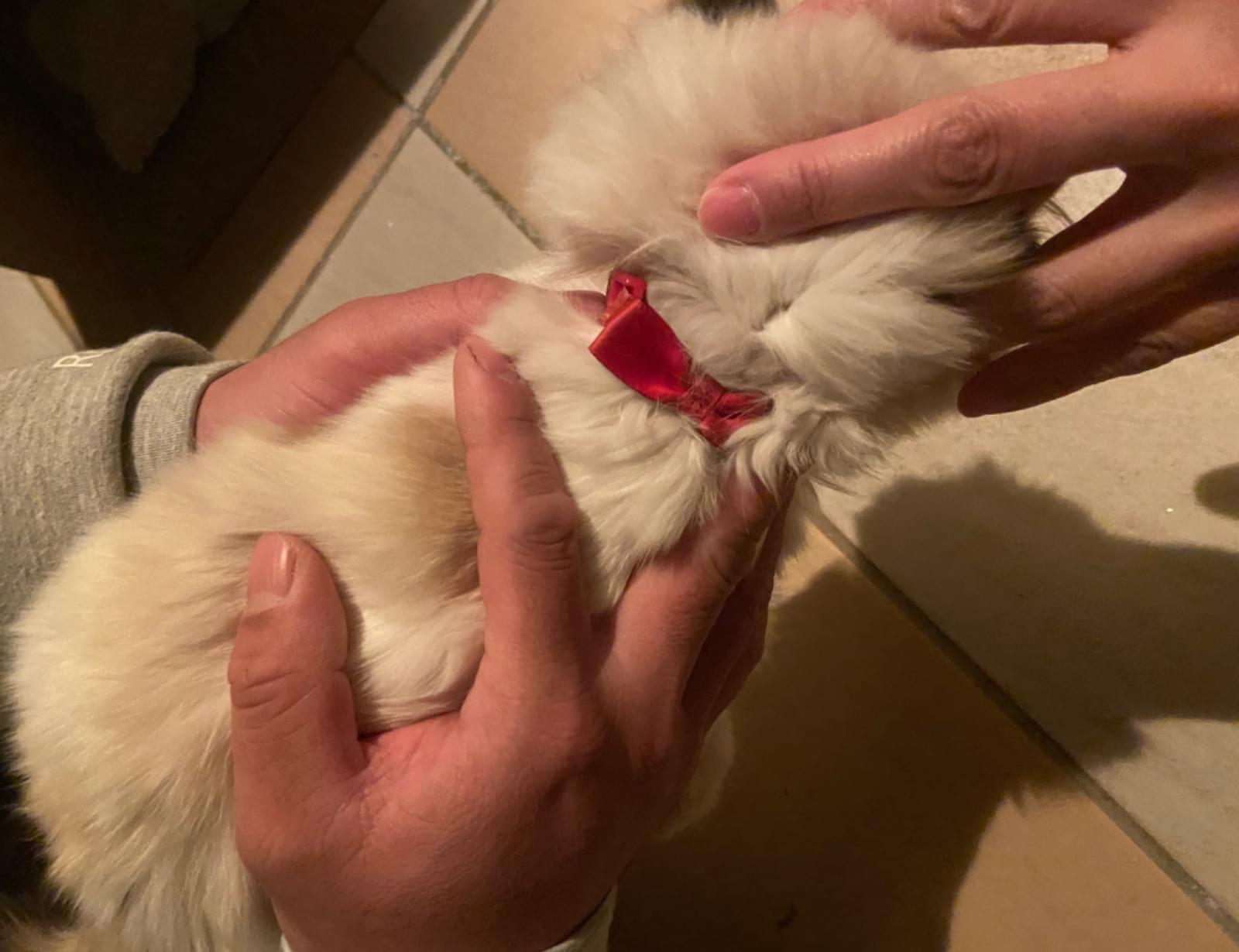 ふわふわの白い毛に、耳は焦茶、お鼻に黒いブチ