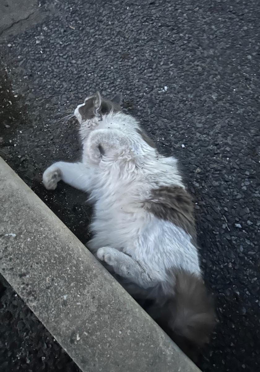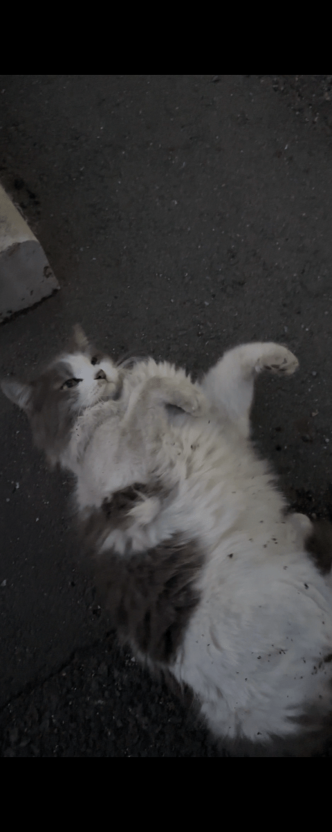 ゴロゴロする前は白い毛が汚れておらず、撫でるとさらさらの毛並みだったため家猫だと思われます。