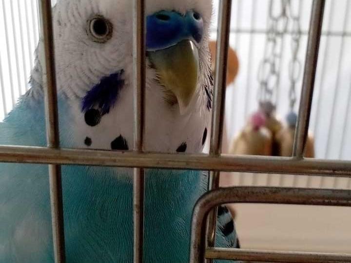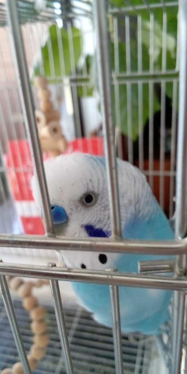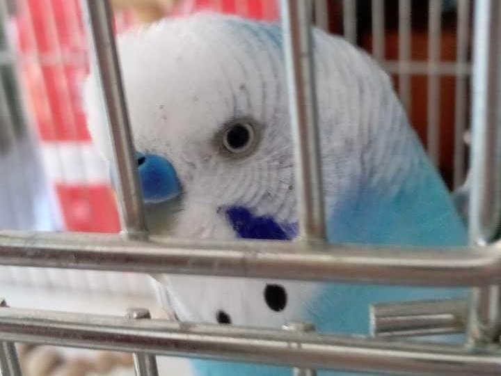 インコの特徴は、ポッペにほくろのような黒い模様が3つあります。全体は水色と白、黒色です。