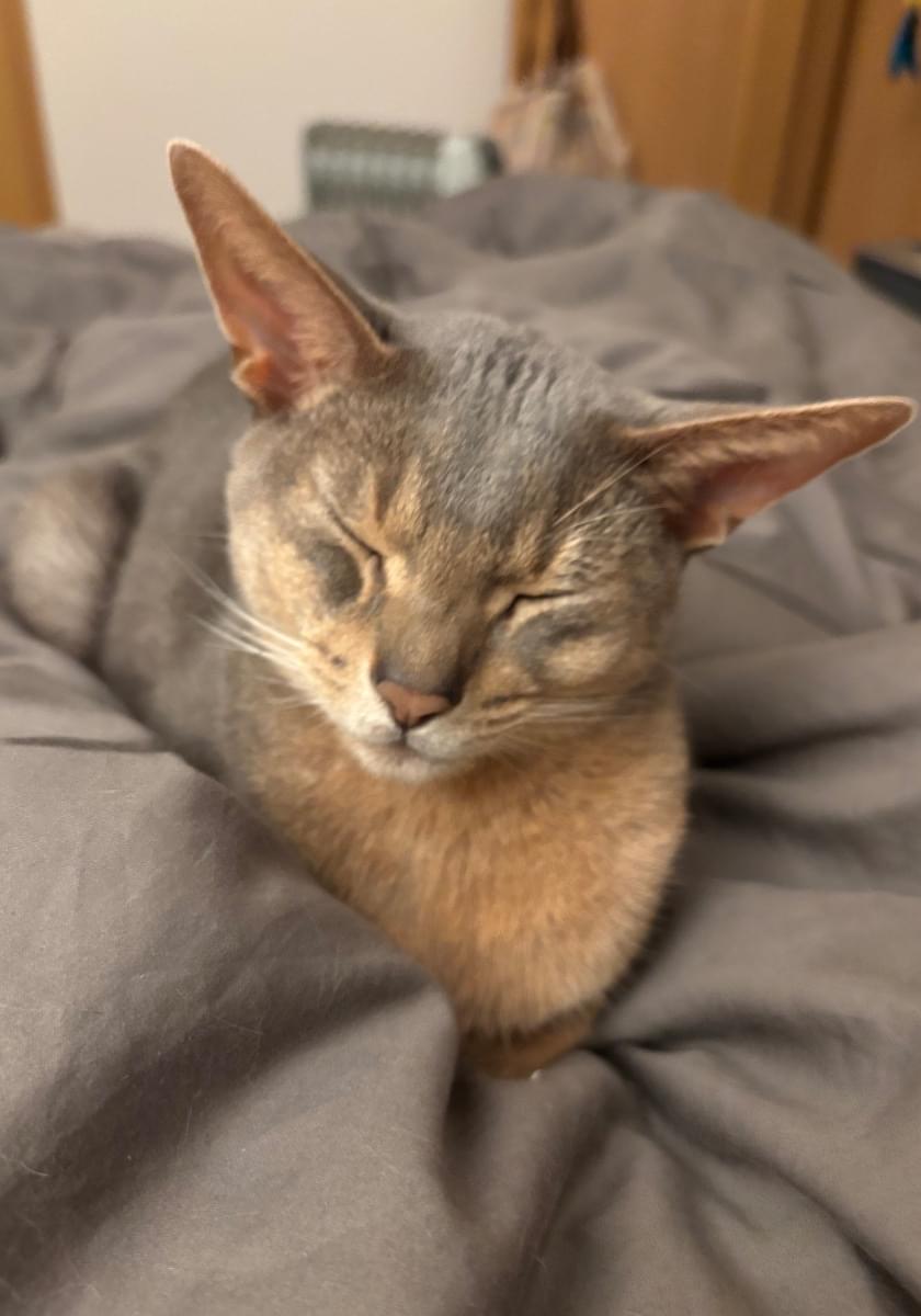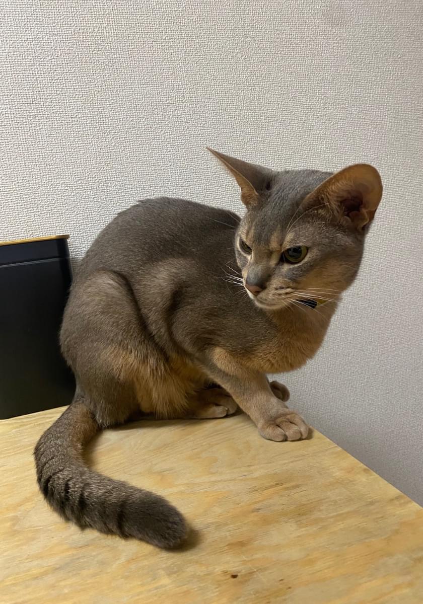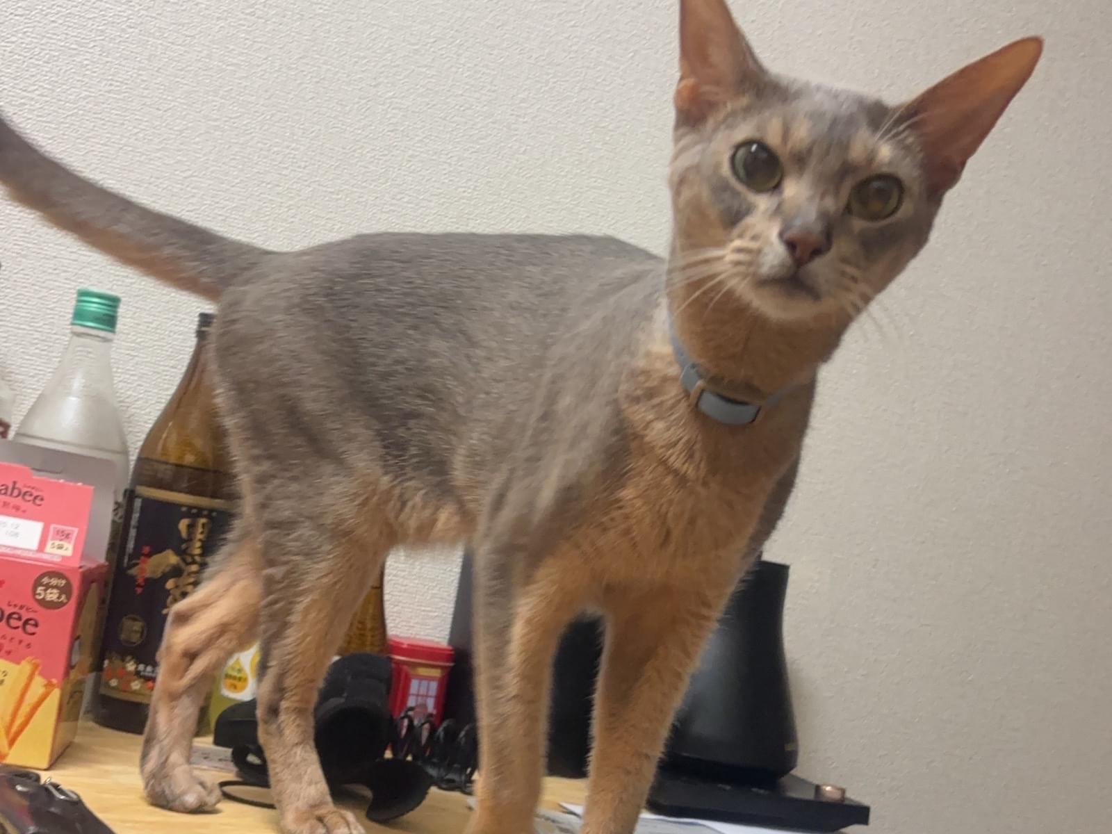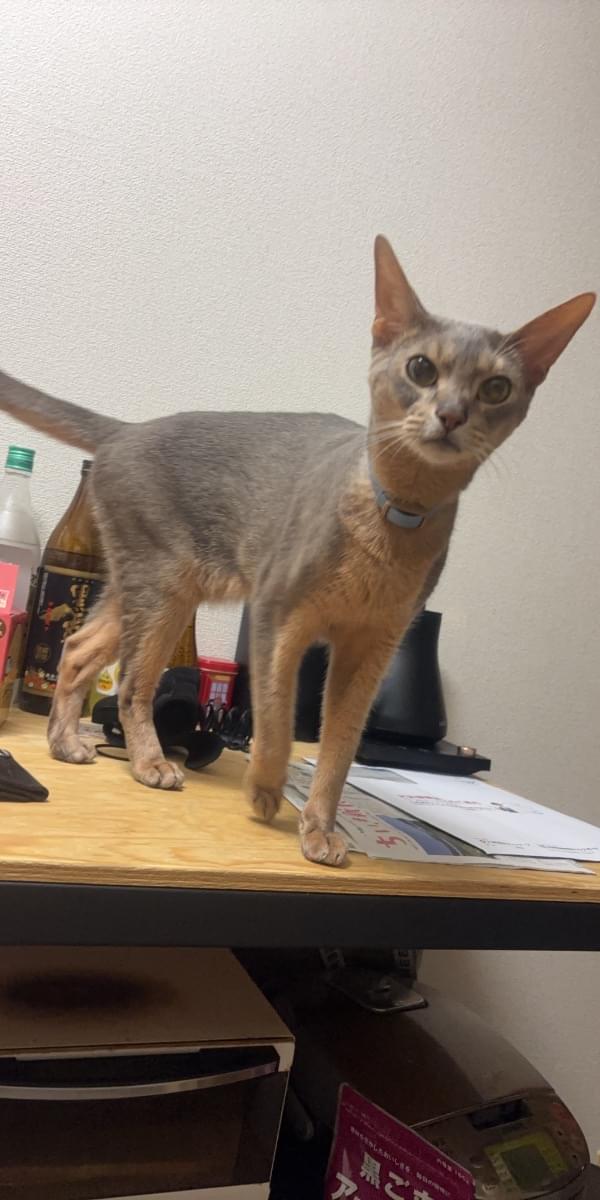 猫が迷子です。種類はアビシニアンでグレーです。右後ろ足の毛が薄くなってるところがあります。体は細身でシッポが長いです