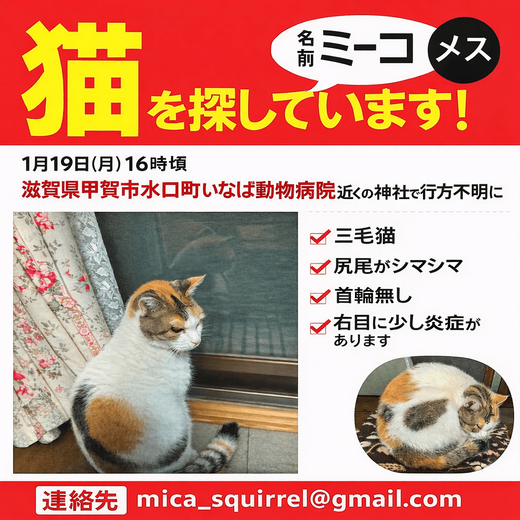 ホーム迷子猫滋賀県猫を探しています猫を探しています管理編集するポスター掲載終了最終更新日時:2026/02/01 20:27写真情報用件迷子名前ミーコ性別メス年齢成人猫場所滋賀県 甲賀市水口町いなば動物病院の近くの八幡神社発生日時2026年1月19日(月)飼い主mica説明滋賀県甲賀市水口町いなば動物病院近くの神社で行方不明に。三毛猫 尻尾がシマシマ 首輪なし 右目に少し炎症があります連絡先URL未設定掲示板情報交換のための掲示板です。ユーザーからの情報提供、オーナーからの連絡などにご利用下さいませ。まだコメントはありません。トピックを作成する