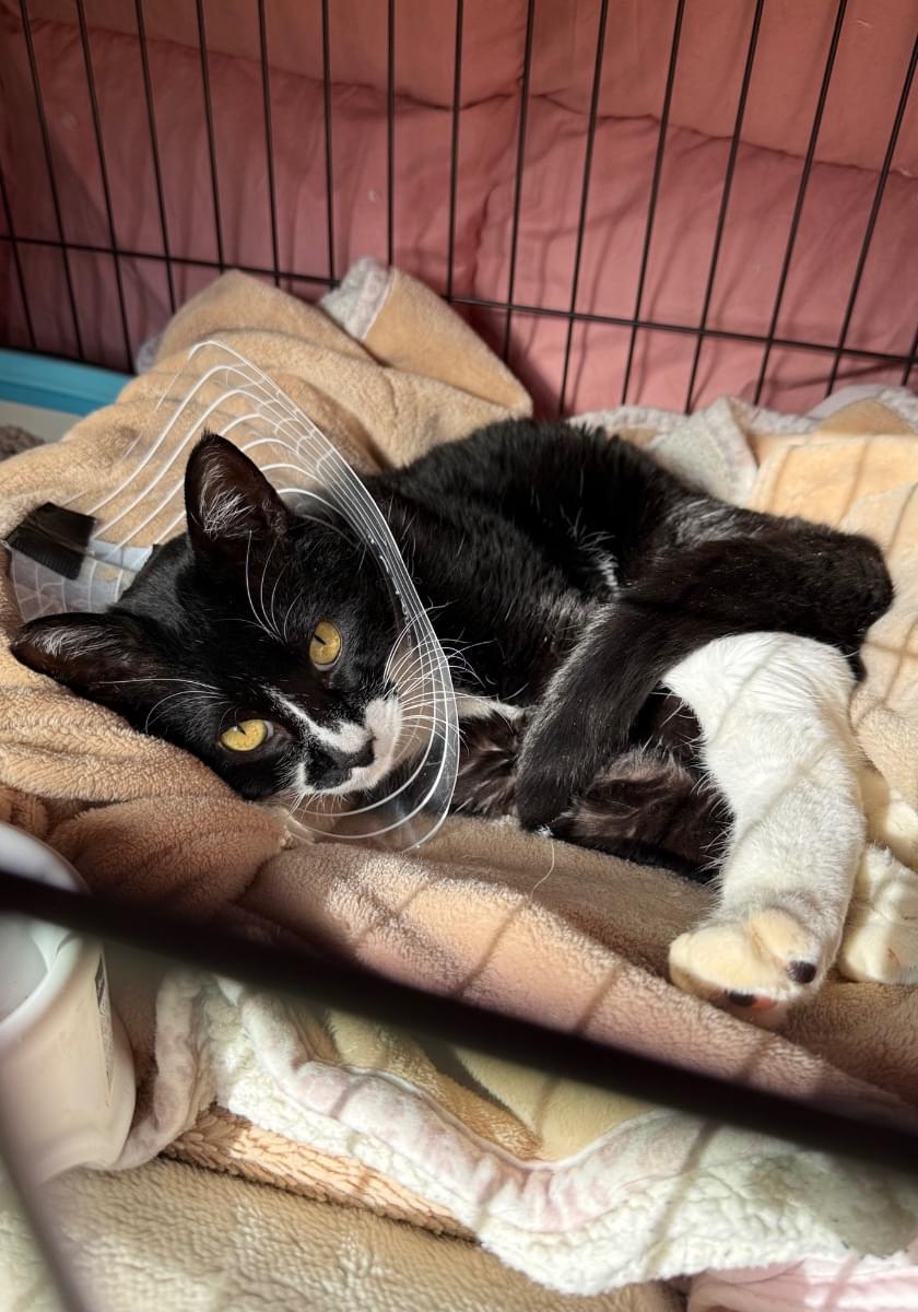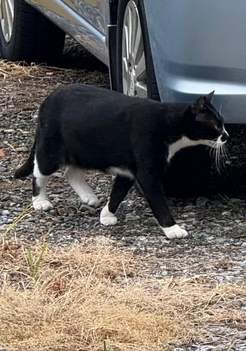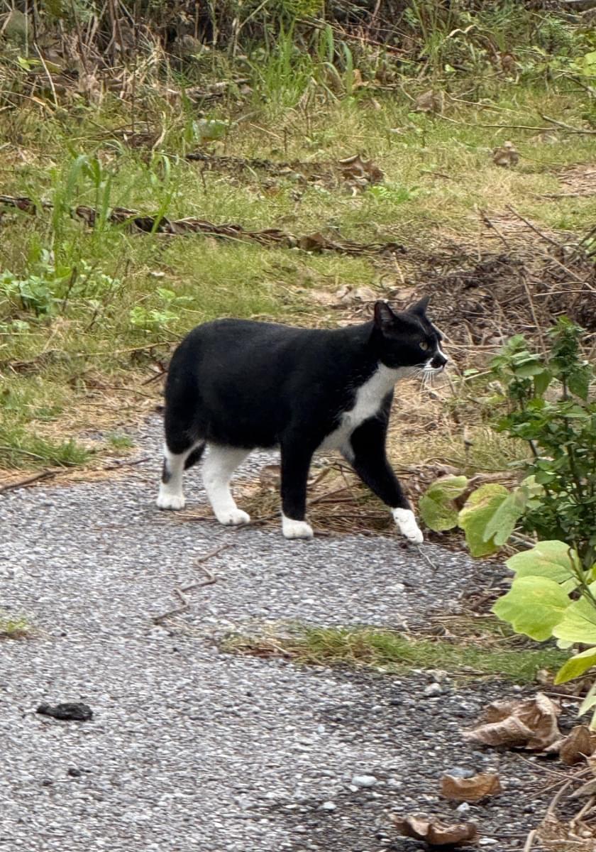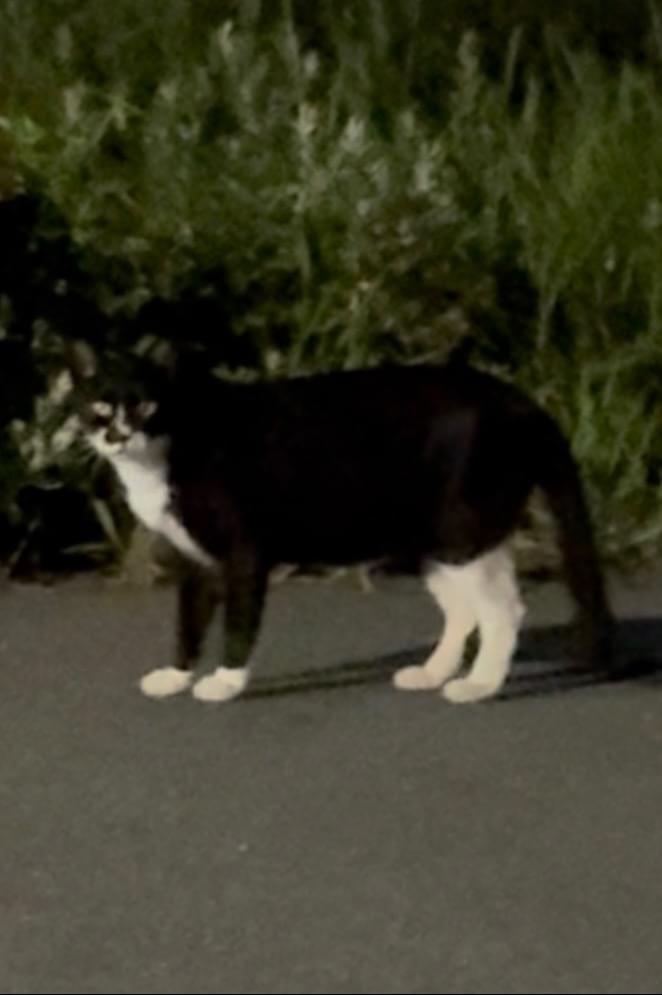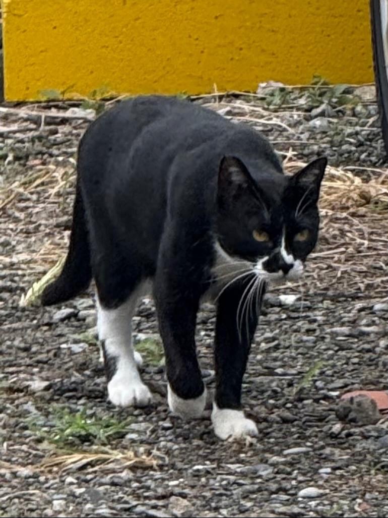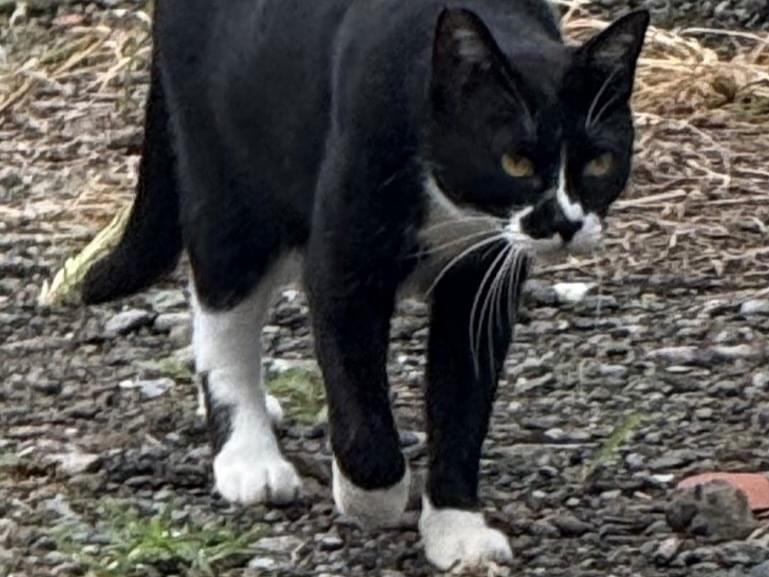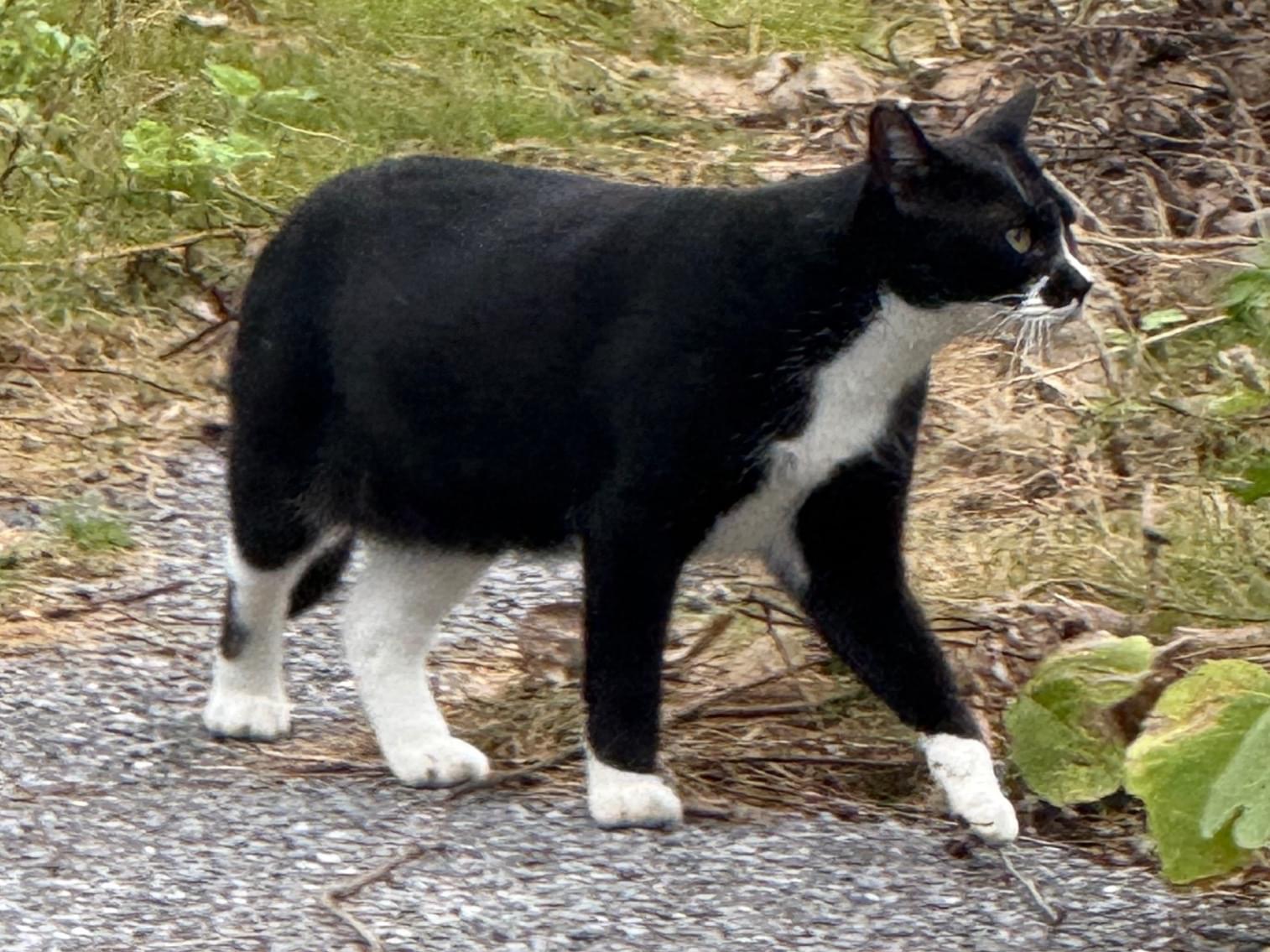 体の大部分は黒で、正面から見ると顎から胸は白いです。両前足に白手袋をして、後ろ左足に白いハイソックスを履いている様な見た目です。