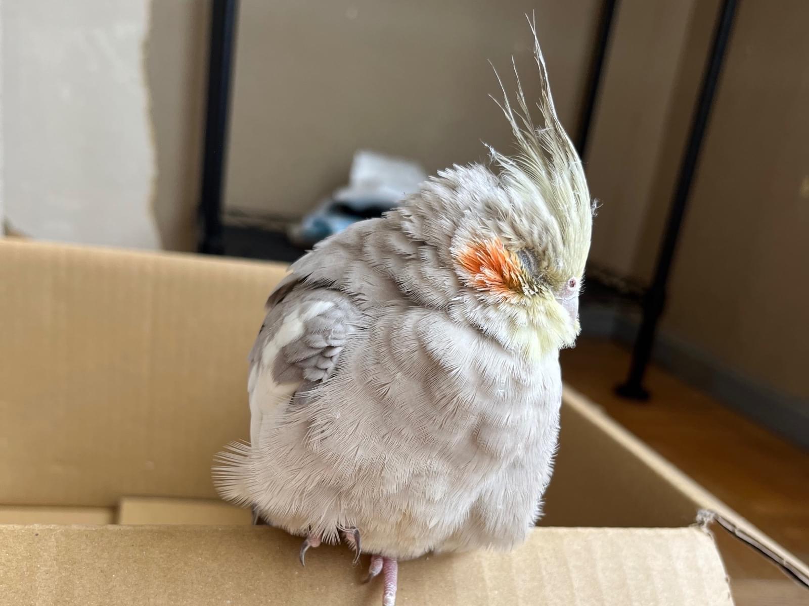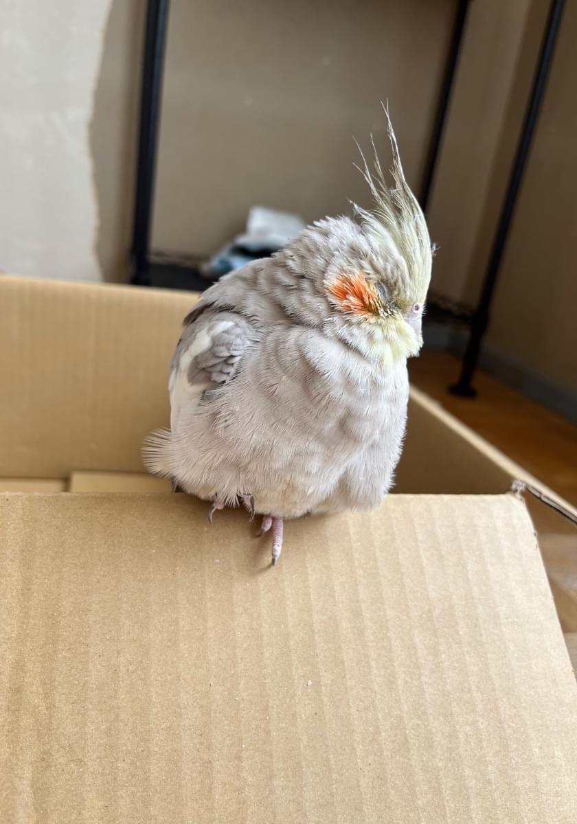 シナモン?グレー?どちらかの種類で、オカメインコです。ピィーとたまに鳴いています。人の手や足に乗ったり、ティッシュで遊んだり、すごく人馴れしている子だと思いました!