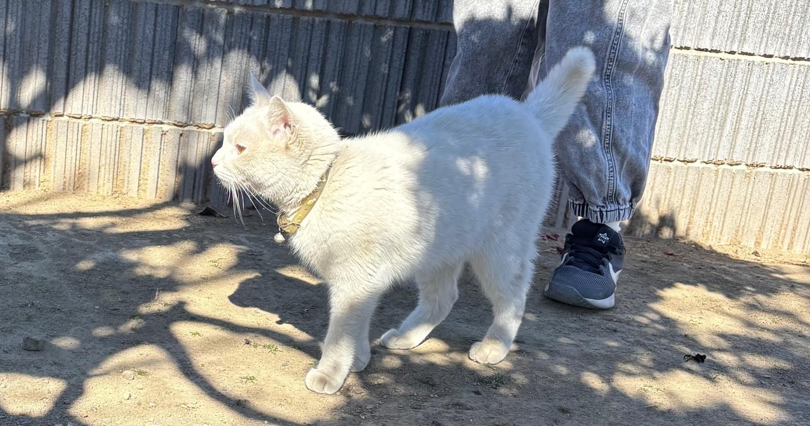 パイナップルのような柄の首輪をした白い猫を見かけました