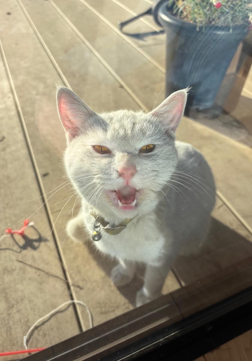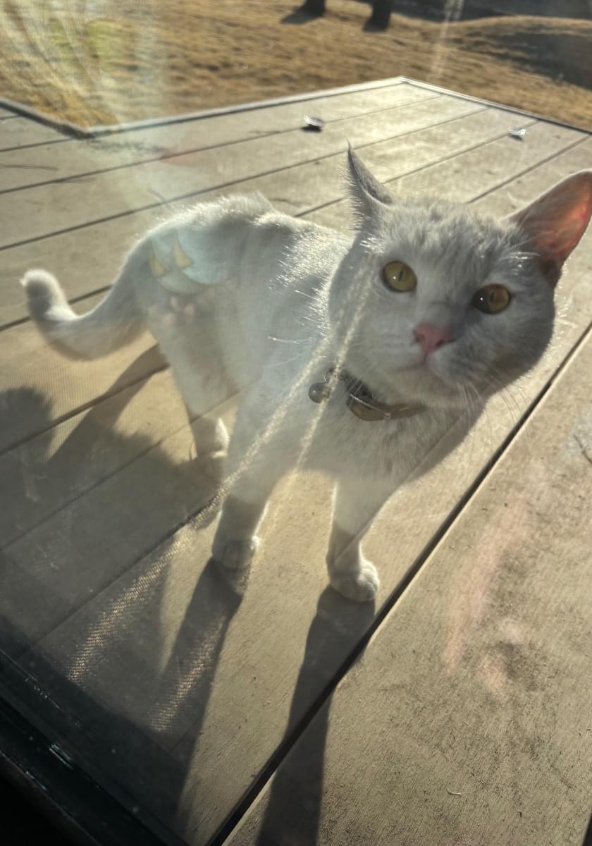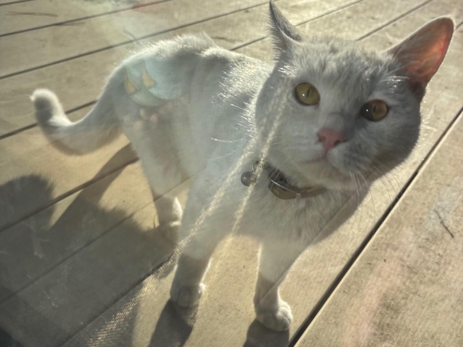 2/1にパイナップルのような柄の首輪をした白い猫を見かけました。翌日になっても見かけましたので、近所をずっとうろうろしているようです。事情があり保護できないのですが投稿します。