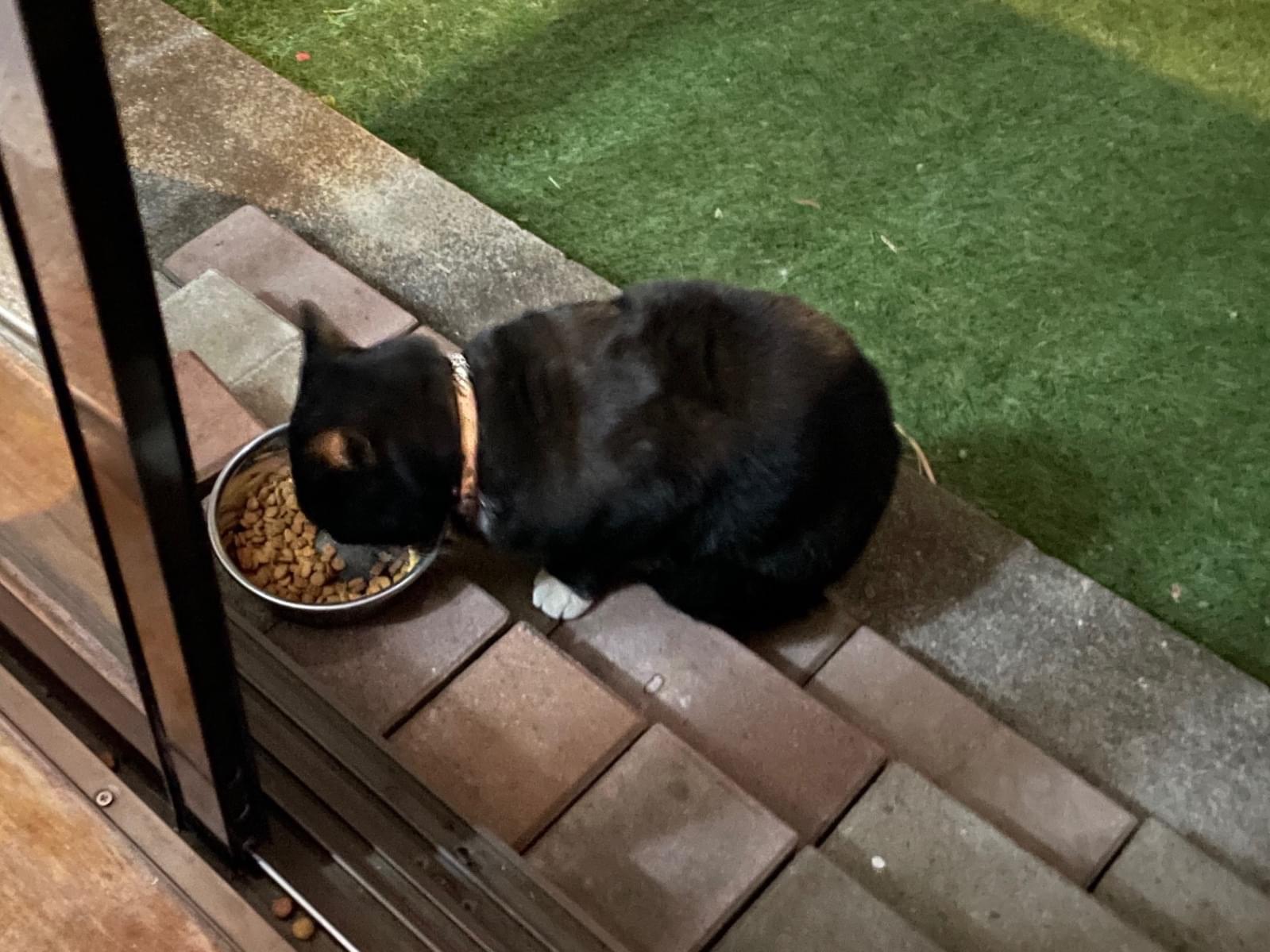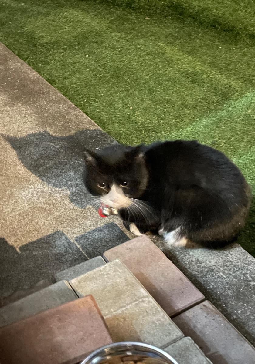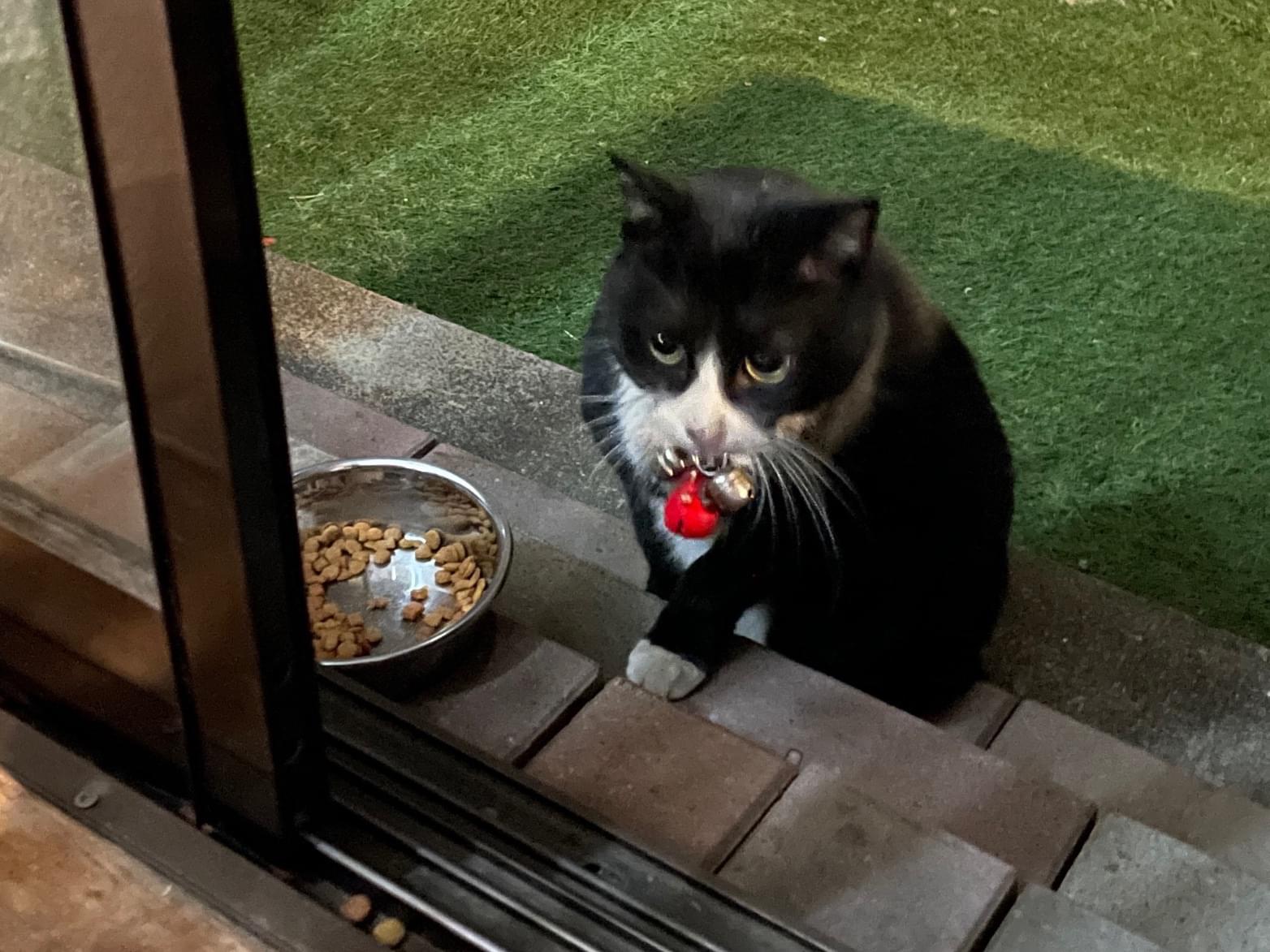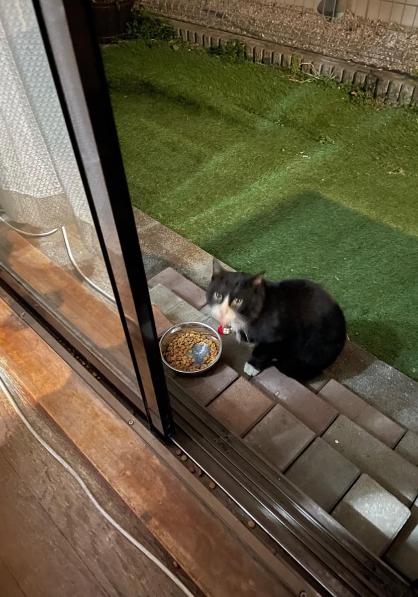 大きな鈴が付いた首輪をしています。首輪にSORAと名前が入っています。うちの庭猫のごはんを食べているので飢えてはいません。