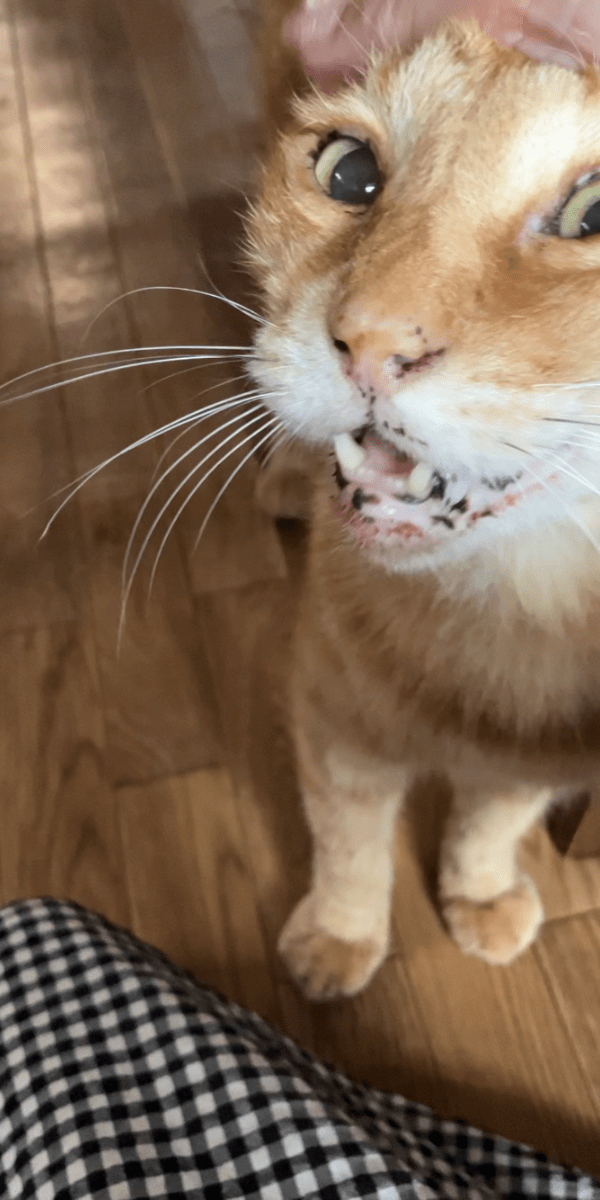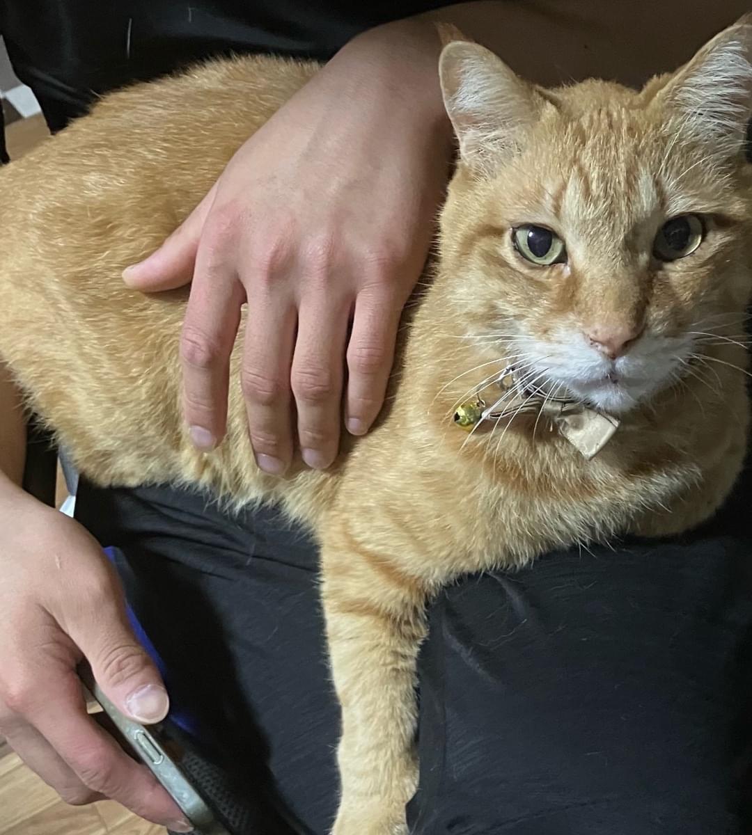 茶トラでしっぽは長く先っぽは白。家ではかなりの甘えん坊でベッタリですが、外の世界だと警戒して寄り付かないかもしれません。首輪はついてないです。首のあたりに抜け毛があります。