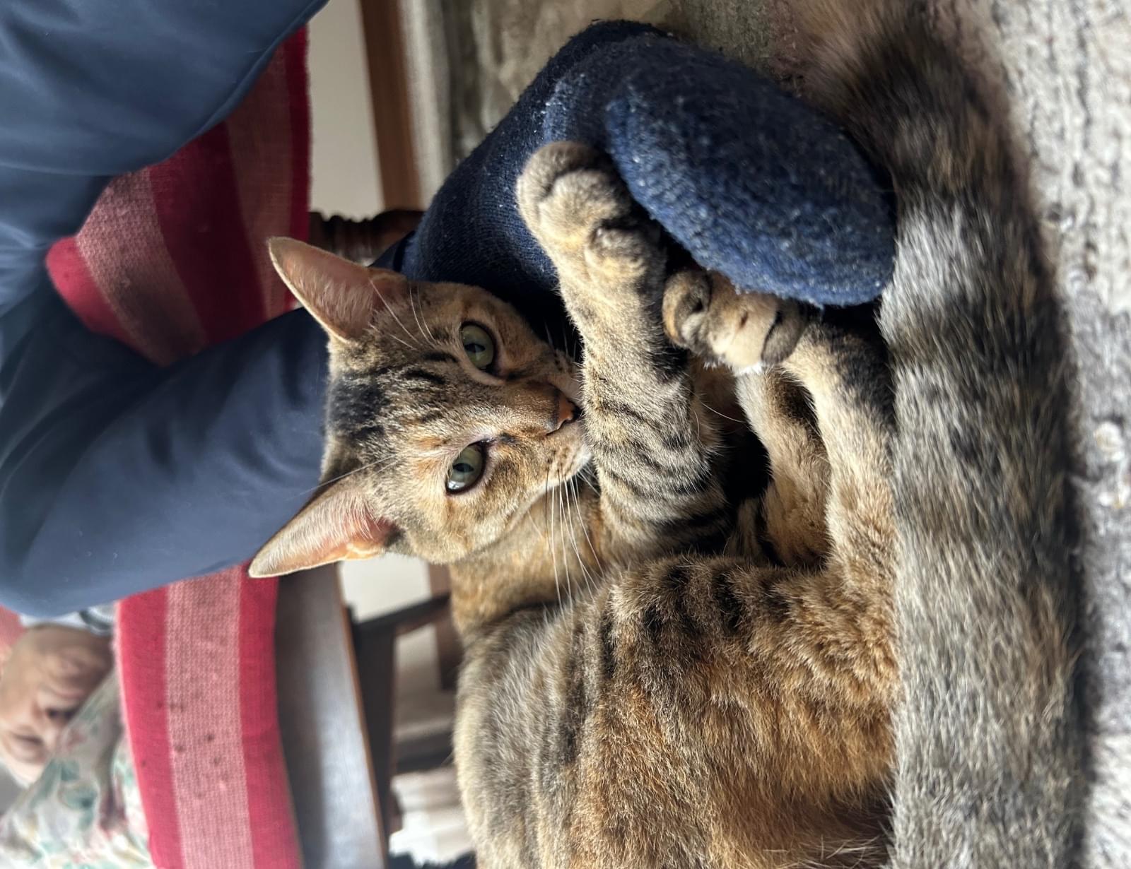 背中は茶色系のぼんやりした色ですが頭や足はキジのシマがあり、額のスカラベマークがクッキリとしています。顔が小さく耳が大きく見えます。