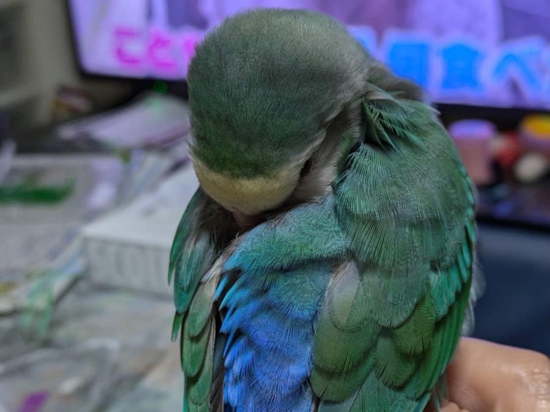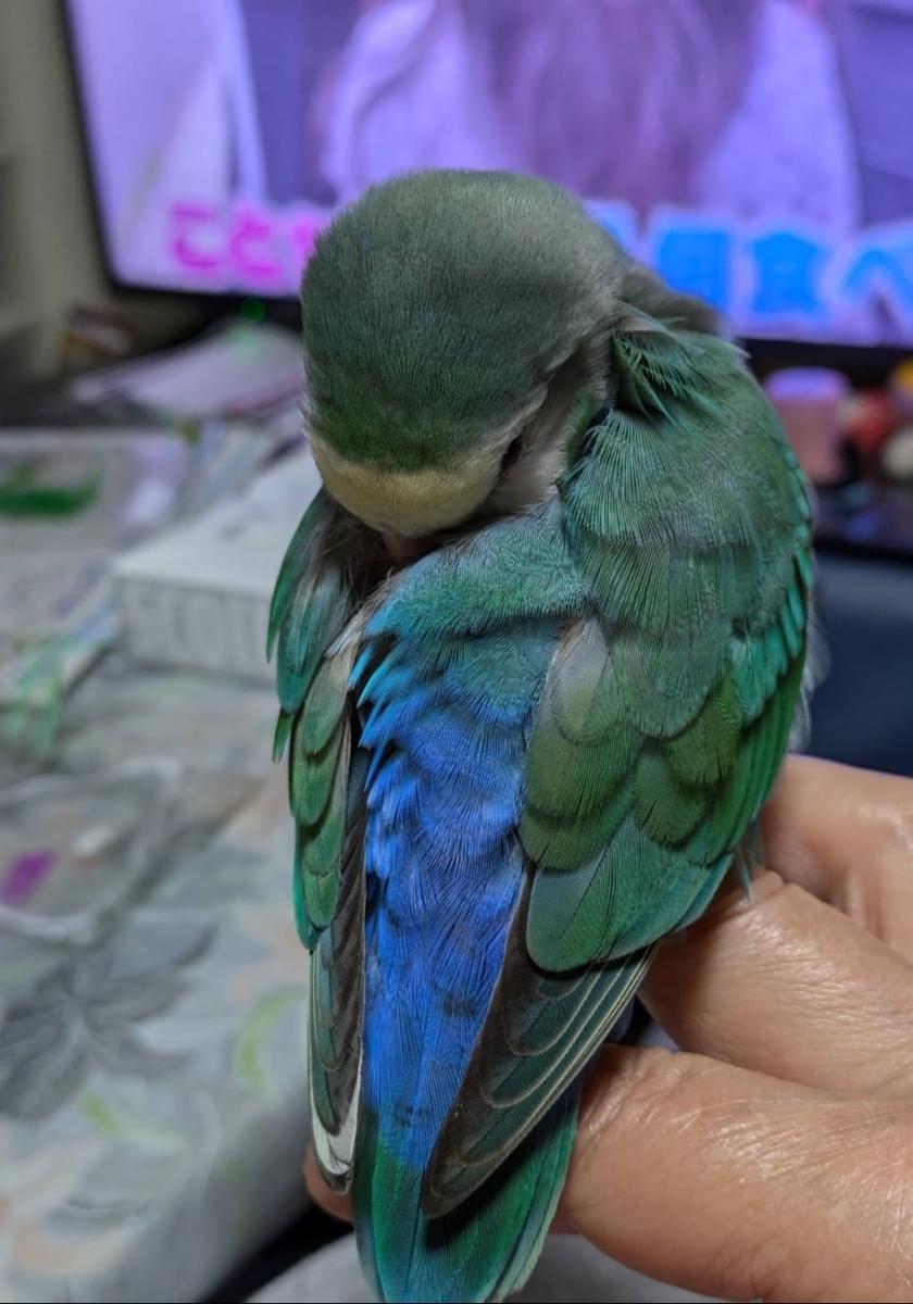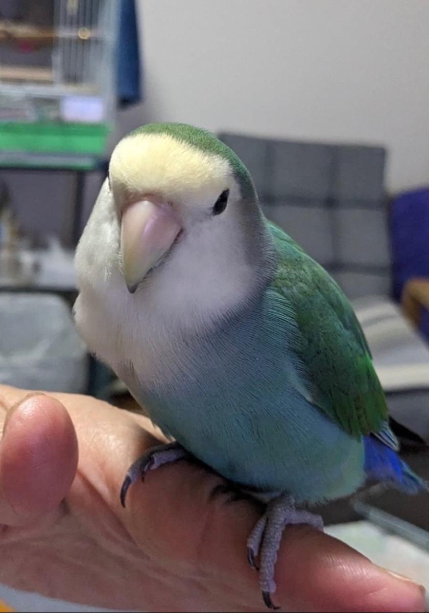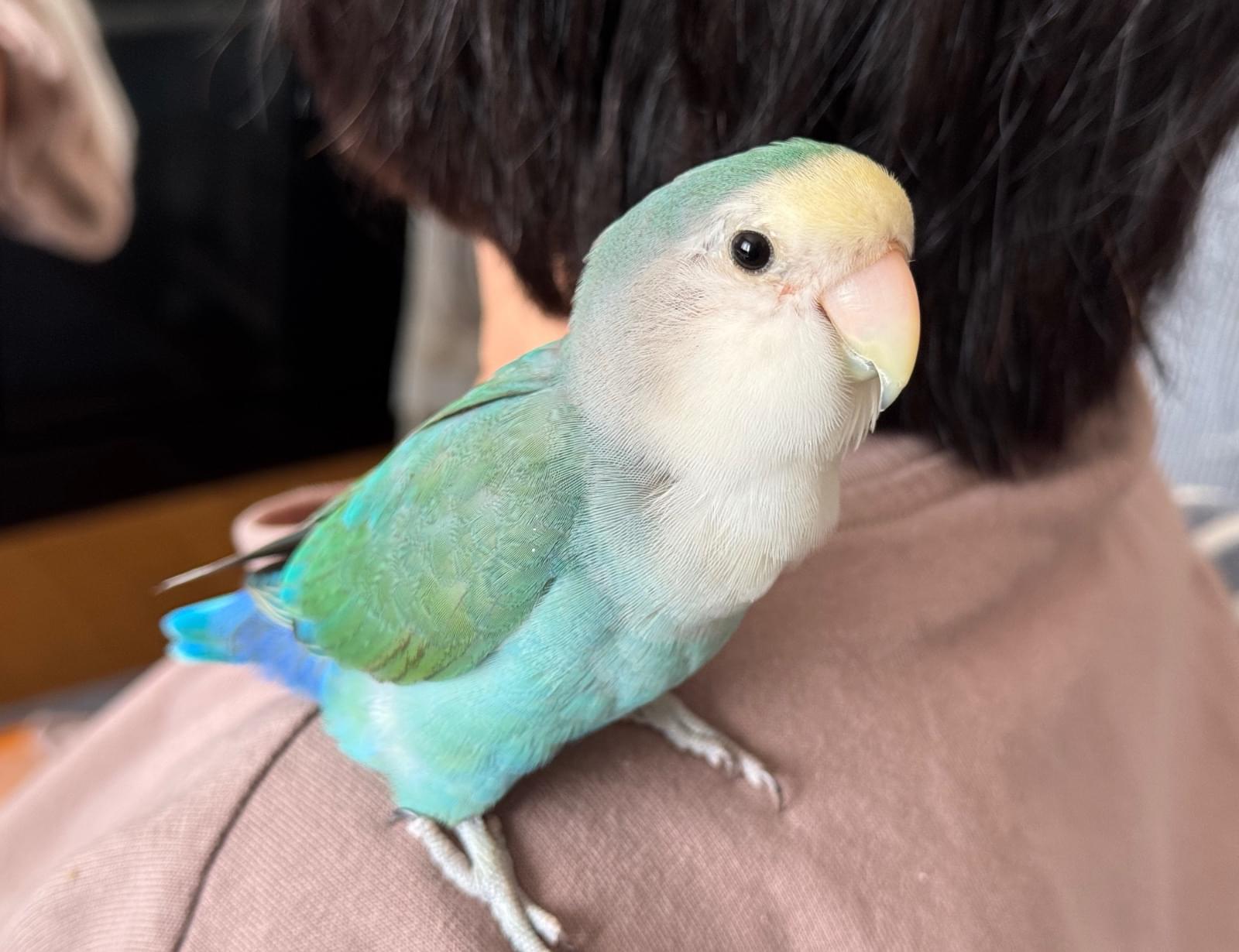 2月5日午前9時頃、ブルーのコザクラインコが母のジャンパーのフードに入ったまま外に出てしまい、カラスの声に驚いて飛んで行ってしまいました。