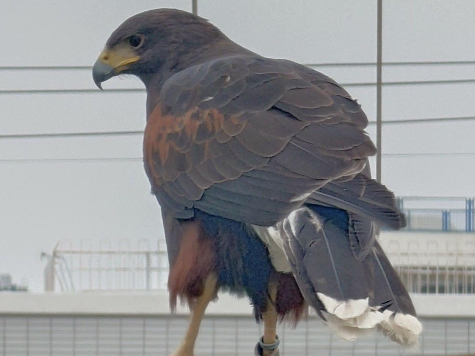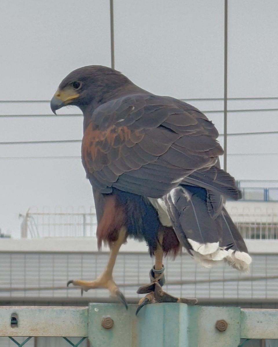朝から公園の金網にハリスホークが