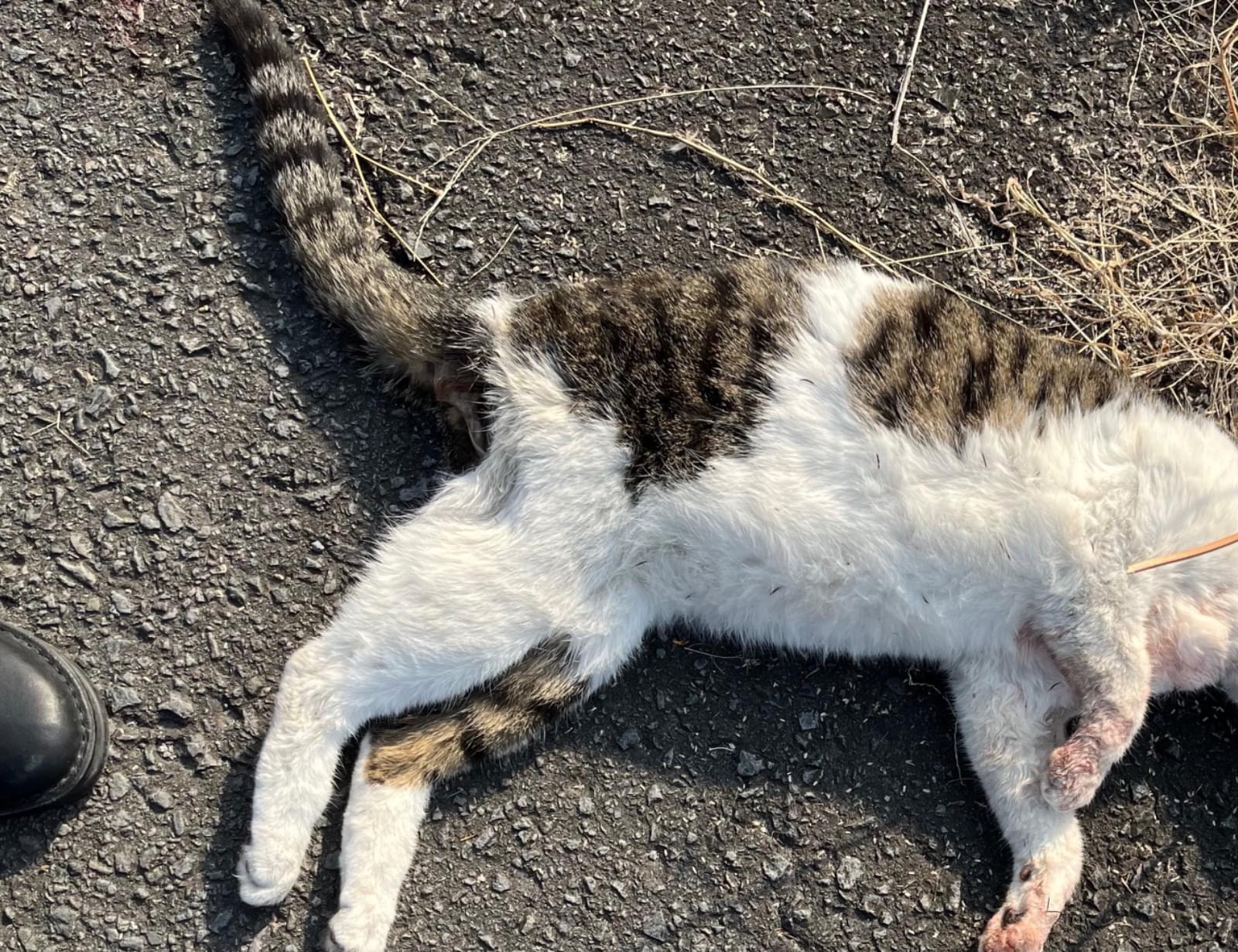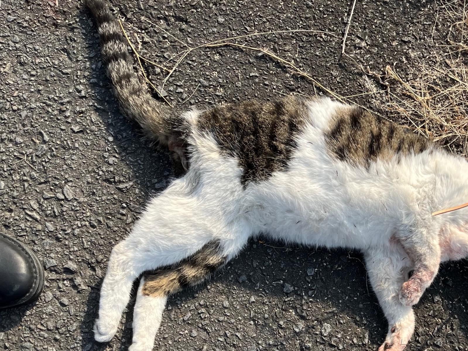 青色(水色?)の首輪をしたキジ白さんが、交通事故なのか、道端で残念ながら亡くなっています。