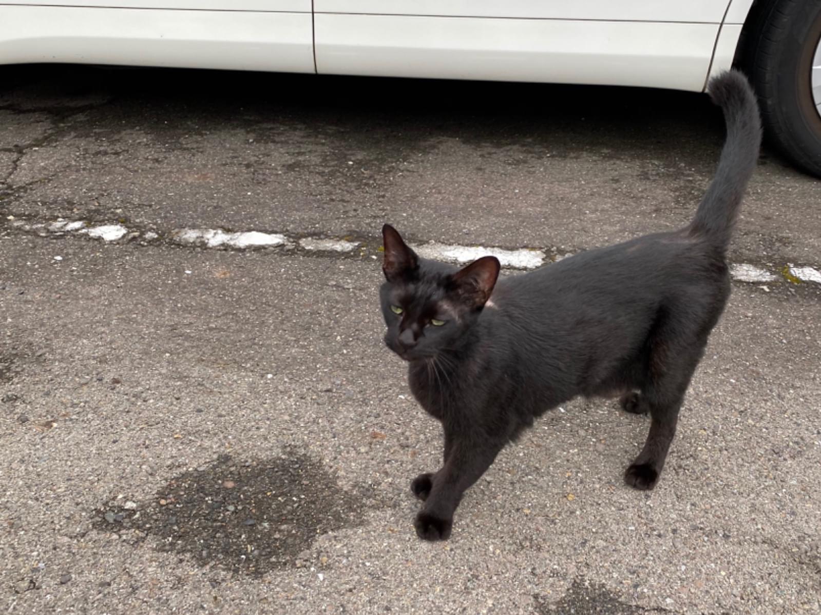 名古屋市西区新道の駐車場に黒猫がおり、人を見るとすり寄ってきて甘えてきます。