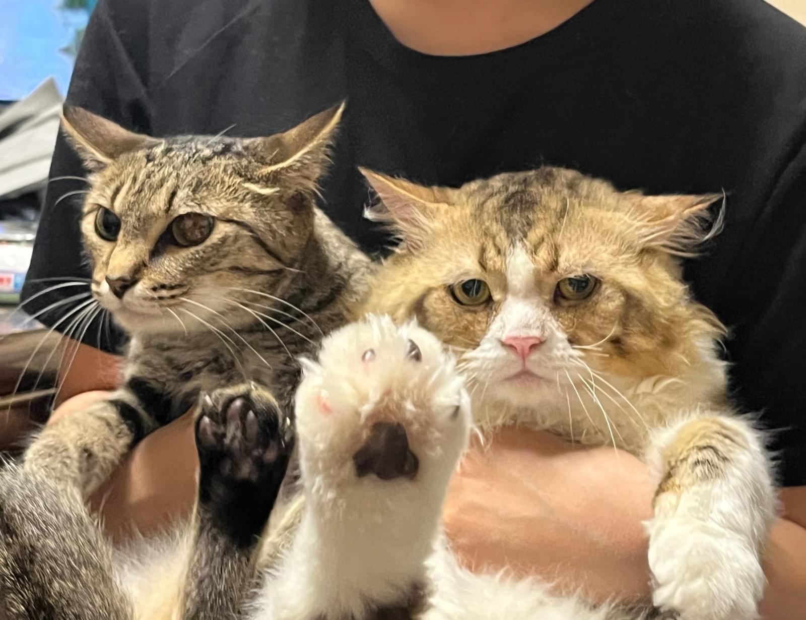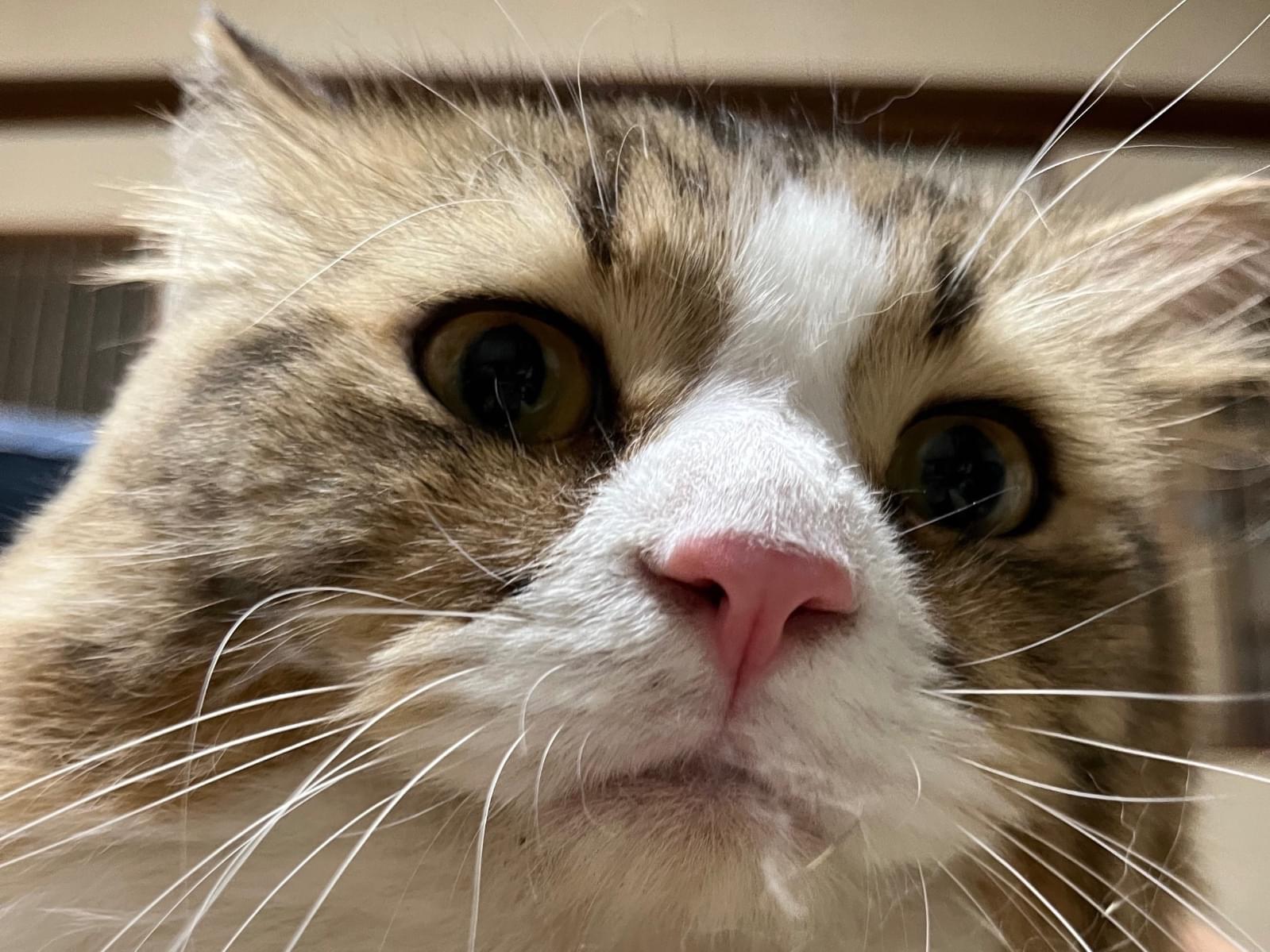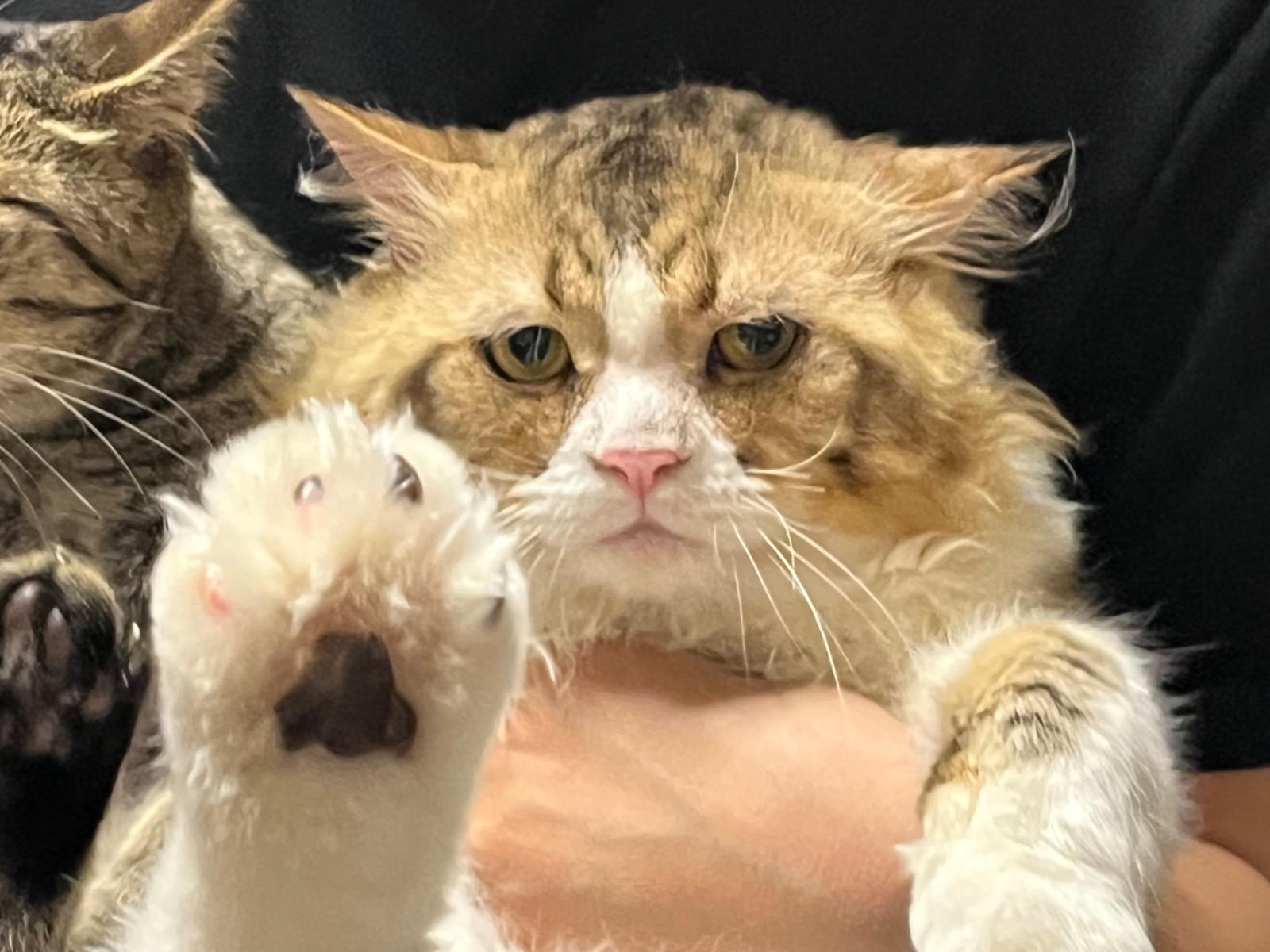 頭のてっぺんがキジトラの様な毛柄で顎下やお腹は全部真っ白.右頬に怪我(かさぶた)あり.困った顔だったり目つき悪かったり、、、