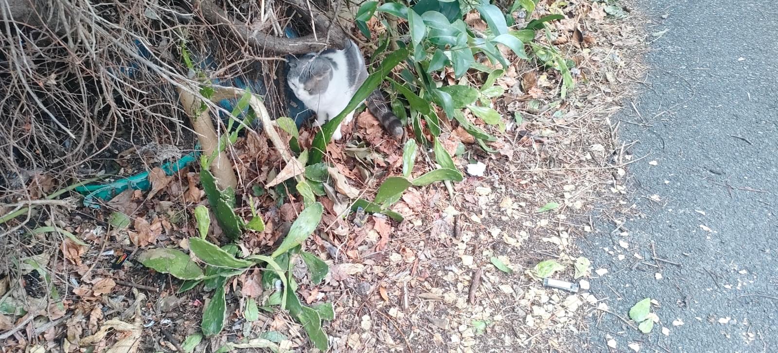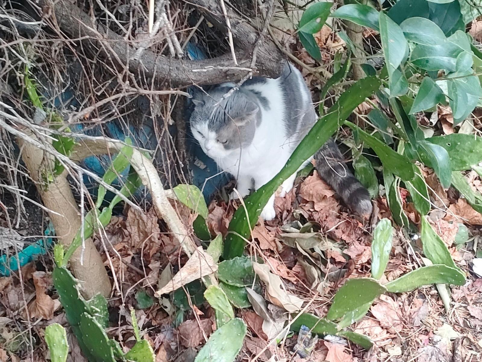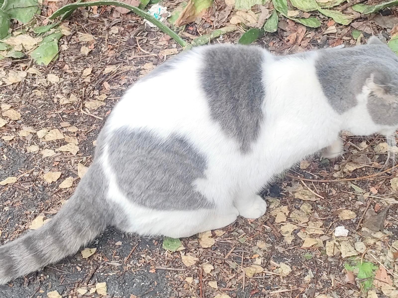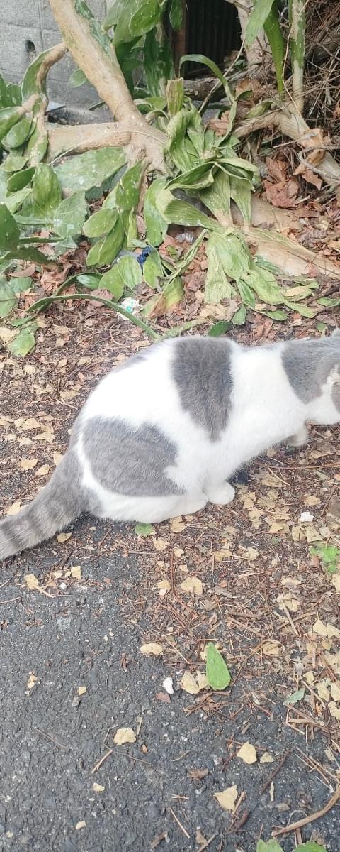 最近よく見かけますが寒いのにお外にいるので心配しています。人懐っこい子なので迷子猫さんなのではないかと思っています。白にグレーの模様、尻尾はしましまです。