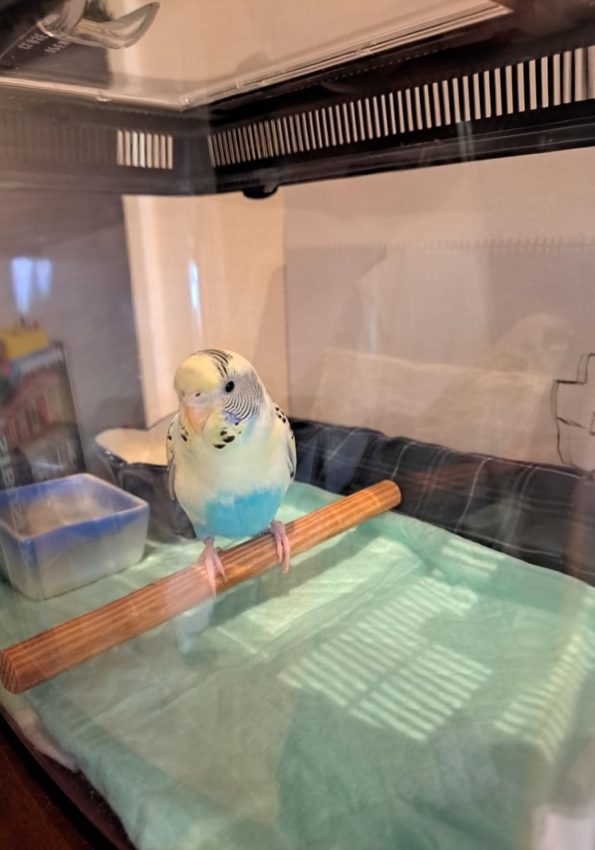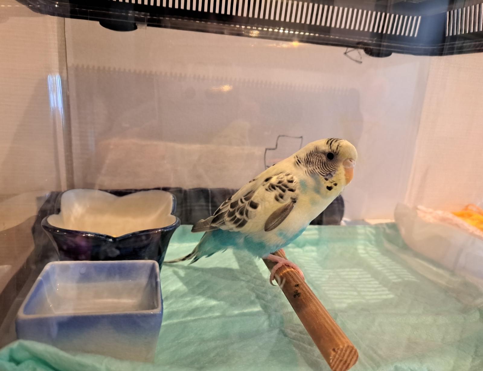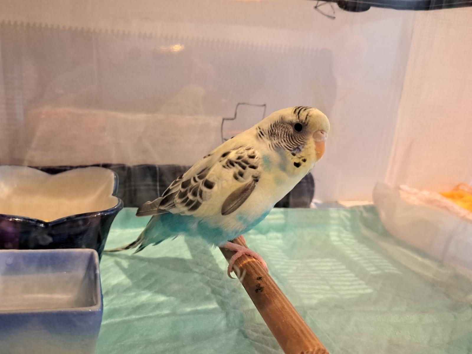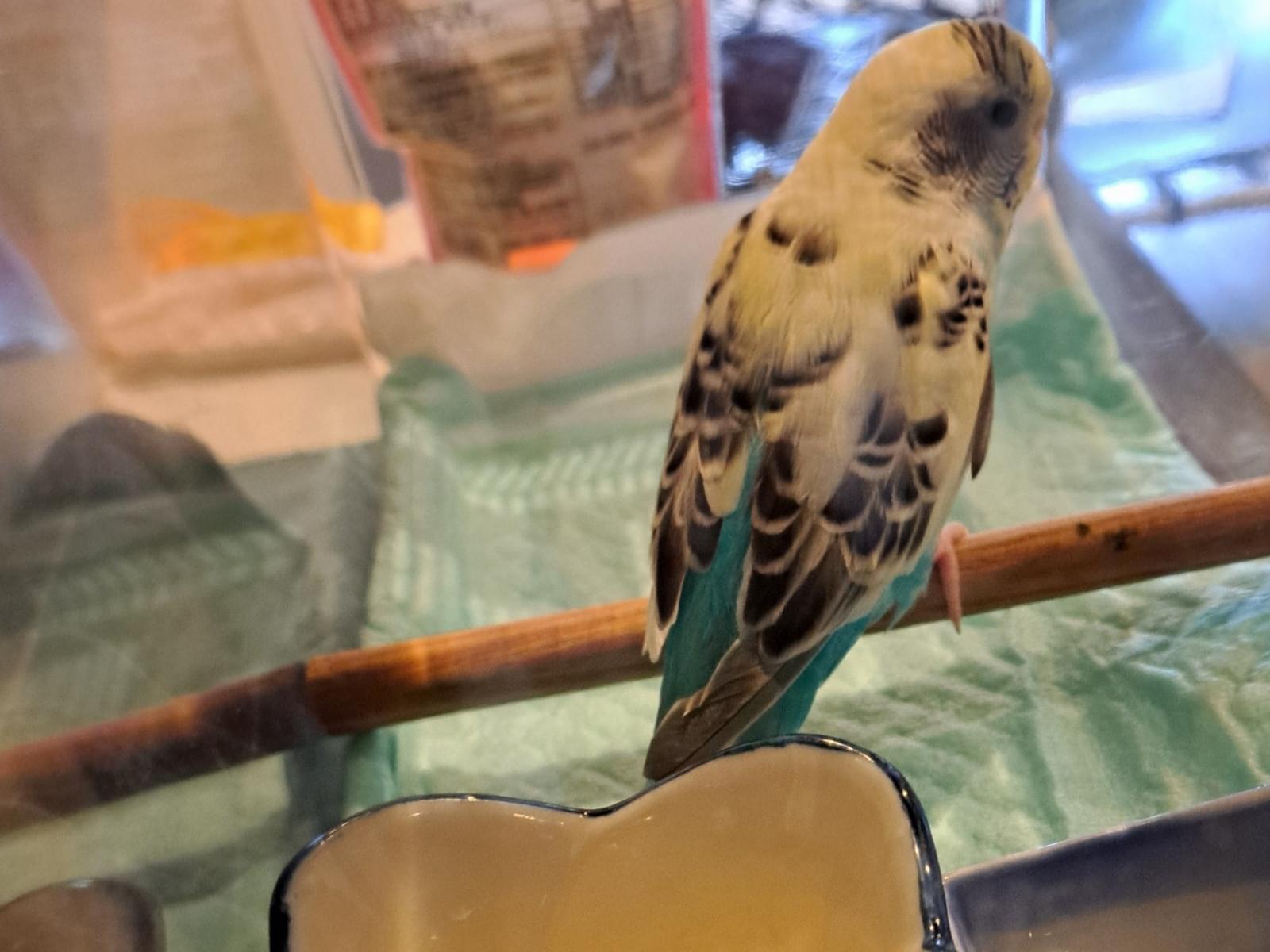 白多めのレインボーカラーのセキセイインコを保護しました。