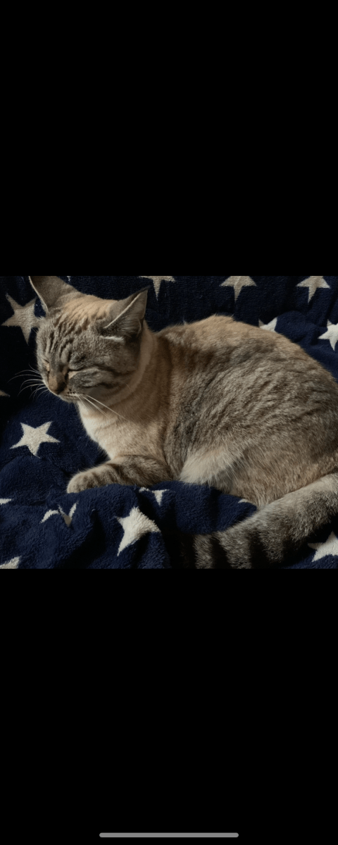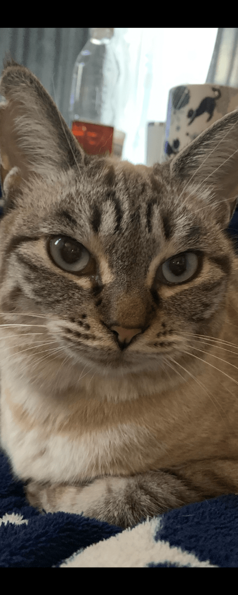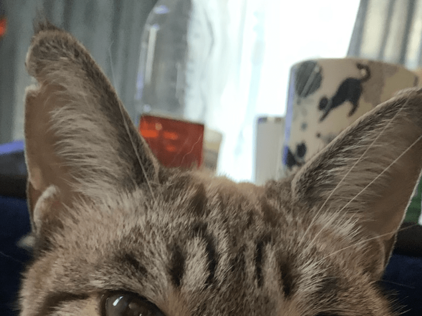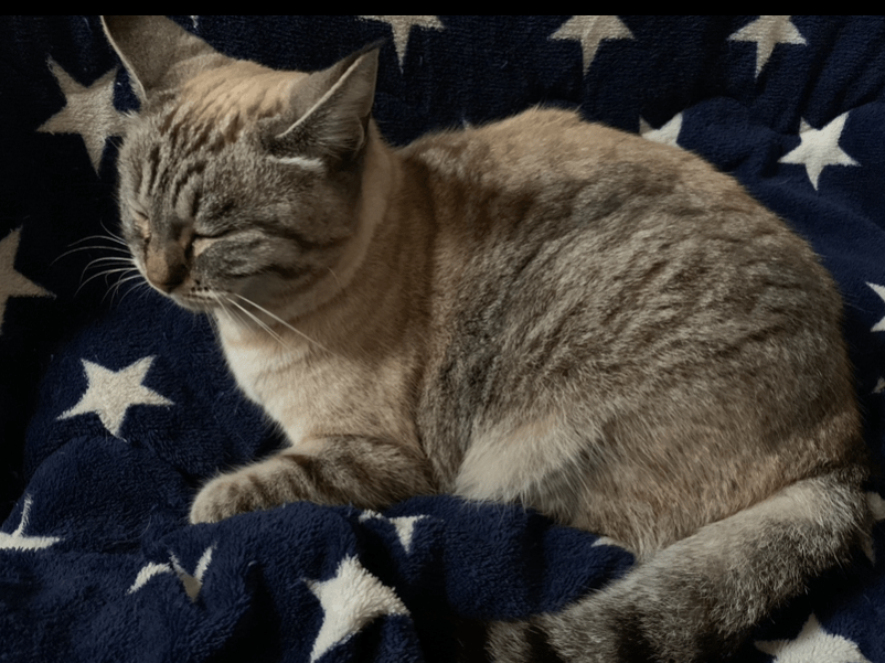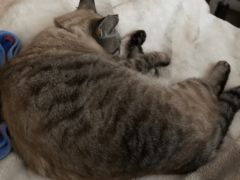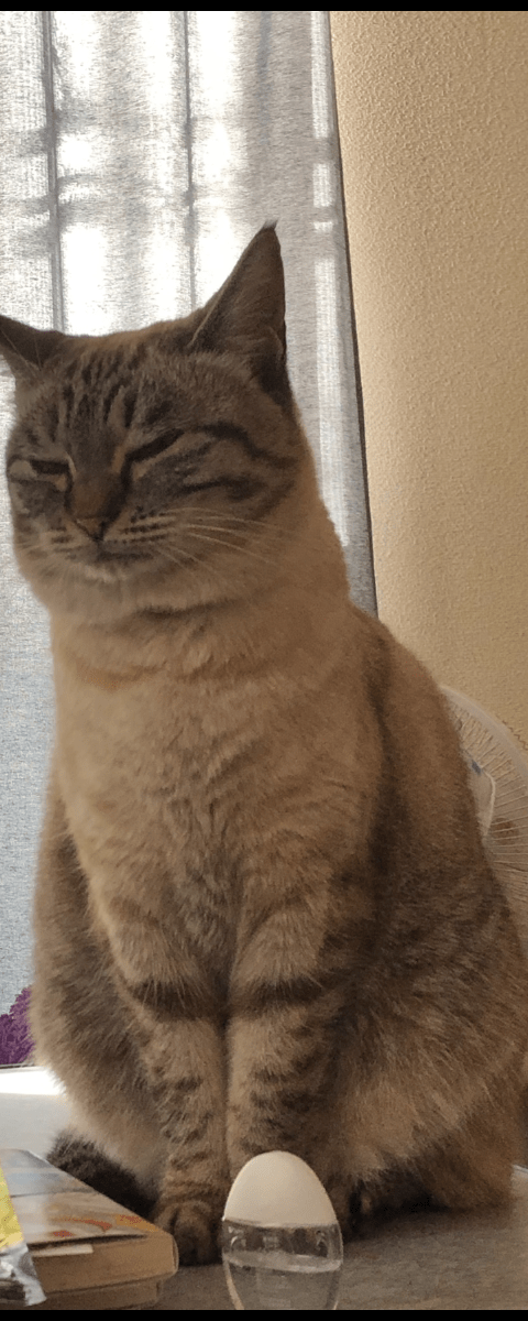 右耳に切り込み傷があり、ピンクの虫除けの首輪をしています。ベージュに焦茶の縞模様、尻尾は黒とグレーっぽい縞模様です。キジトラっぽくも見えます。