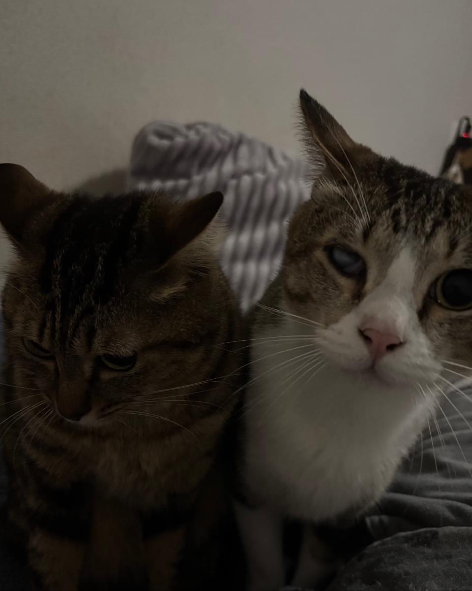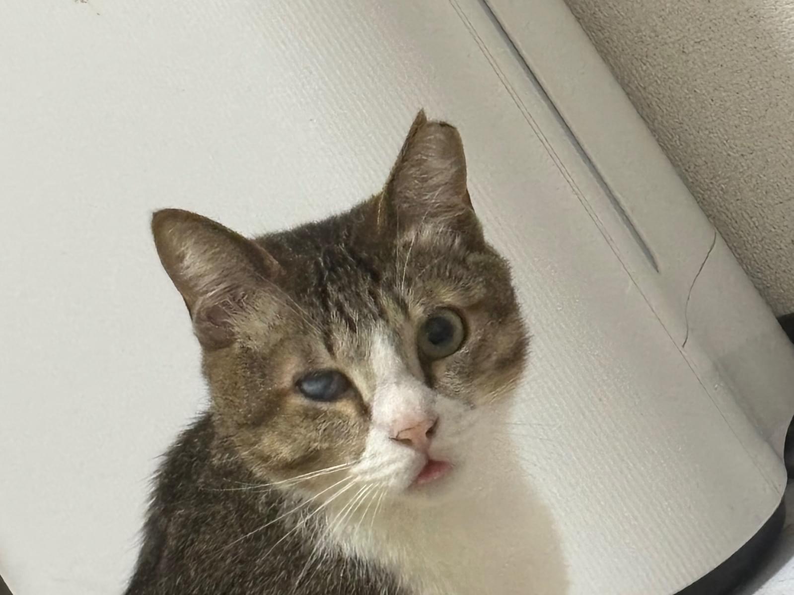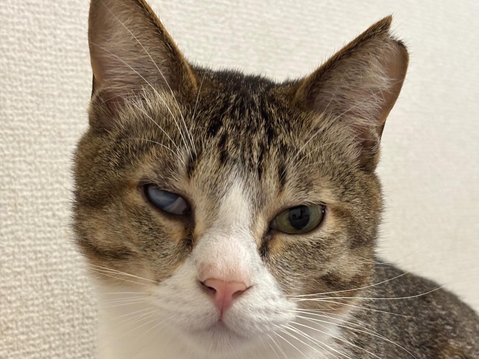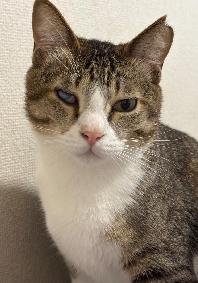 キジトラのオス猫、警戒心が強いかもしれません。左目が猫風邪の影響で見えてません。