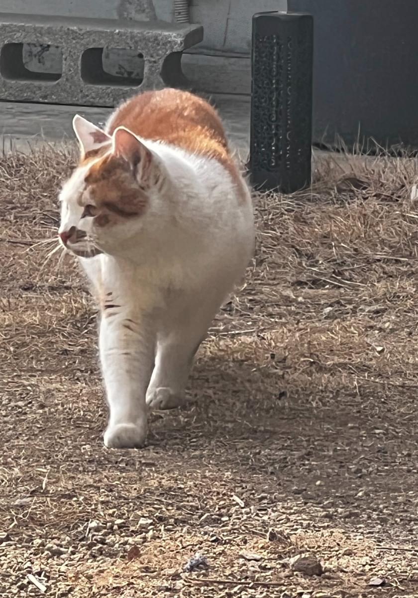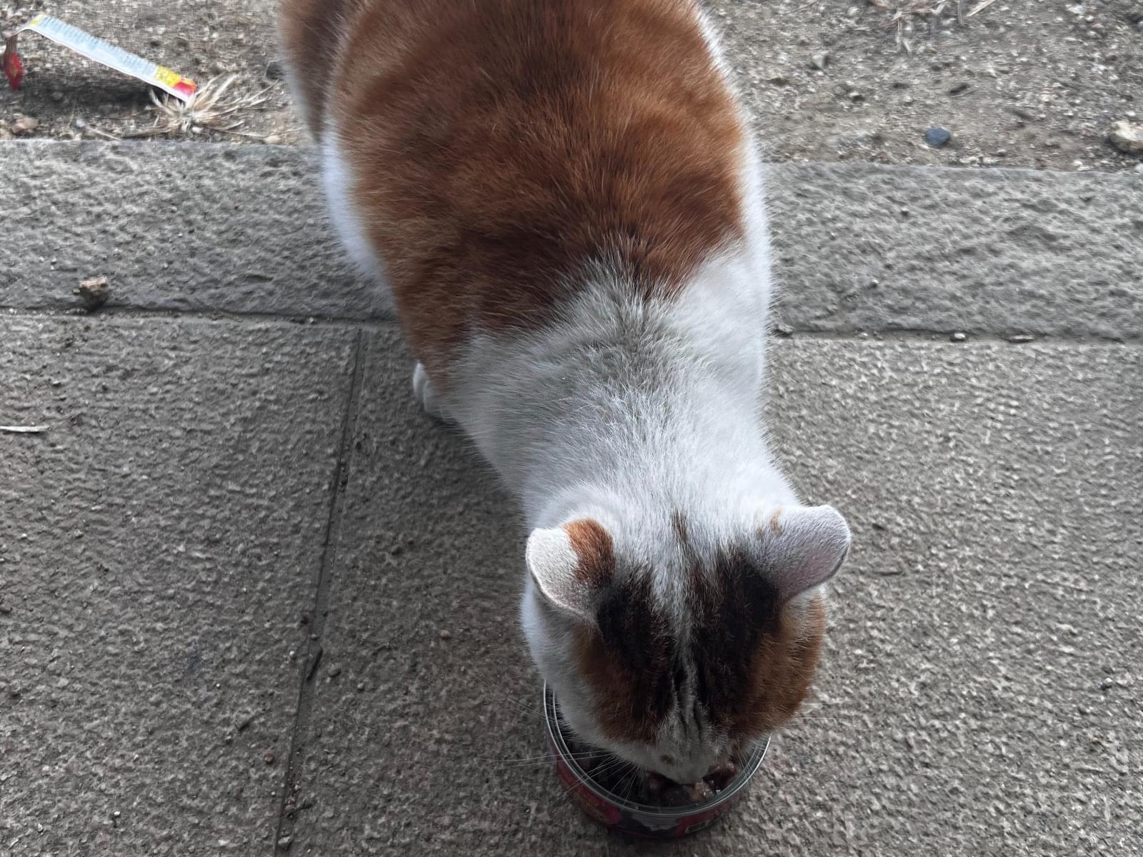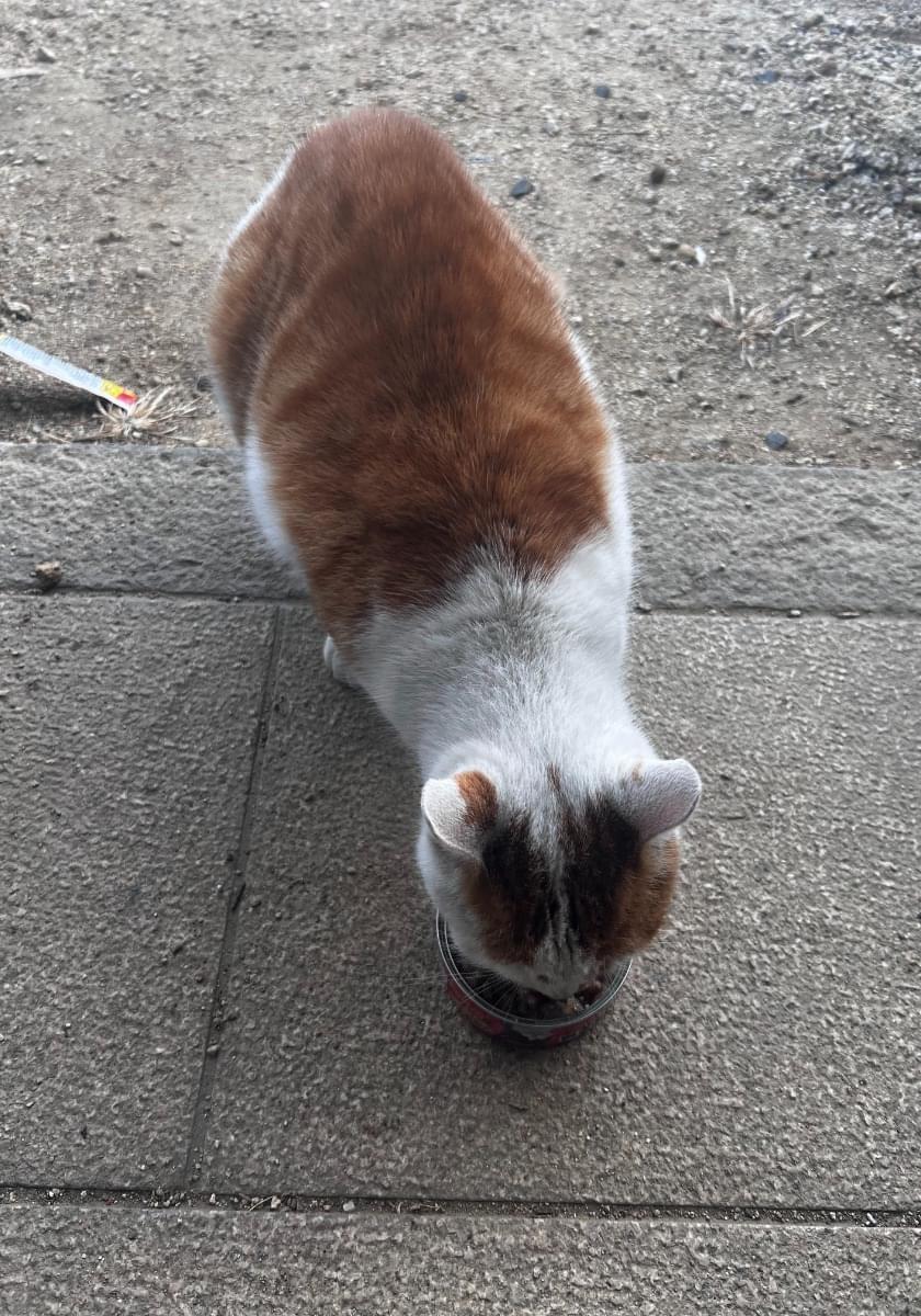 家の前に見た事ない猫がいたので、声をかけると高い声で鳴きながら近づいてきた。ご飯(チュール、猫缶)をあげたら声を出しながら食べる。