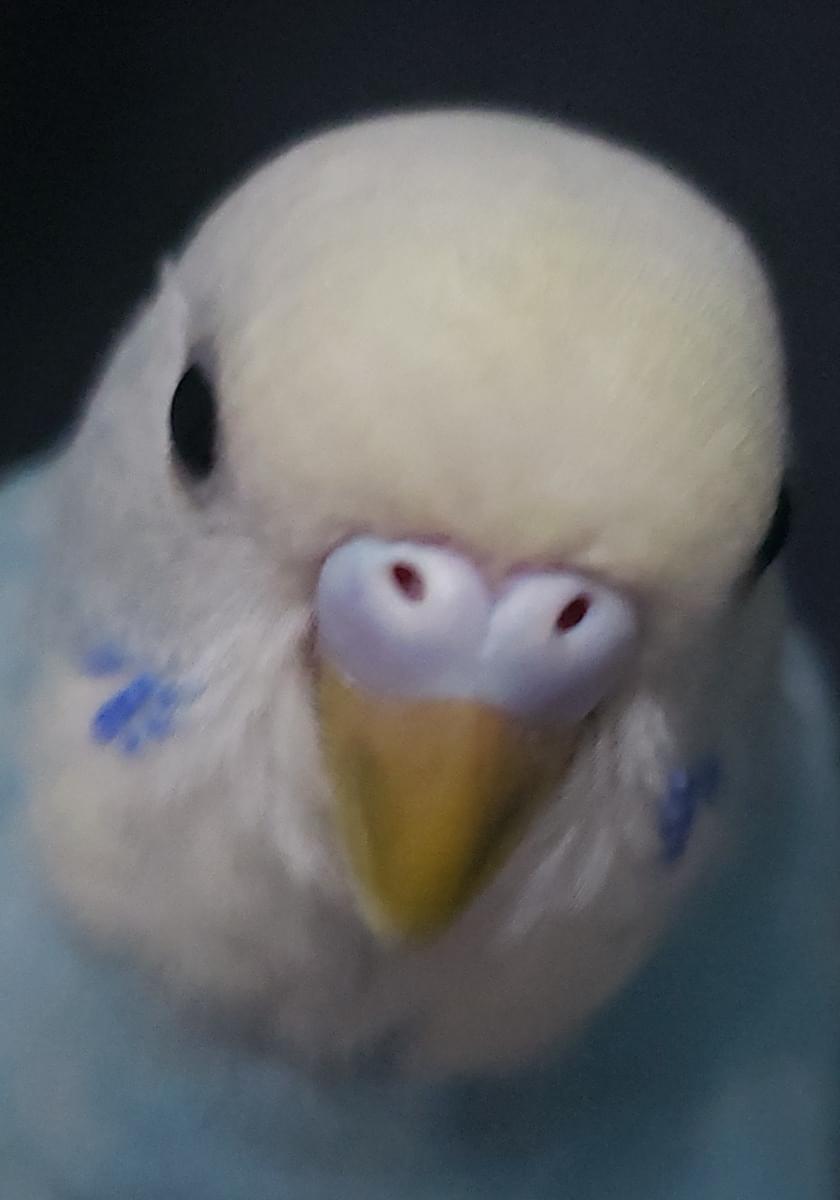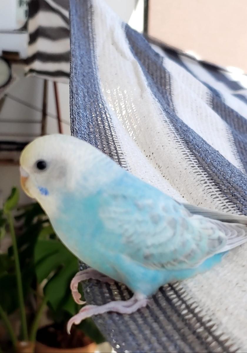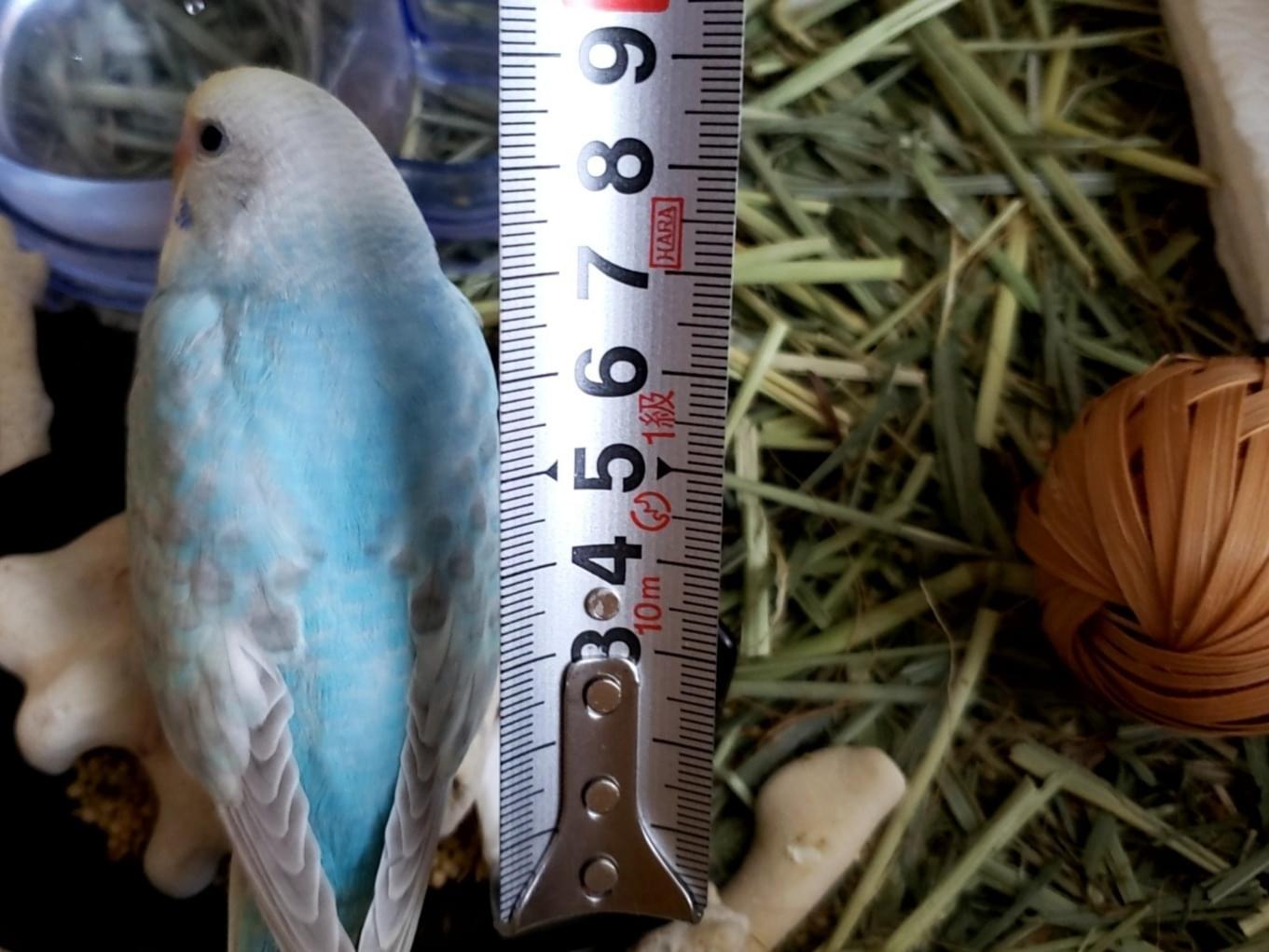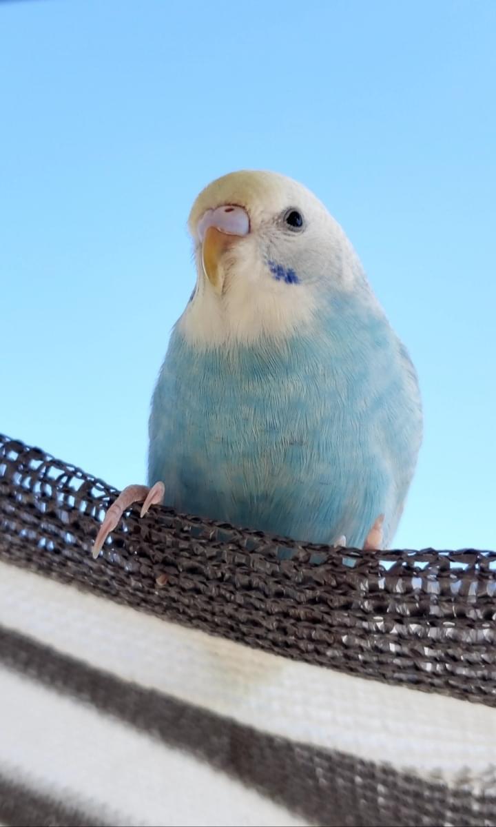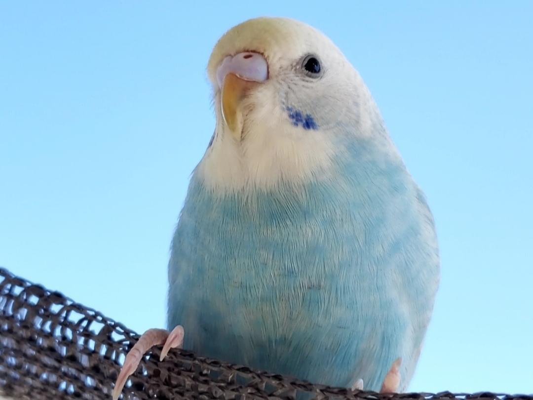 全身淡い色彩。空色のような青色ボディ、羽先・目横グレー色、尾毛はグリーン、尾先は黄色。