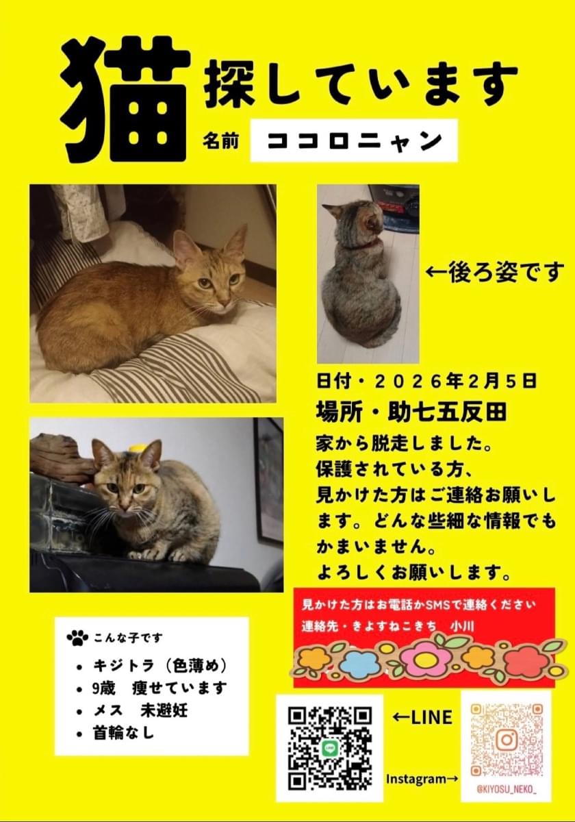 ホーム迷子猫愛知県キジトラの細い女の子…キジトラの細い女の子を探してます!管理編集するポスター掲載終了最終更新日時:2026/02/13 09:09写真情報用件迷子名前ココロニャン性別メス年齢9さい場所愛知県 清須市助七発生日時2026年2月5日(木)飼い主きよすねこきち 小川説明・キジトラ ・女の子 ・細い ・首輪無し連絡先URL未設定掲示板情報交換のための掲示板です。ユーザーからの情報提供、オーナーからの連絡などにご利用下さいませ。書き込んだ情報は、オーナーのメールに通知されます。まだコメントはありません。トピックを作成する