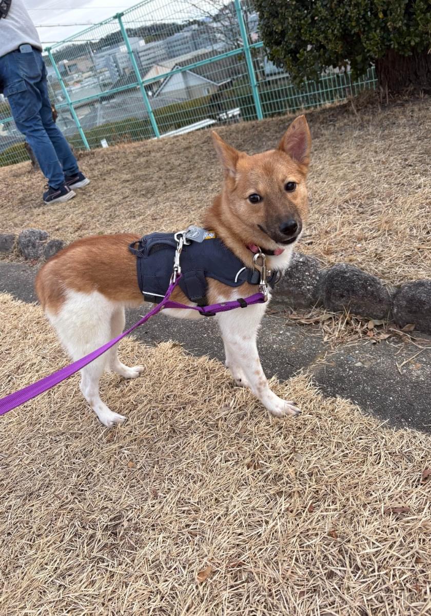 ハーネス、首輪、肩掛けリードを装着。途中で外れている可能性もあります。