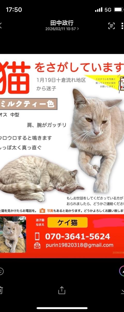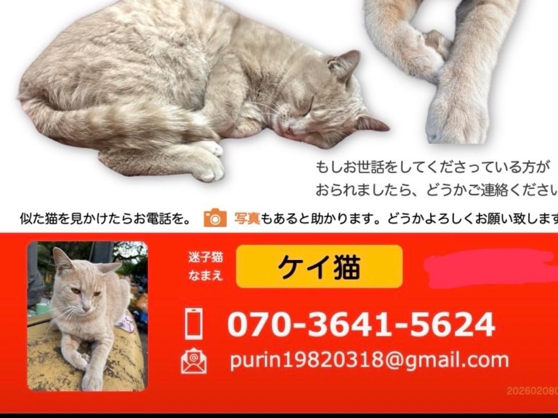 ケイ猫大切な家族存在です。特徴おおらか、臆病もあり。首輪無し。いつも庭でよくウロウロした甘えん坊性格だったです。不安もあるので鳴く時もあります。ケイ猫が似た猫目撃些細なでも良いので連絡お願いします。