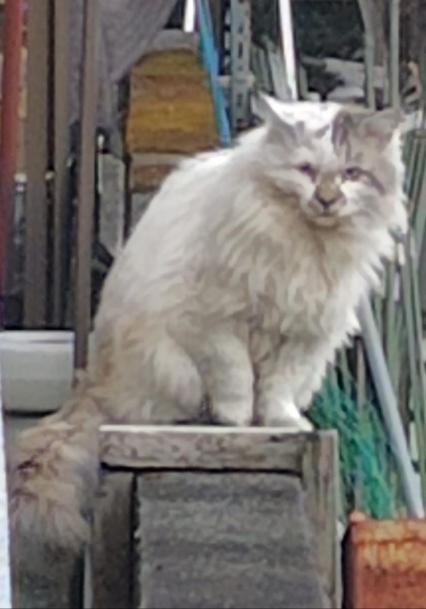 白い毛の長めの猫さんです。左耳から目の辺り、お鼻の周りが灰色っぽいです。首輪の有無は確認出来ていません。