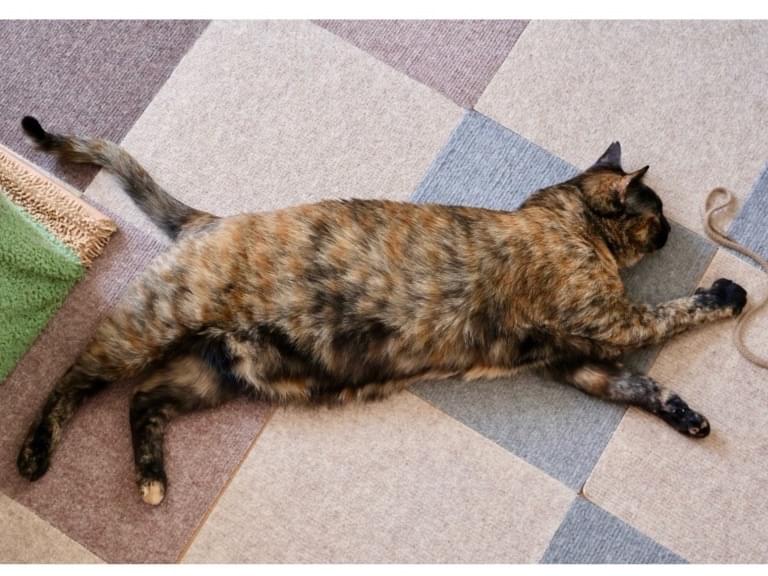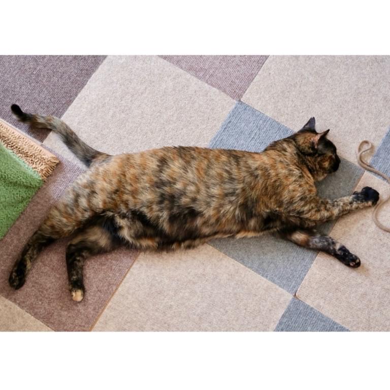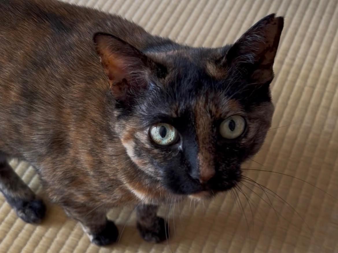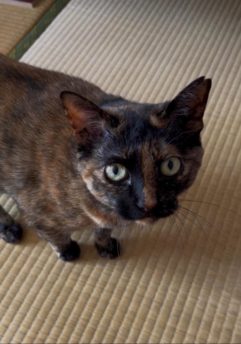 目:黄色と緑が混じったような色。目の中にサビ模様が入っています。