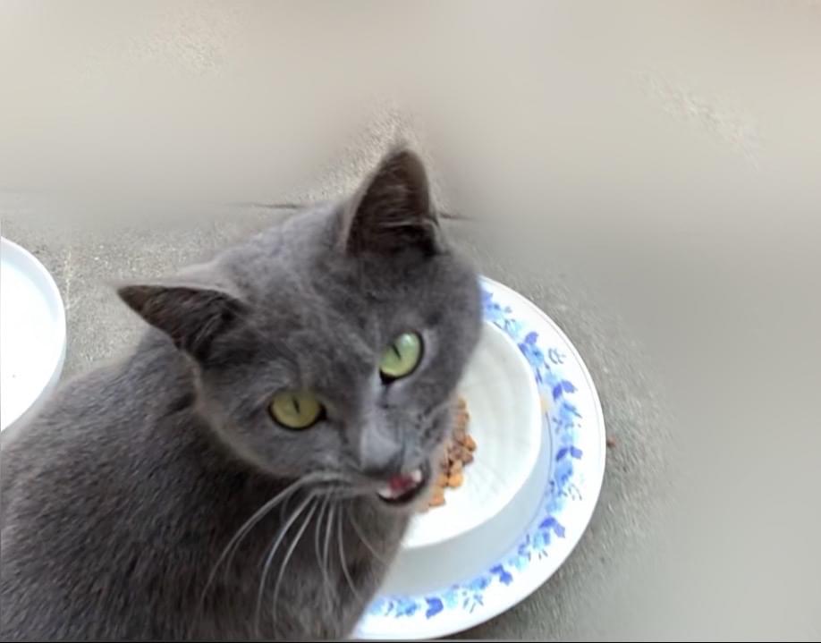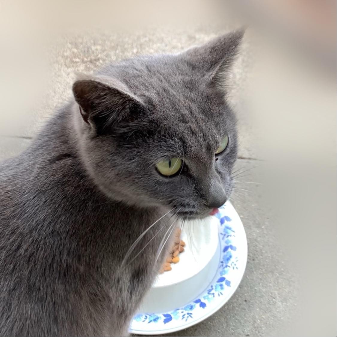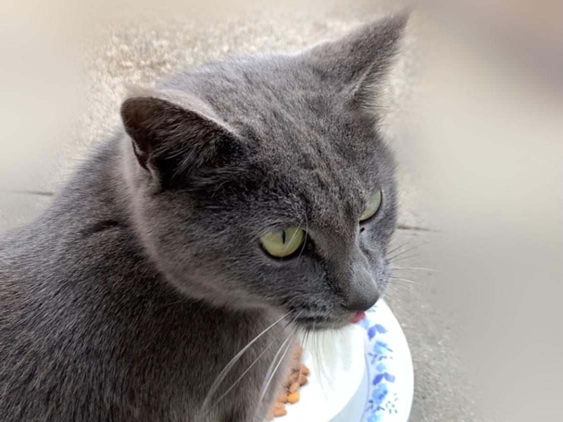 ロシアンブルー系の猫が庭に来ます