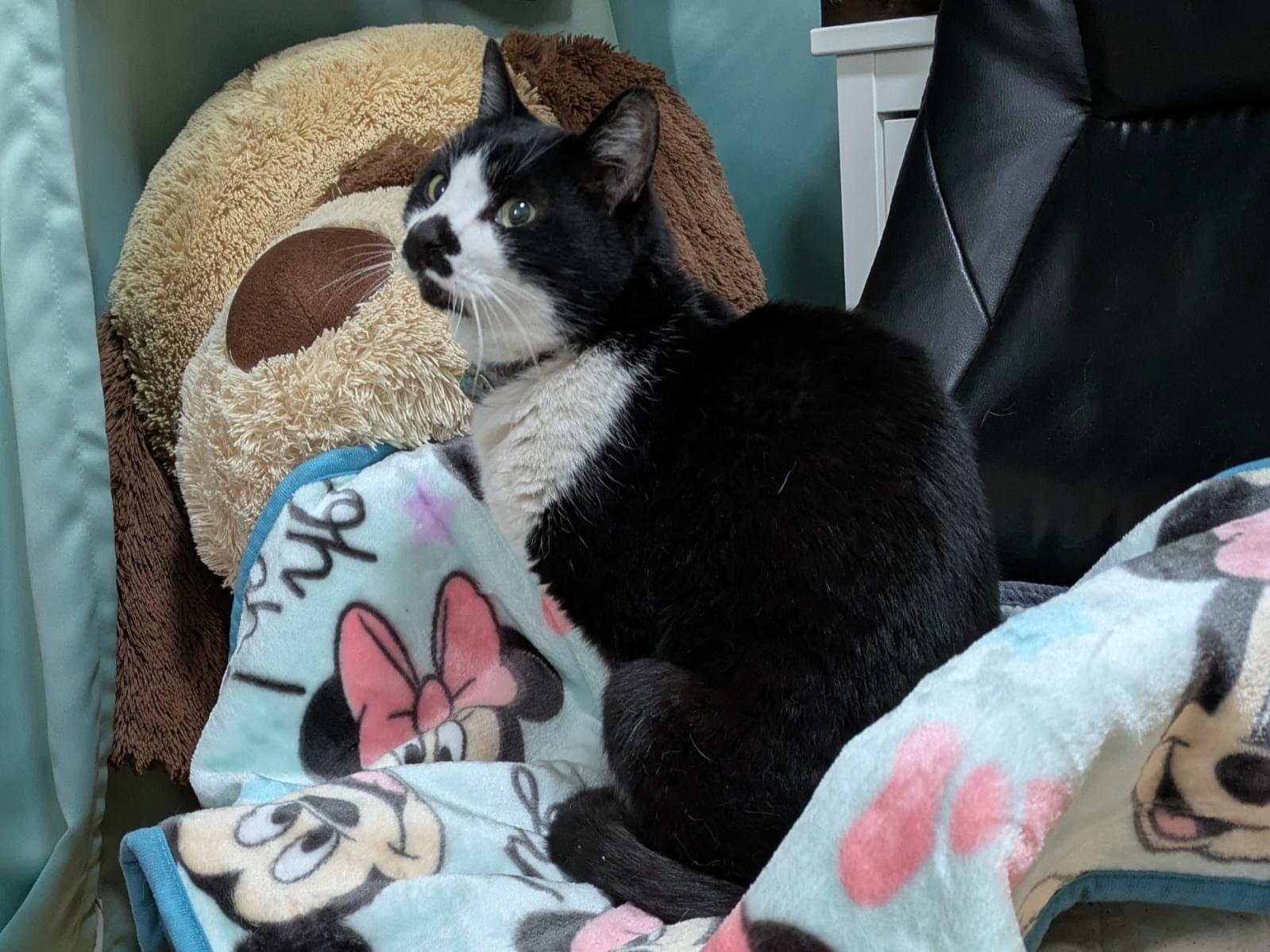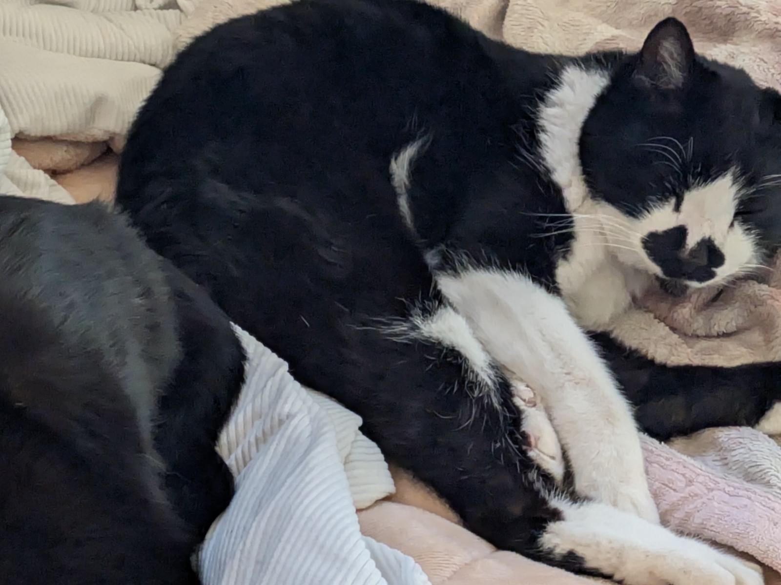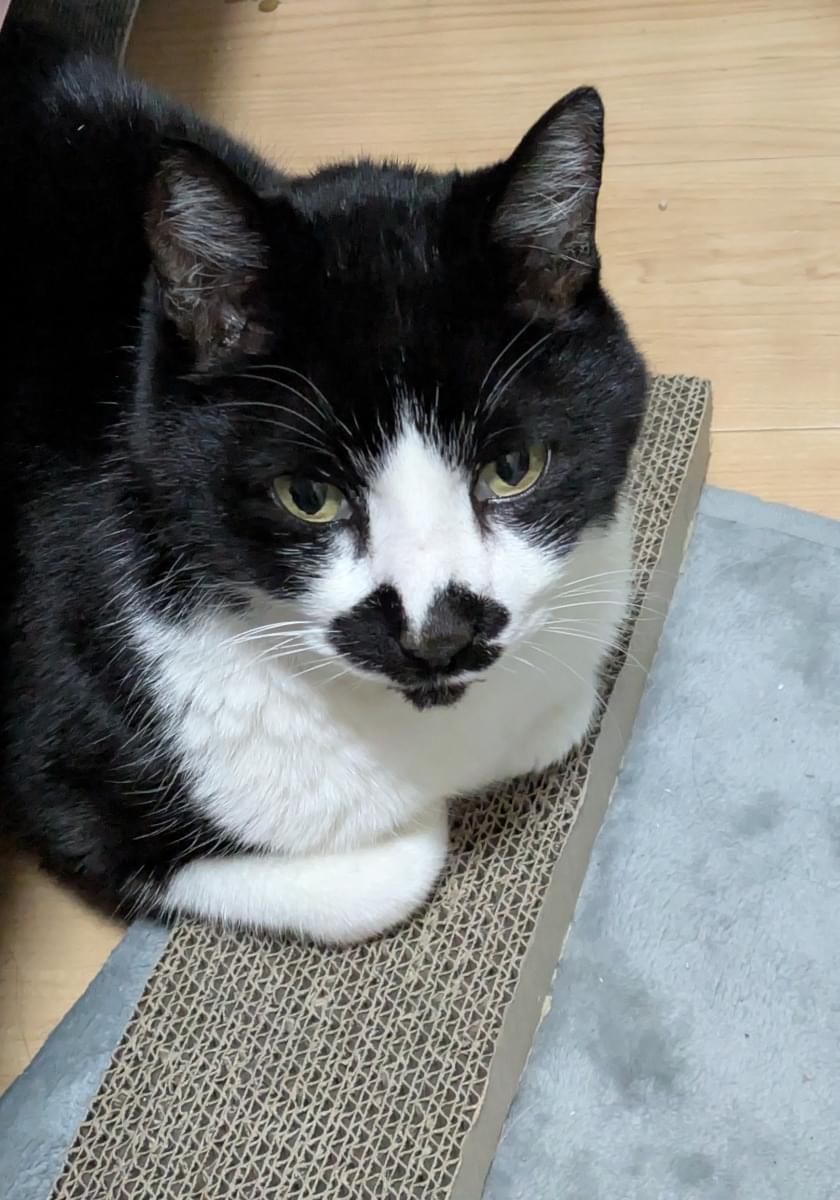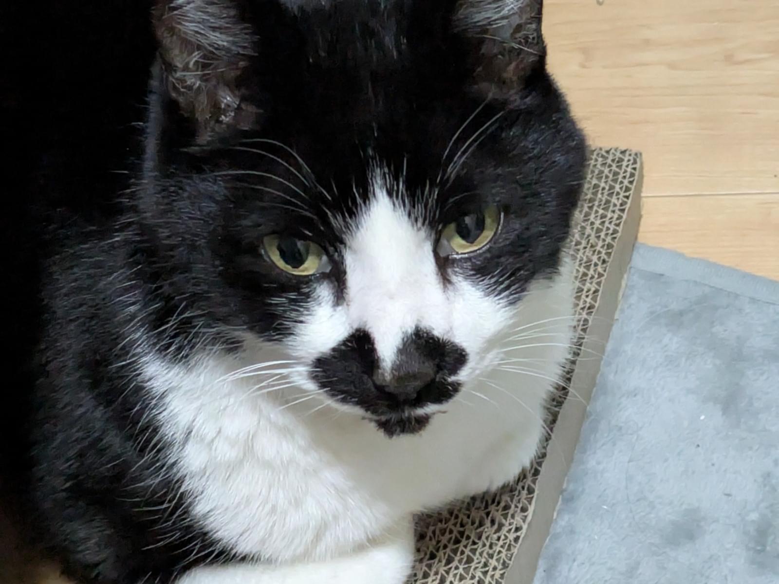 顔はハチワレで、口周りが黒いです。