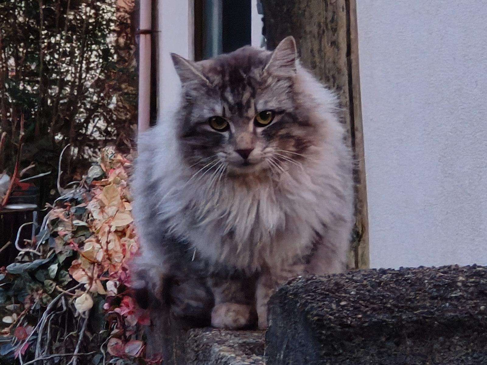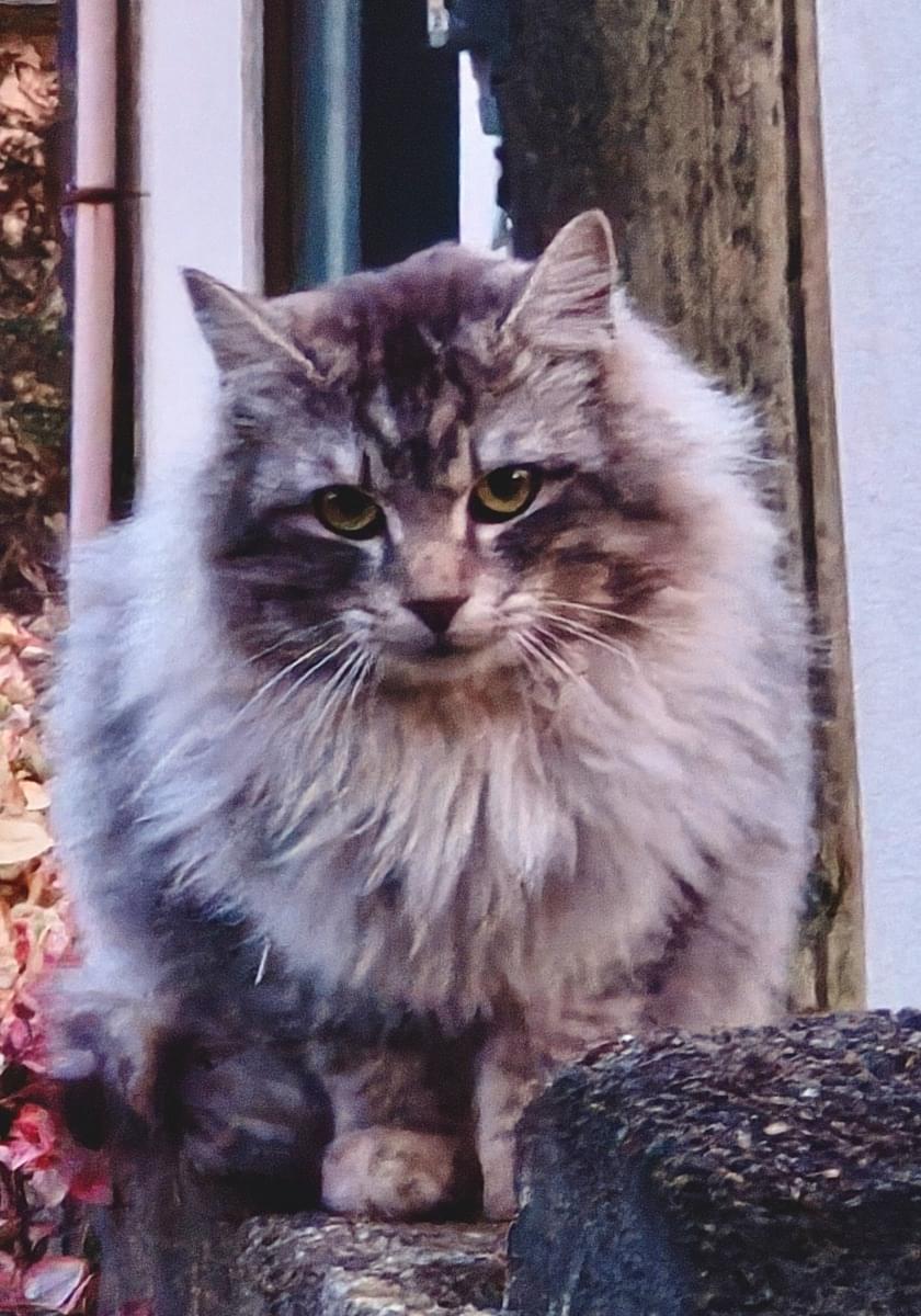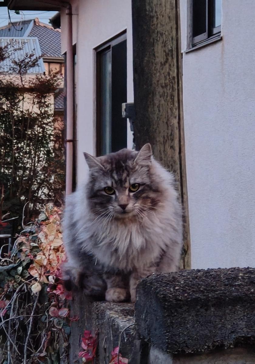 長毛のキジ白です。若干薄い茶色にも見えます。近づいてはきませんが、野良ほど警戒心は強くないので、迷い猫ではないかと思われます。いつも大きな声で鳴きながら徘徊しています。探してる飼い主さんいらっしゃいませんか?