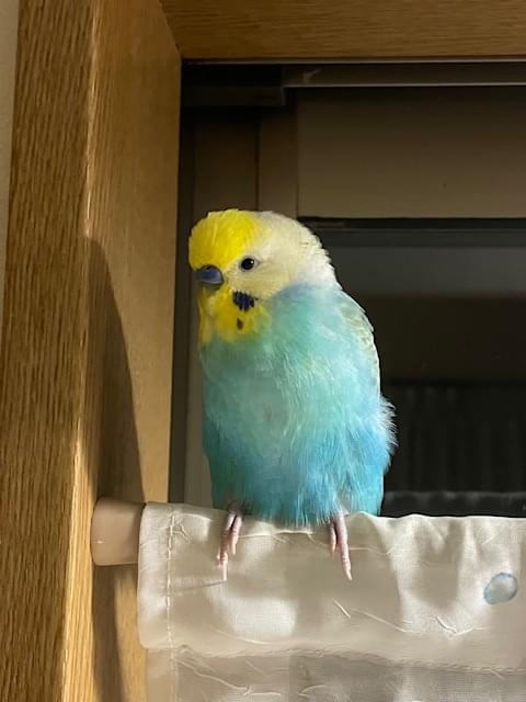 頭は黄色、からだは水色のセキセイインコです。