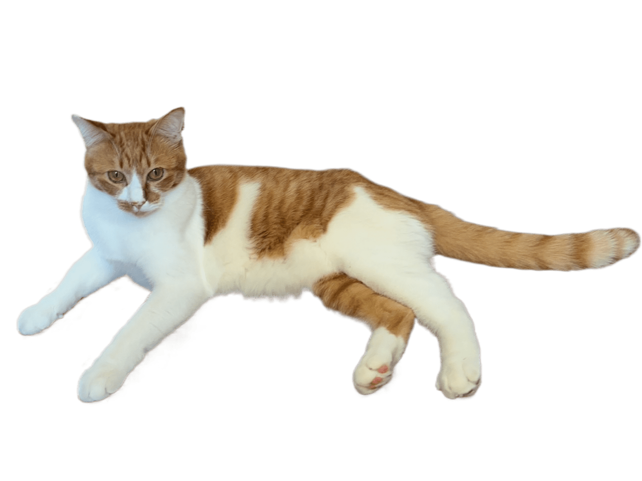 茶白(顔から尾までの背中部分が茶トラ柄、でお腹部分と両手右足が白く、毛は少し長目で長い尻尾が特徴。