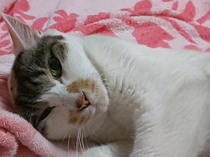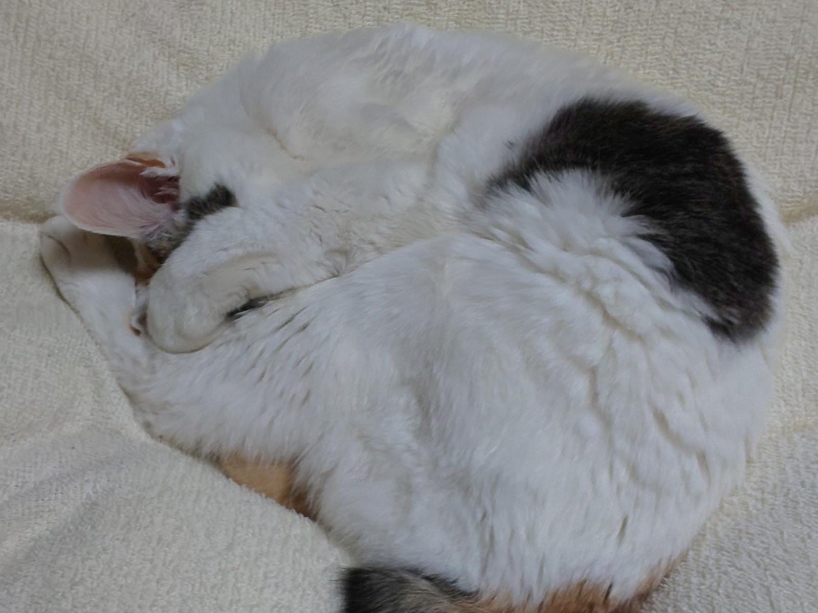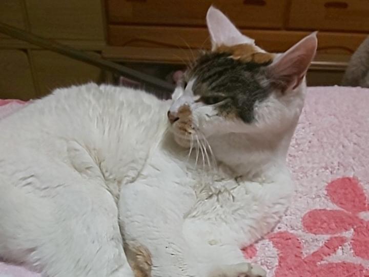 全身は白毛ですが、頭としっぽは三毛で身体の左側にクロトラ柄があります。小さめのネコです。
