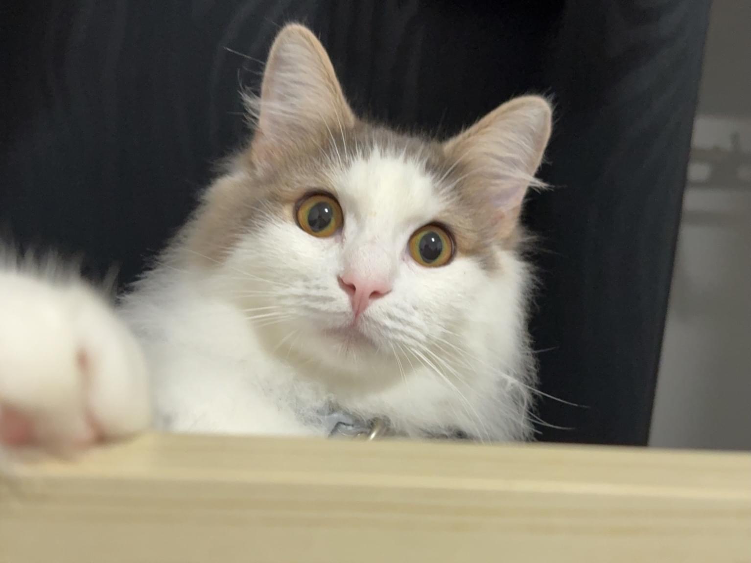毛色はブルーとシルバーと白が混ざっていて、顔がハチワレのような柄です。