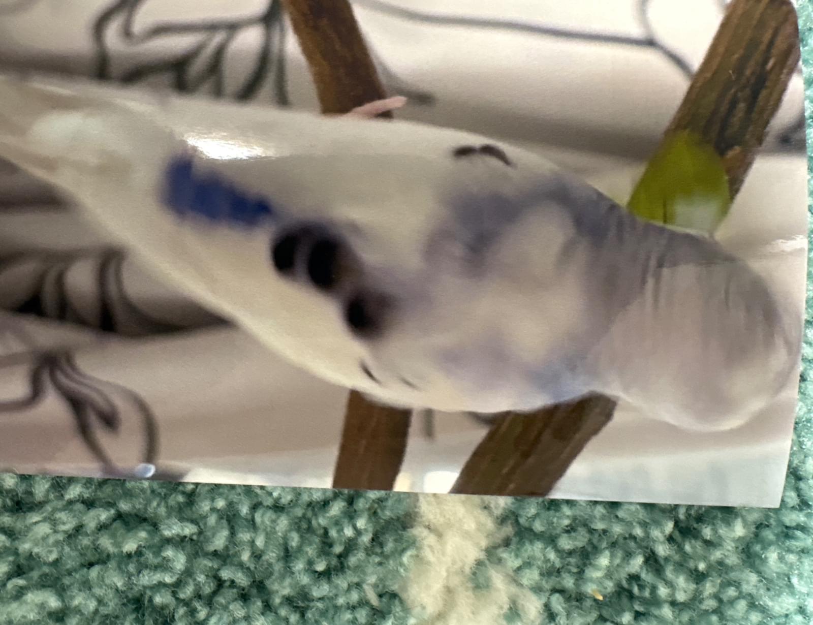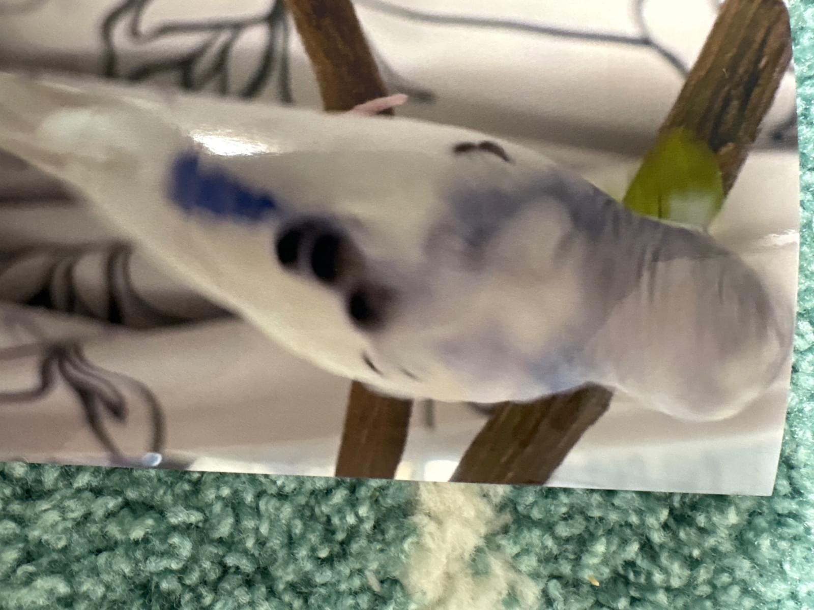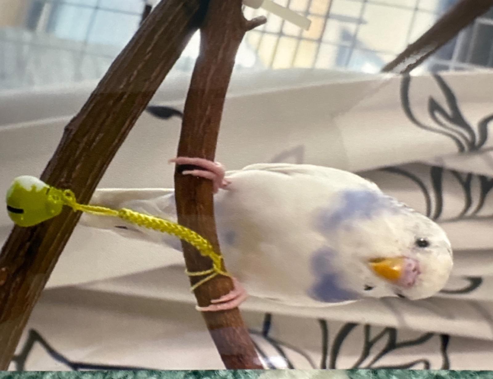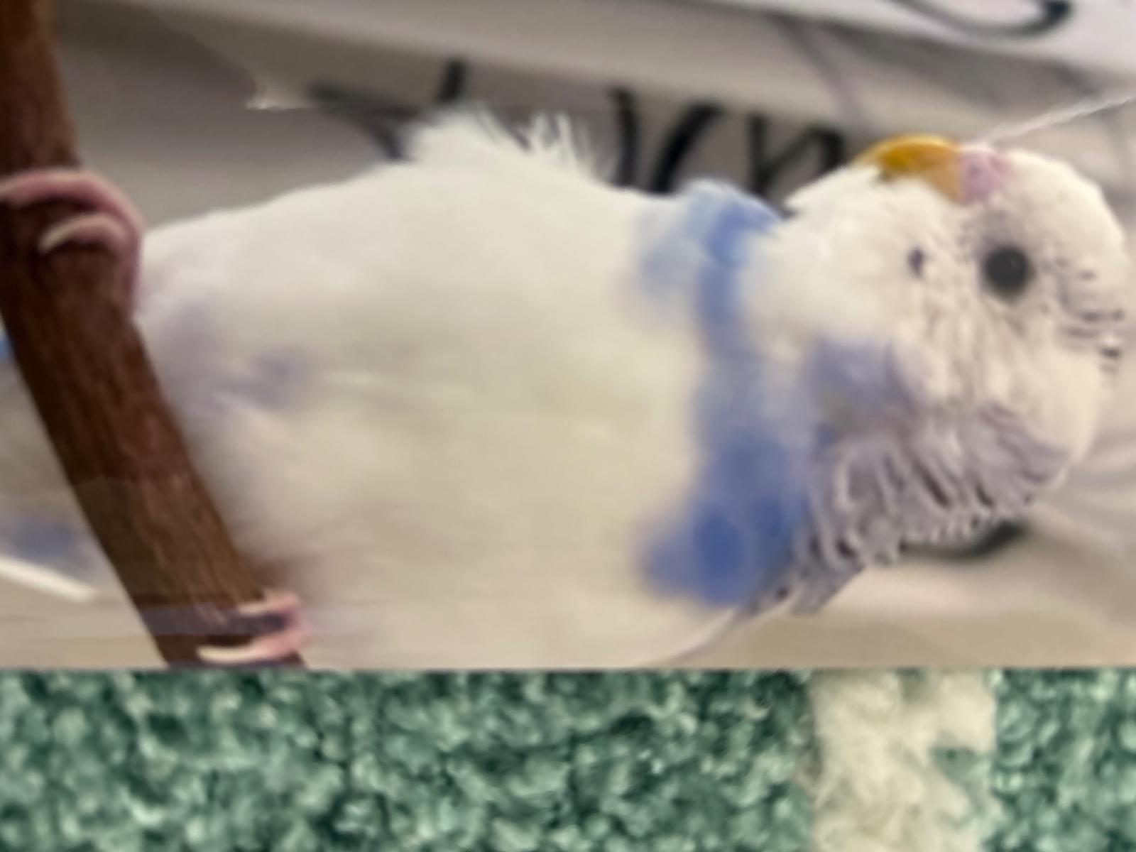 白色で首周りがブルーほっぺに黒の点があります。名前はスズメです。
