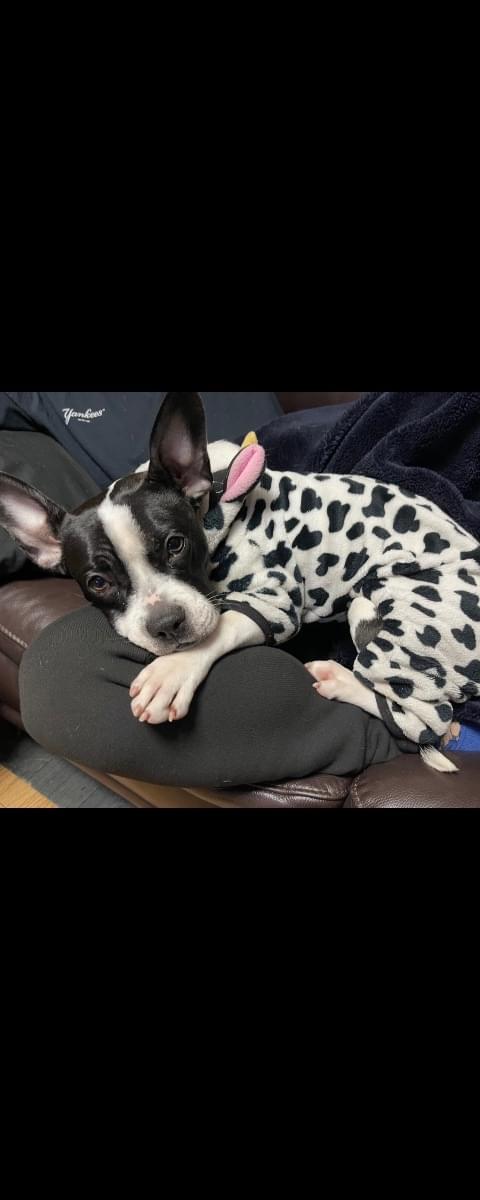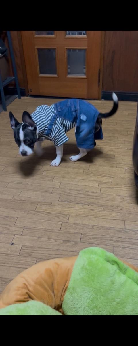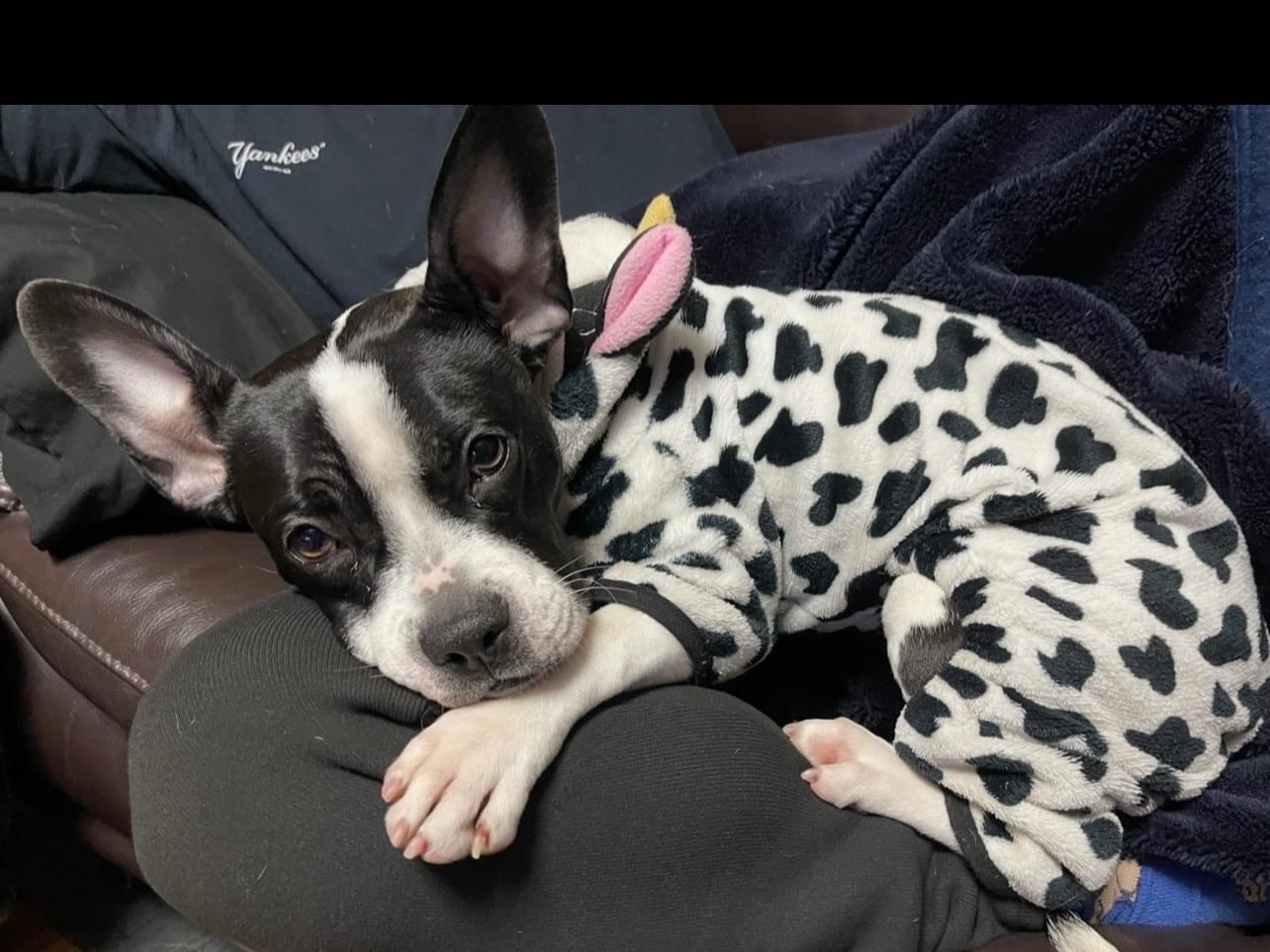 色は黒と白の牛柄、声は子犬で高い、首輪は薄ピンクと黒で銀のエンブレムに名前と電話番号書いてます。