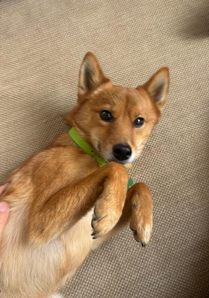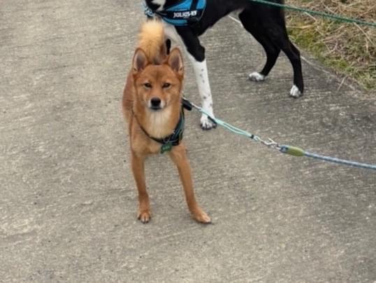 黄緑色の首輪の柴ポメ
