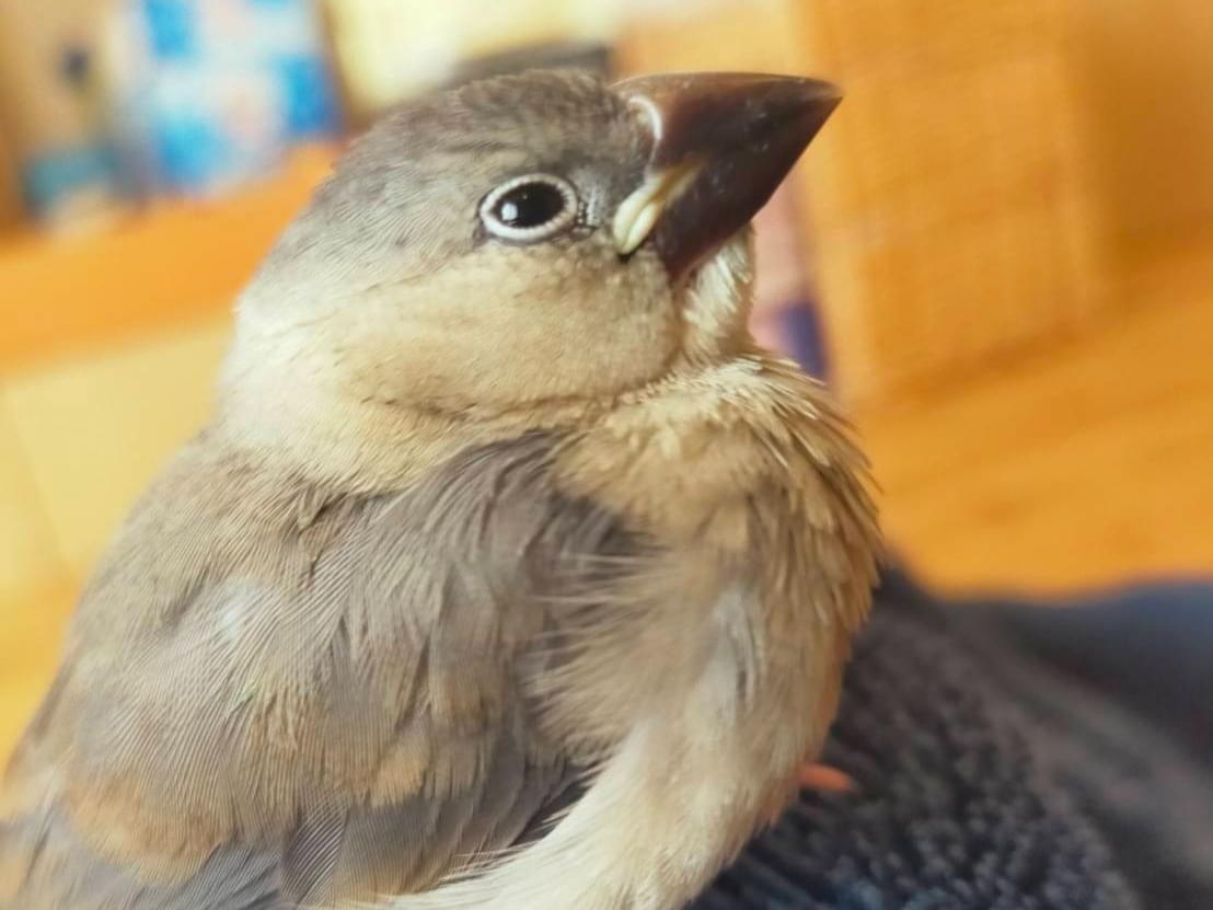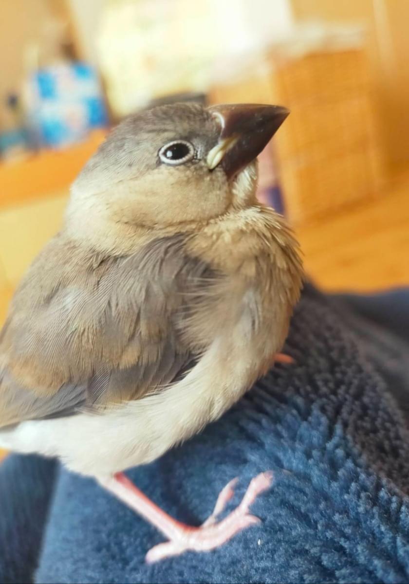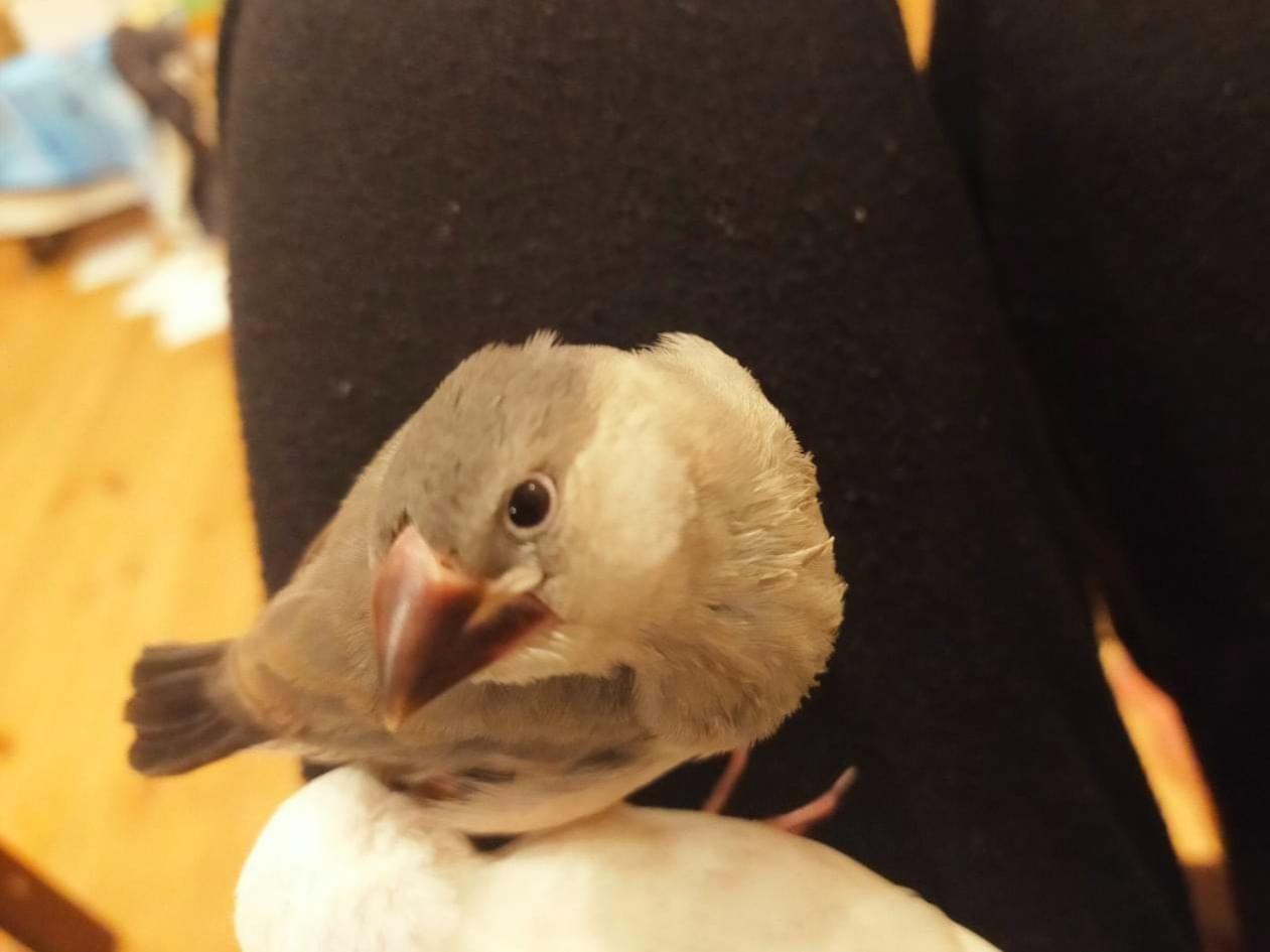 桜文鳥ですが、まだ幼鳥で模様もはっきりしておらず、くちばしもまだ黒いです。