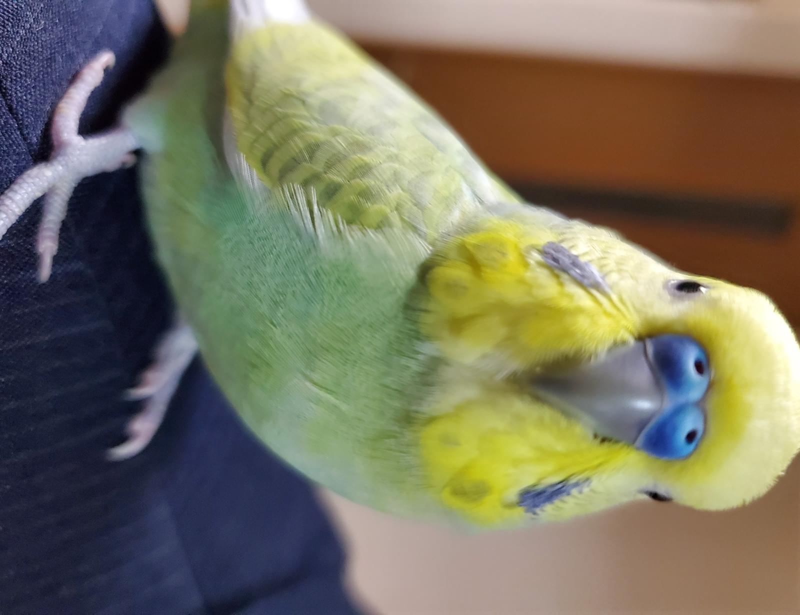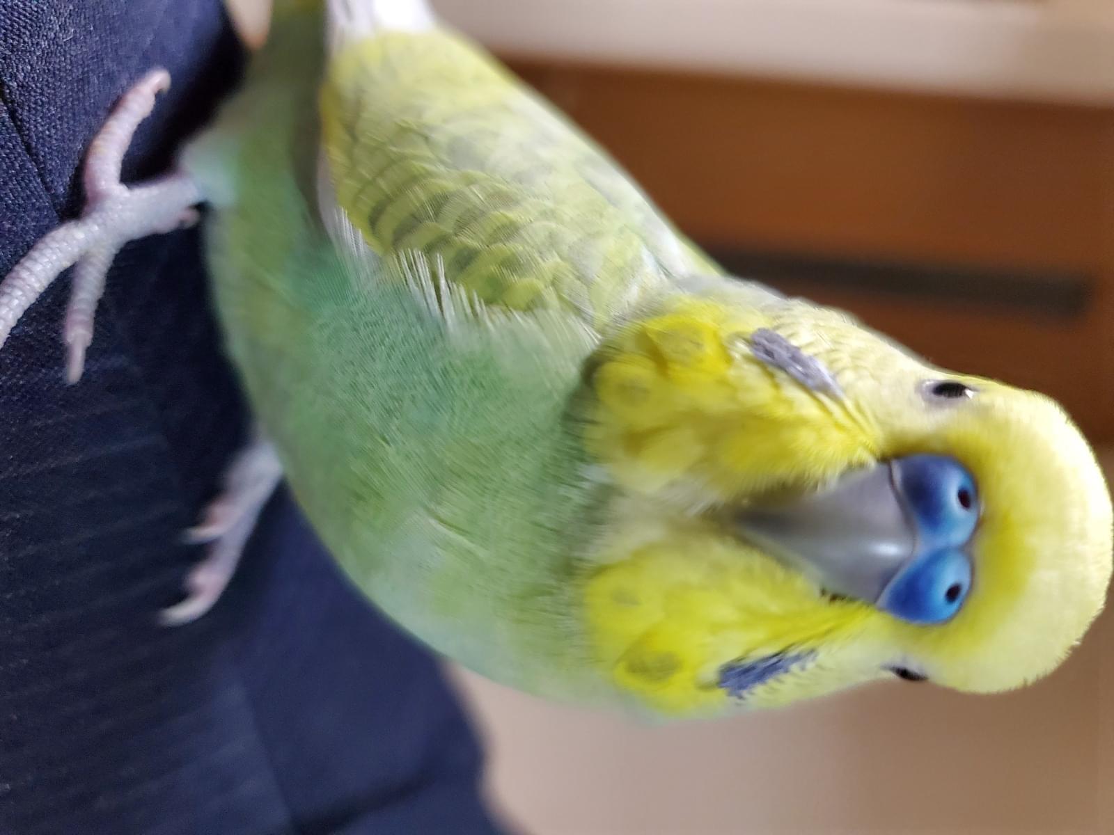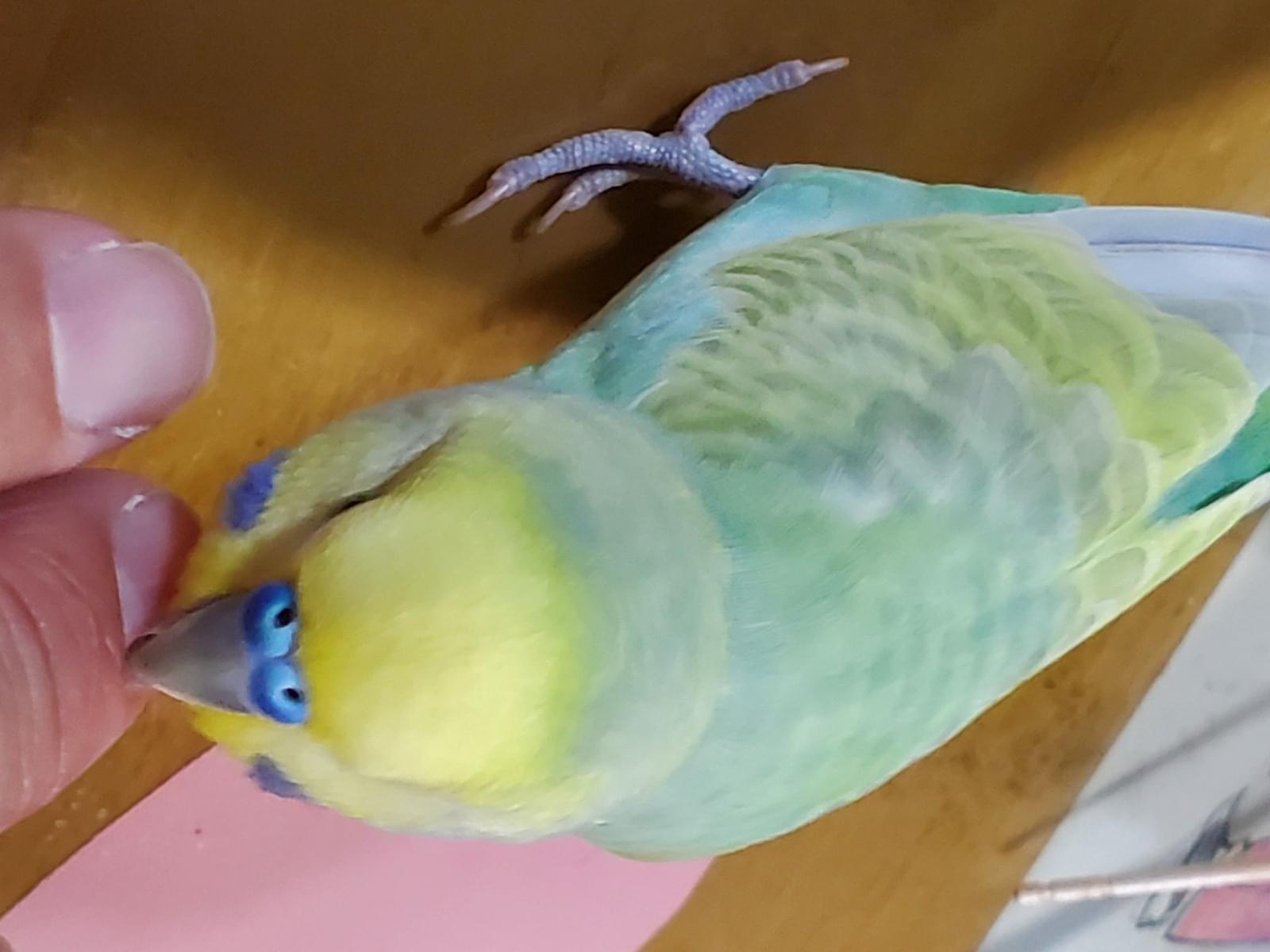 体が薄い緑で、頭が黄色、鼻が青いセキセイインコを探しています