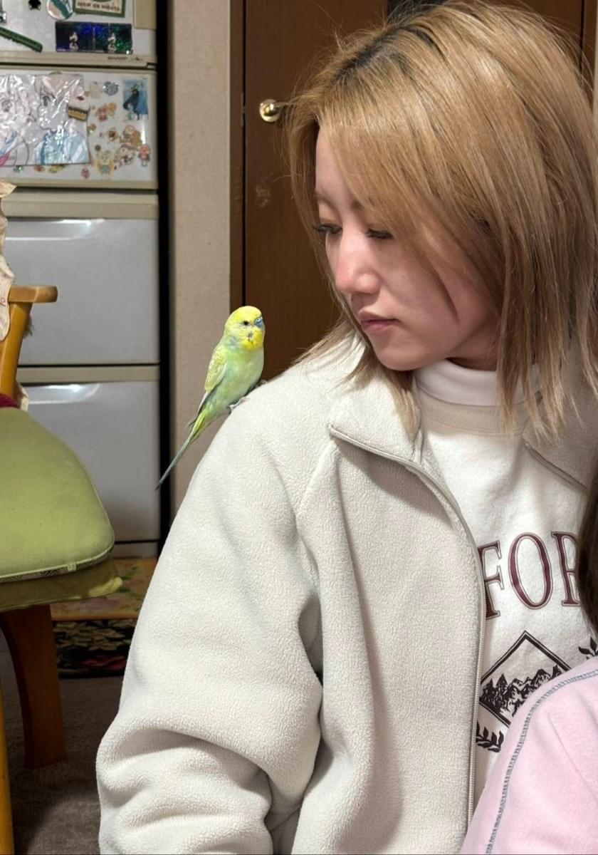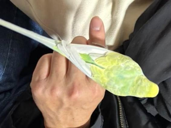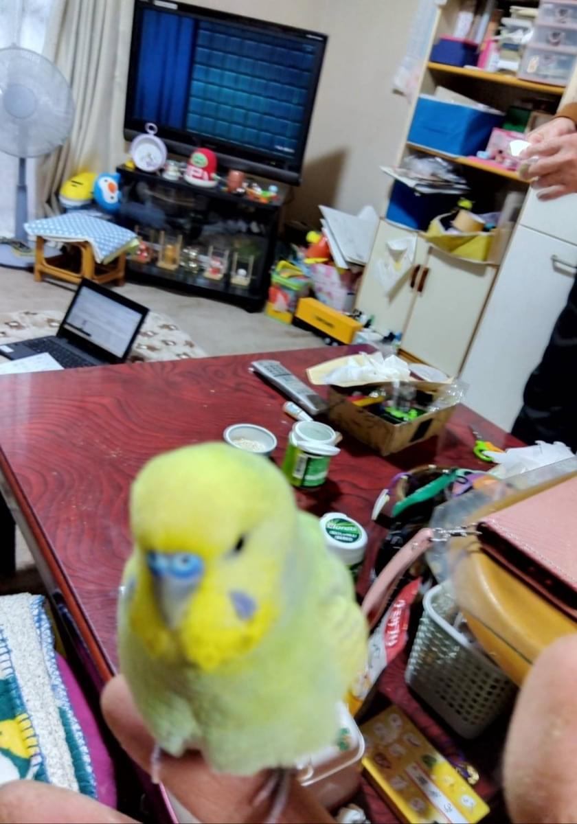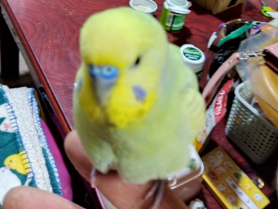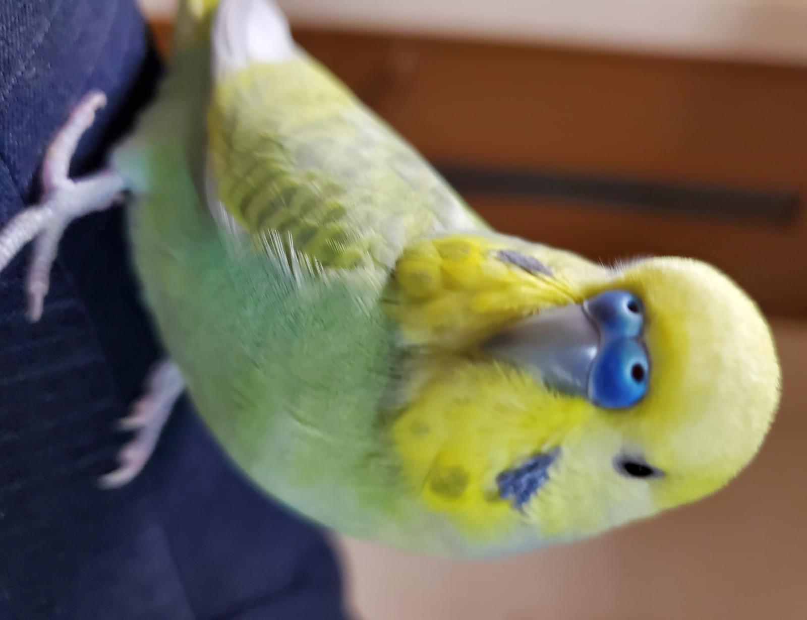 体が薄い緑で、頭が黄色、鼻が青いセキセイインコを探しています