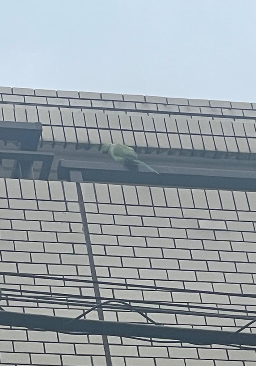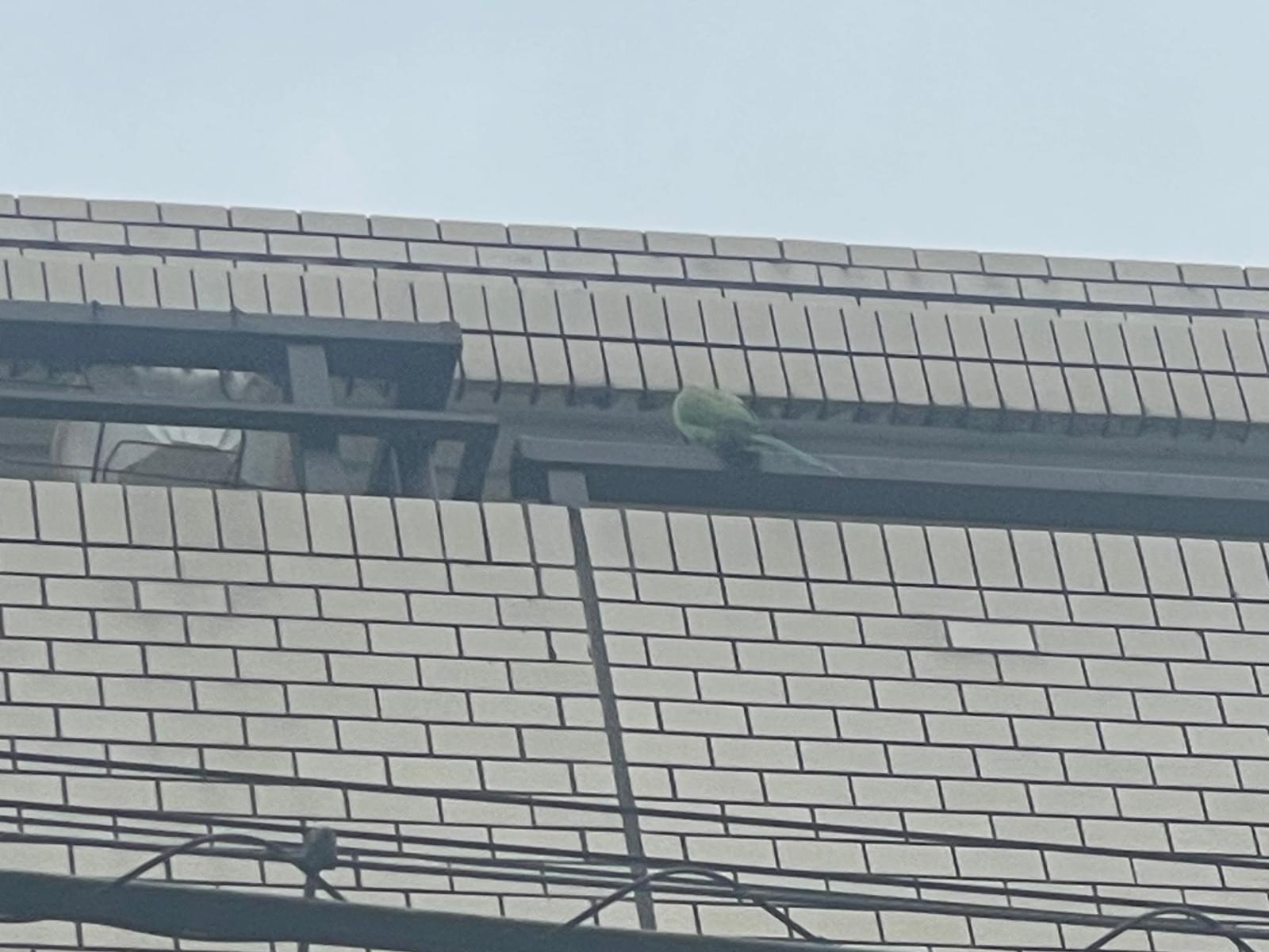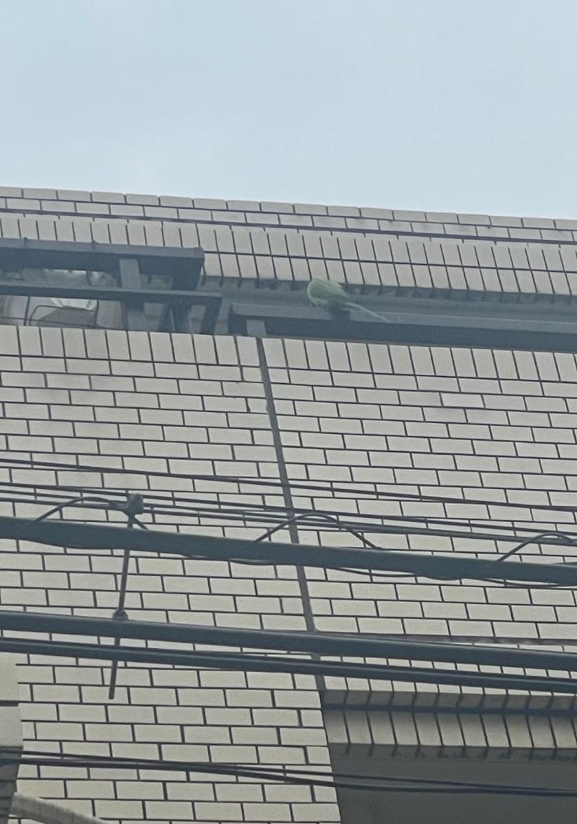 緑色の鳥(セキセイインコ)が飛んでいるのを目撃しました。飛んでマンションのベランダの柵部分に止まりました。その方のペットならいいのですが、、