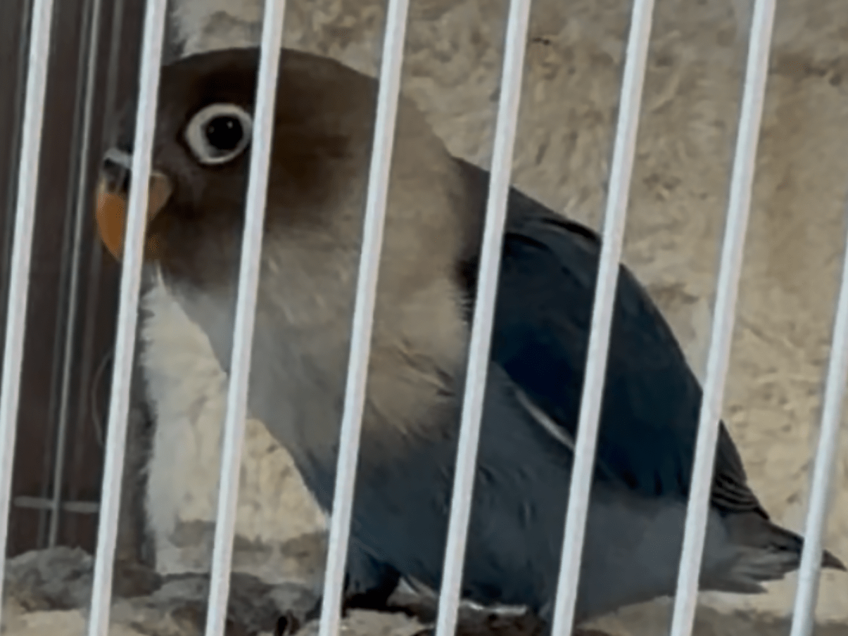 頭は暗い灰色で首に白い襟巻きを巻いているように見えます。お腹は水色、背中は濃いブルーで目の周りに白い輪があります。尾羽が短くずんぐりしておりコザクラインコに似た小さなインコです。2月28日12時過ぎ頃風切羽を切っていますが音に驚いて飛んで行ってしまいました。