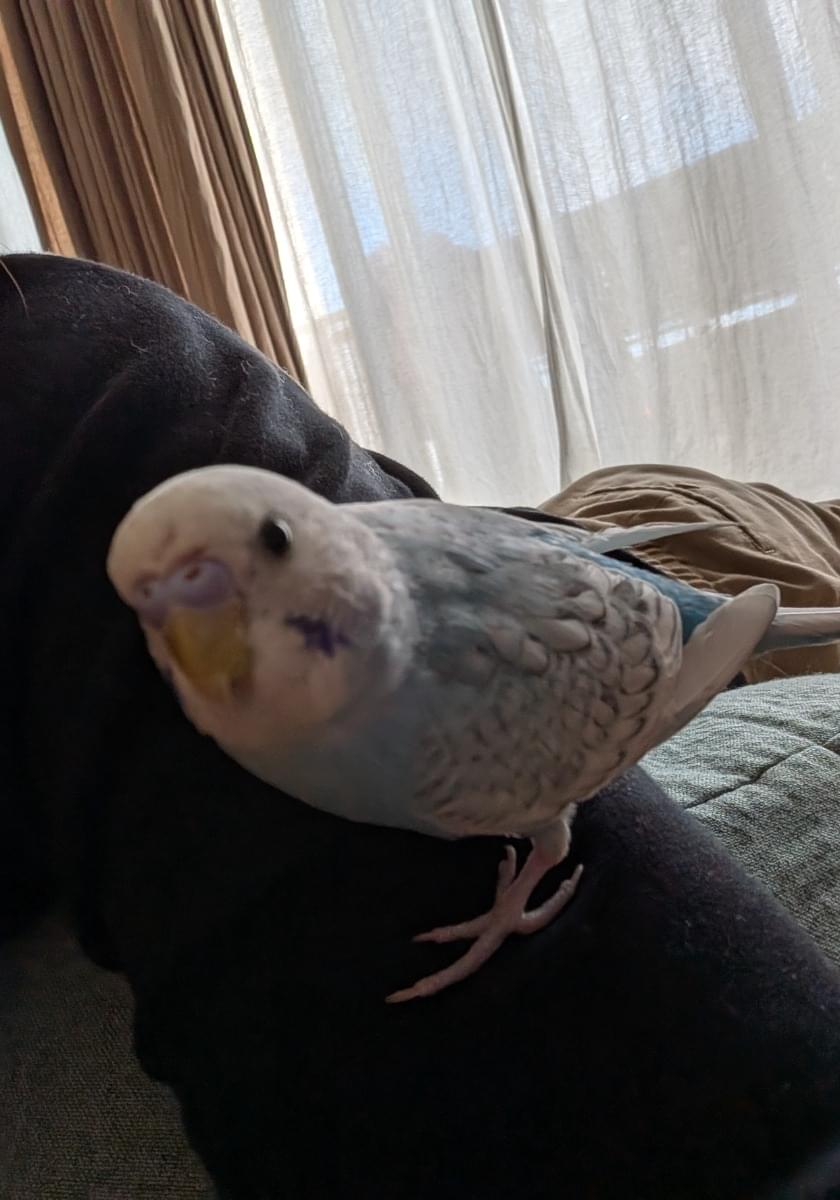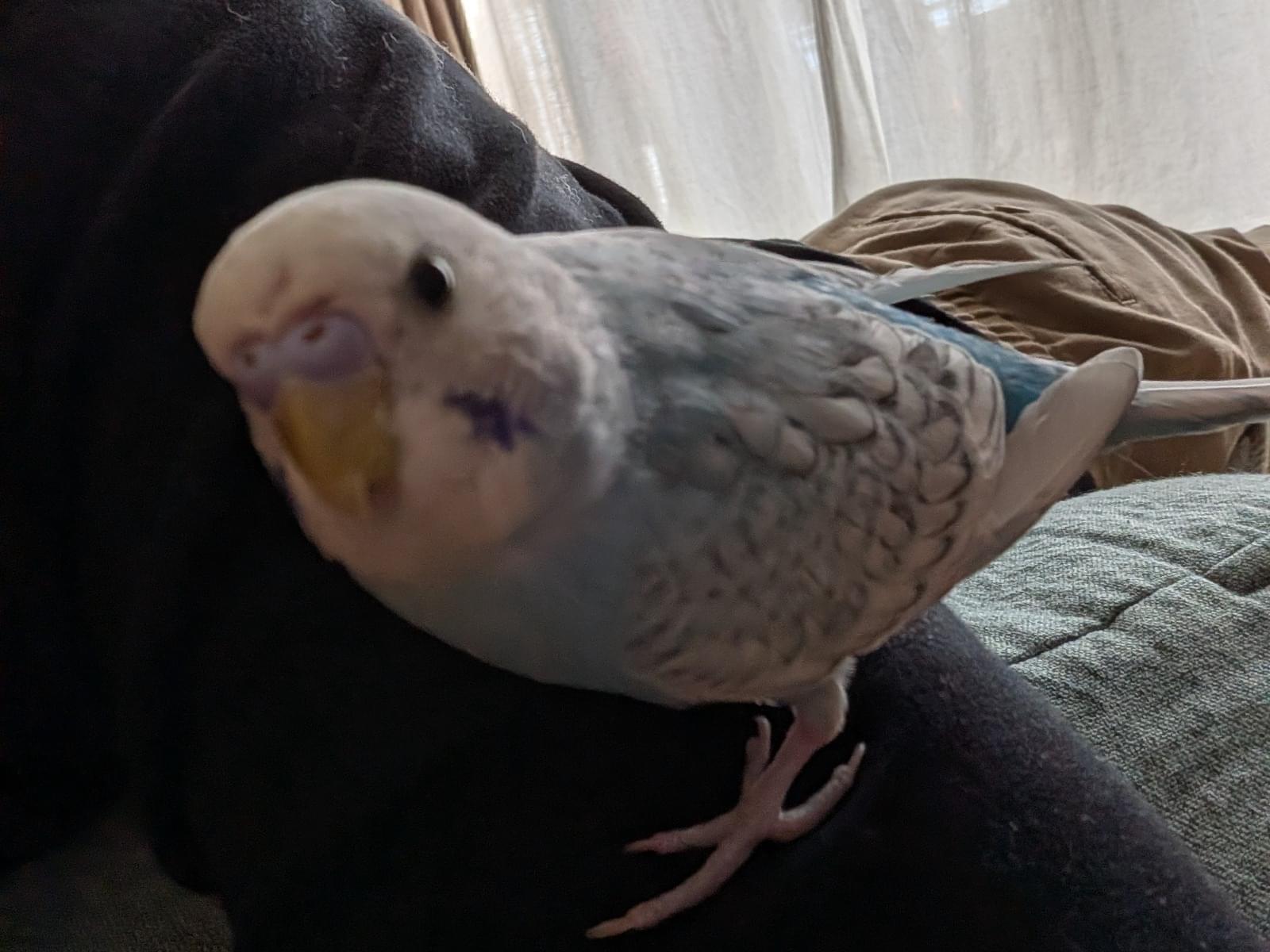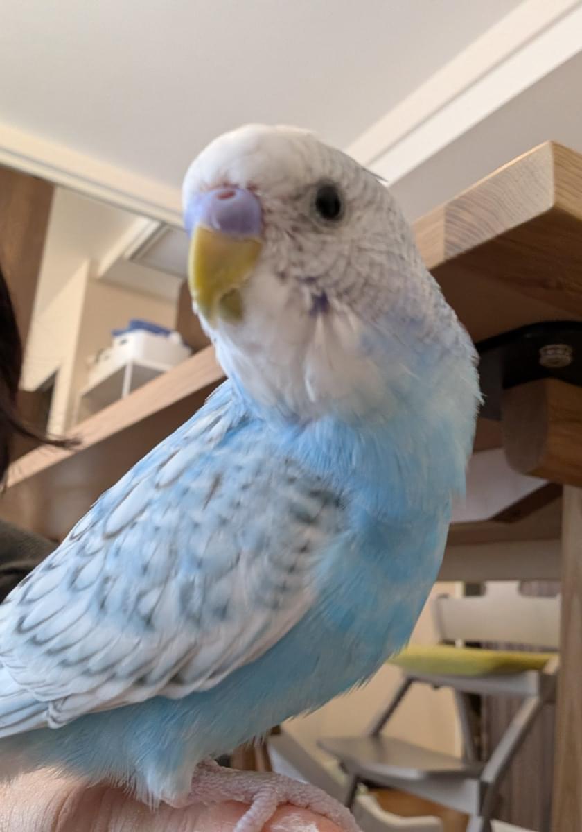 水色で羽根はグレーがかったセキセイインコ。